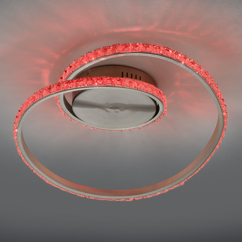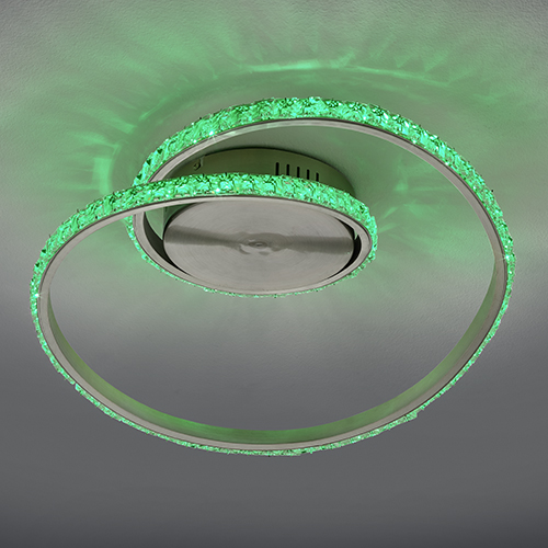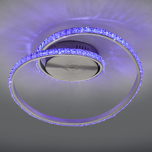 Le plafonnier RUBIN fera entrer la couleur de votre intérieur ! Grâce au système de changement de couleur RGBW intégré, il est possible de choisir un grand nombre de coloris à l'aide de la télécommande. De plus, le plafonnier dispose d'une fonction veilleuse et l'intensité lumineuse peut également être réglée en continu de sorte que vous pourrez adapter individuellement la lumière en fonction de l'ambiance souhaitée. Le design original à cristaux attirera tous les regards dans votre pièce de vie. Le plafonnier tendance a une largeur de 45cm et une profondeur de 38 cm. La teinte chrome et la surface à cristaux créent un contraste stylé avec les différentes couleurs de lumière et apporte la touche finale à l'ensemble. La lampe dispose, en outre, de la technologie LED qui se caractérise par une luminosité de qualité et une excellente efficacité énergétique. Ceci permet d'économiser 80 % des coûts énergétiques par rapport aux ampoules halogènes habituelles. De plus, les sources lumineuses LED ont une durée de vie accrue, produisent moins de chaleur et participent à la protection de l'environnement.