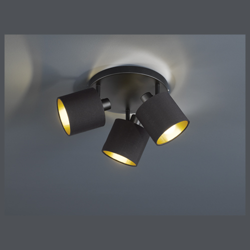 Les spots de la série TOMMY sont synonymes de lumière d'ambiance puisque les abat-jour en tissu augmentent le facteur bien-être et créent une atmosphère conviviale et cosy. De même, les formes claires soutiennent le style tendance tout en sobriété : ainsi les lampes peuvent s'utiliser de multiples façons et se combiner à l'envi. Le plafonnier 3 spots a un diamètre de 25 cm et peut être utilisé pour éclairer de petites pièces. Les têtes inclinables peuvent se régler facilement pour éclairer et mettre en valeur différents endroits d'une pièce. La lampe est fabriquée en métal noir mat et complétée par trois abat-jour en tissu dans les tons tendance noir et or. Cette combinaison crée des accents lumineux modernes et stylés et conférera à vos pièces un effet bien-être appréciable. Pour profiter d'une lampe économe en énergie, il est recommandé d'utiliser une ampoule LED. Ce type d'ampoules est une alternative idéale aux ampoules halogènes puisqu'elles diffusent une lumière de qualité tout en réalisant jusqu'à 80 % d'économie d'énergie. De plus, les ampoules LED disposent d'une durée de vie accrue pour une production de chaleur moindre et favorisent la protection de l'environnement.