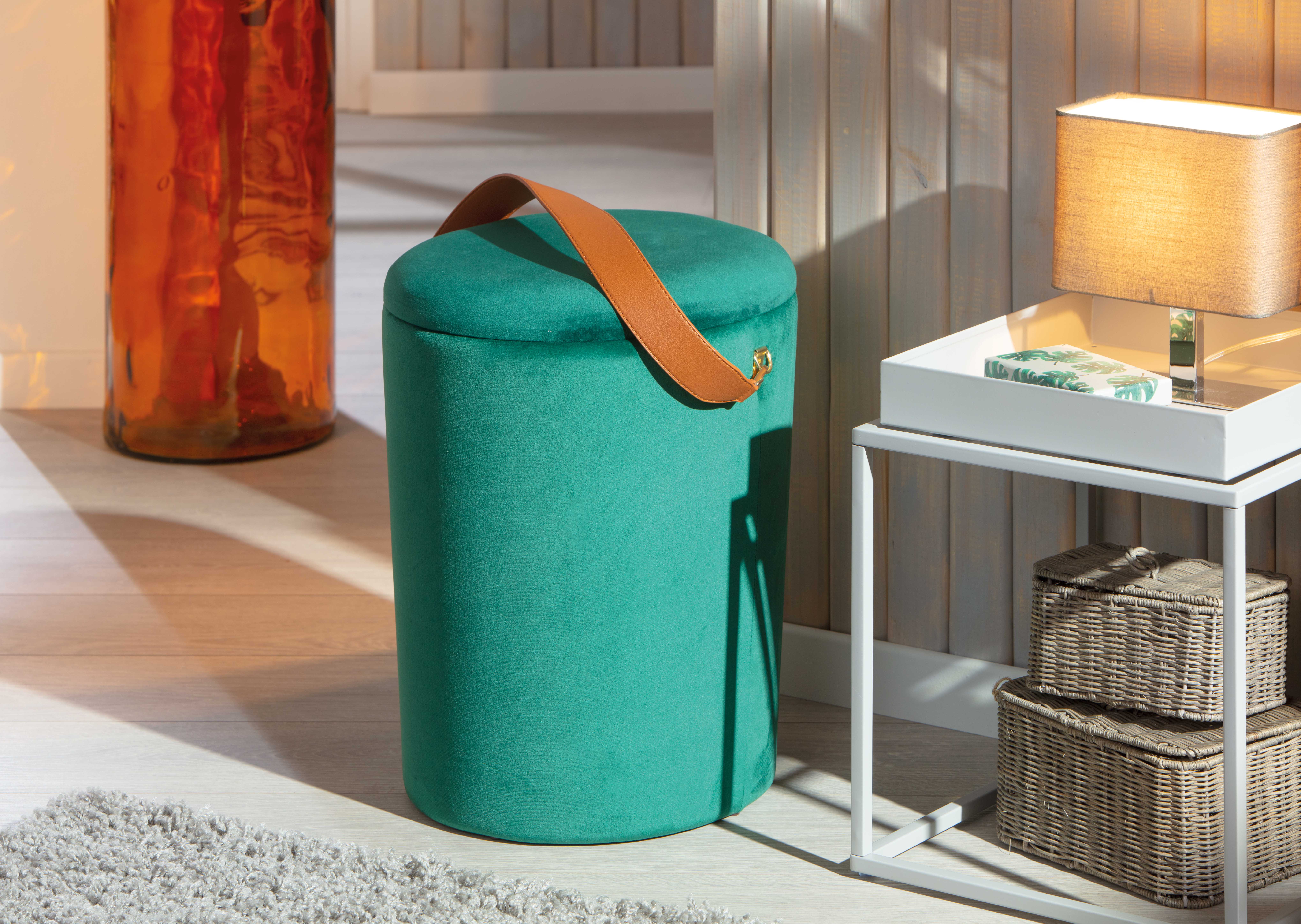 Il est parfait comme siège d’appoint ou pour prolonger un canapé dans un salon, mais peut également être installé dans l’entrée, le dressing ou même la chambre à coucher. Le couvercle amovible offre un espace de rangement pratique pour y glisser facilement magazines, plaids, coussins, écharpes, gants, jouets et autres accessoires. Le pouf est peu encombrant et léger, et se transporte aisément grâce à sa sangle couleur camel.