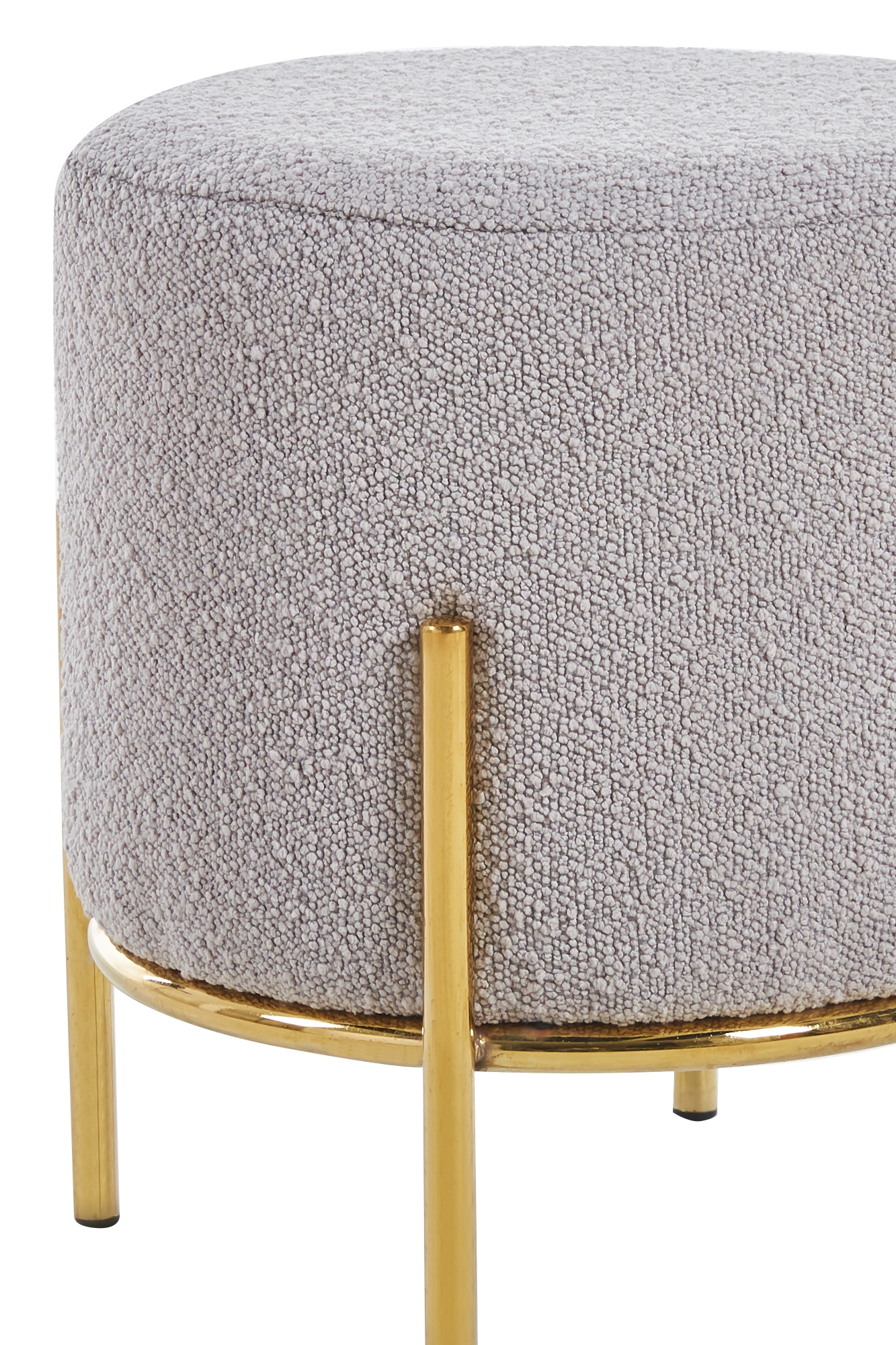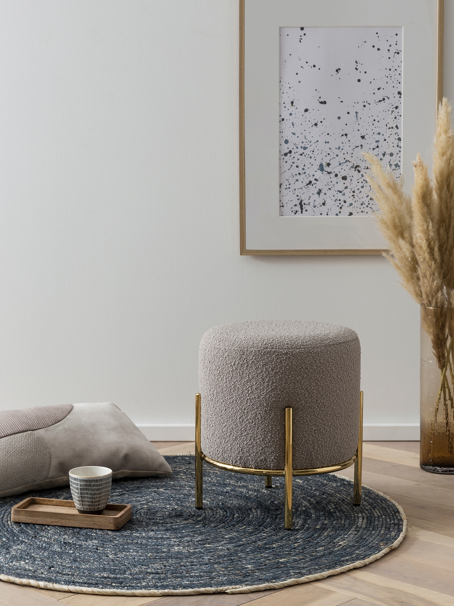 Quand des invités surprises s’annoncent, un siège supplémentaire est toujours bienvenu ! Et si, en plus, ils est stylé et peu encombrant, il deviendra rapidement le compagnon design idéal pour le canapé et le coin salon. Le pouf en tissu bouclette avec son assise d'un diamètre de 35 cm offre justement cette combinaison associant aspect attrayant et côté pratique et fonctionnel. Car vous pourrez facilement y installer vos invités supplémentaires ou l’utiliser en guise de repose-pied. Le tissu bouclette, qui a fait depuis longtemps son apparition dans nos salons et salles à manger, exhale chaleur et convivialité pour une ambiance cosy. De plus, le tissu, dans son aspect laineux, incarne parfaitement l’essence du style scandinave à la popularité inégalée. Le piètement design à pieds hauts est fabriqué en métal doré et apporte la touche finale à l’ensemble.