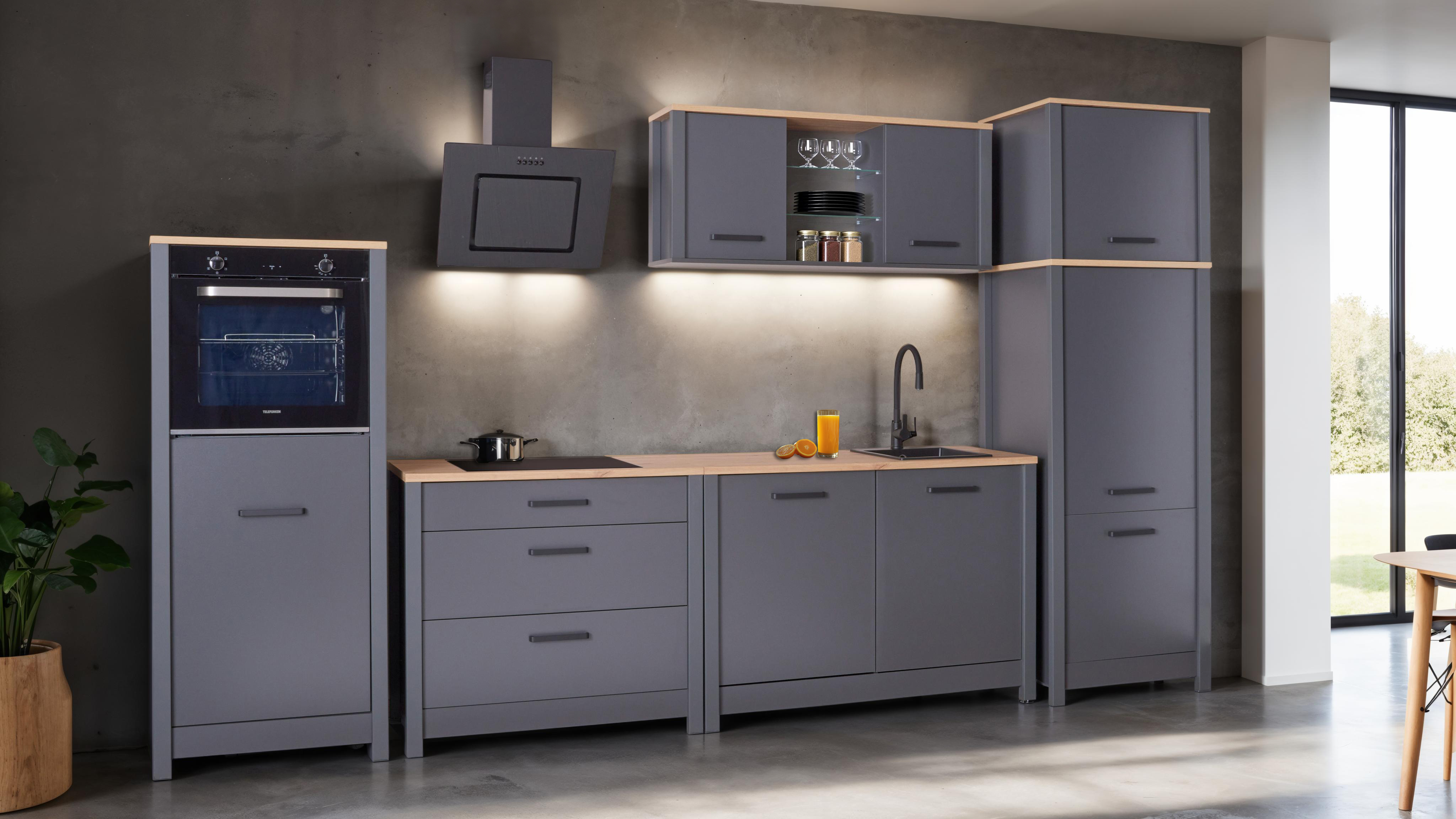Façade et caisson : panneaux de particules MDF (panneau de fibres de bois de densité moyenne) ton anthracite