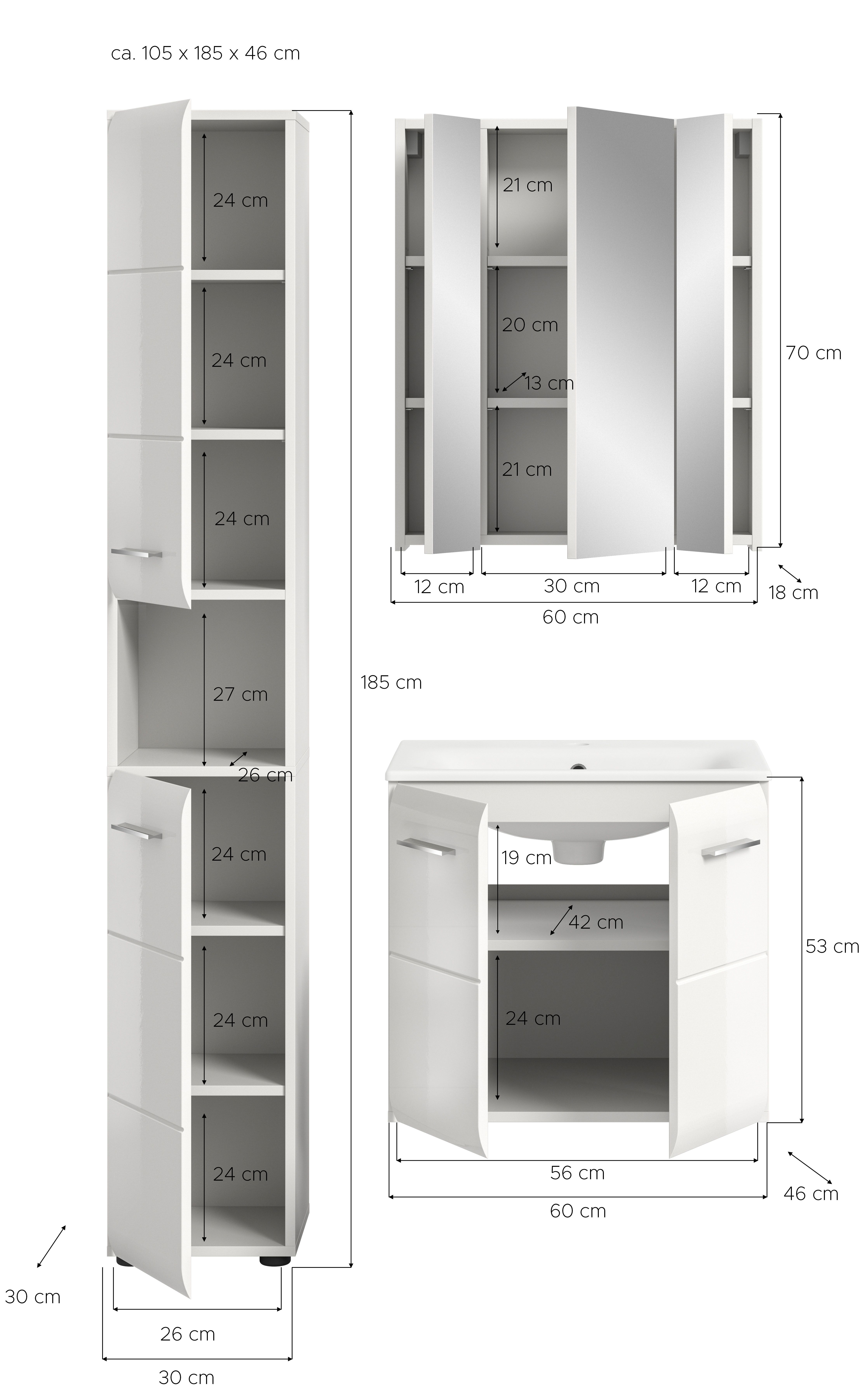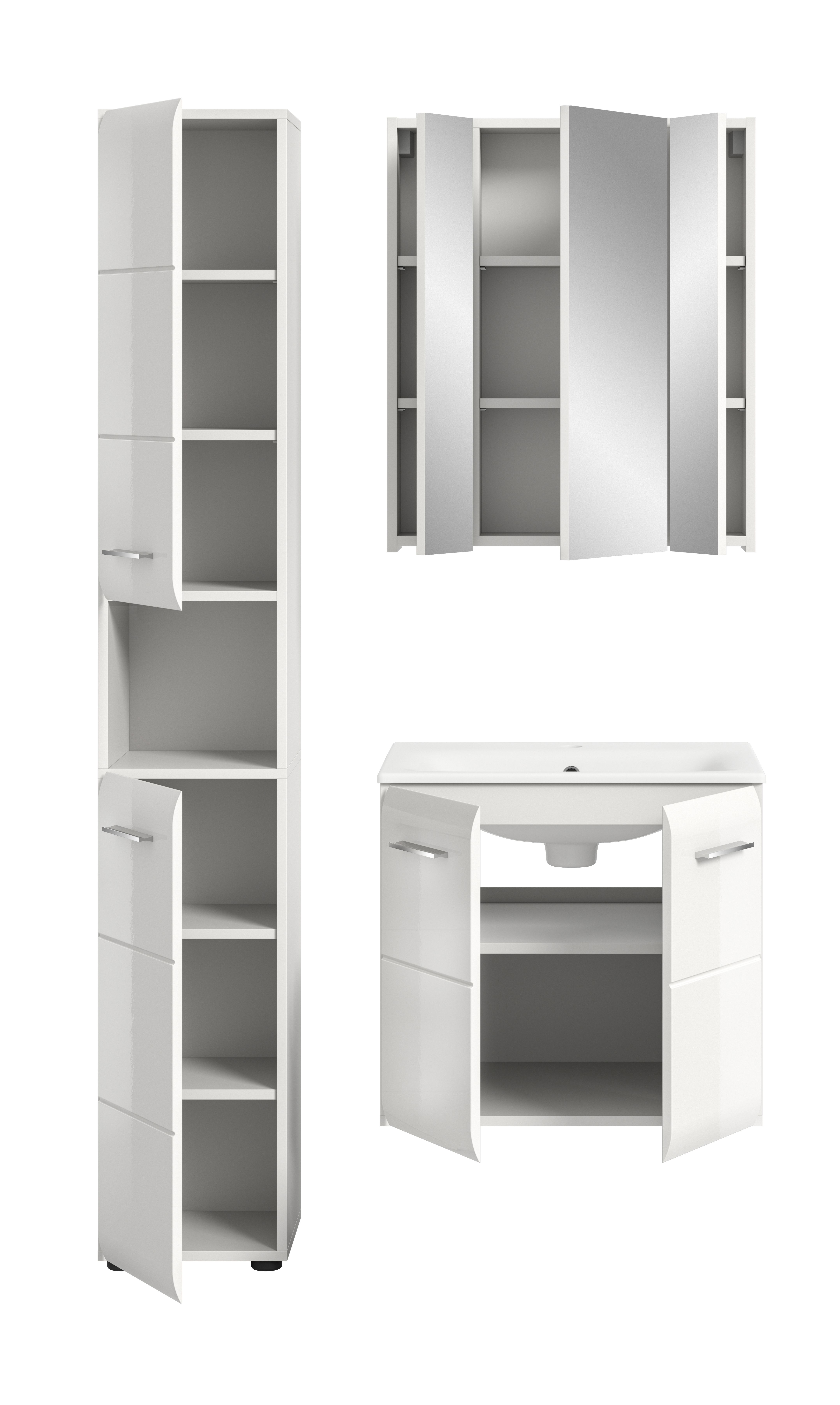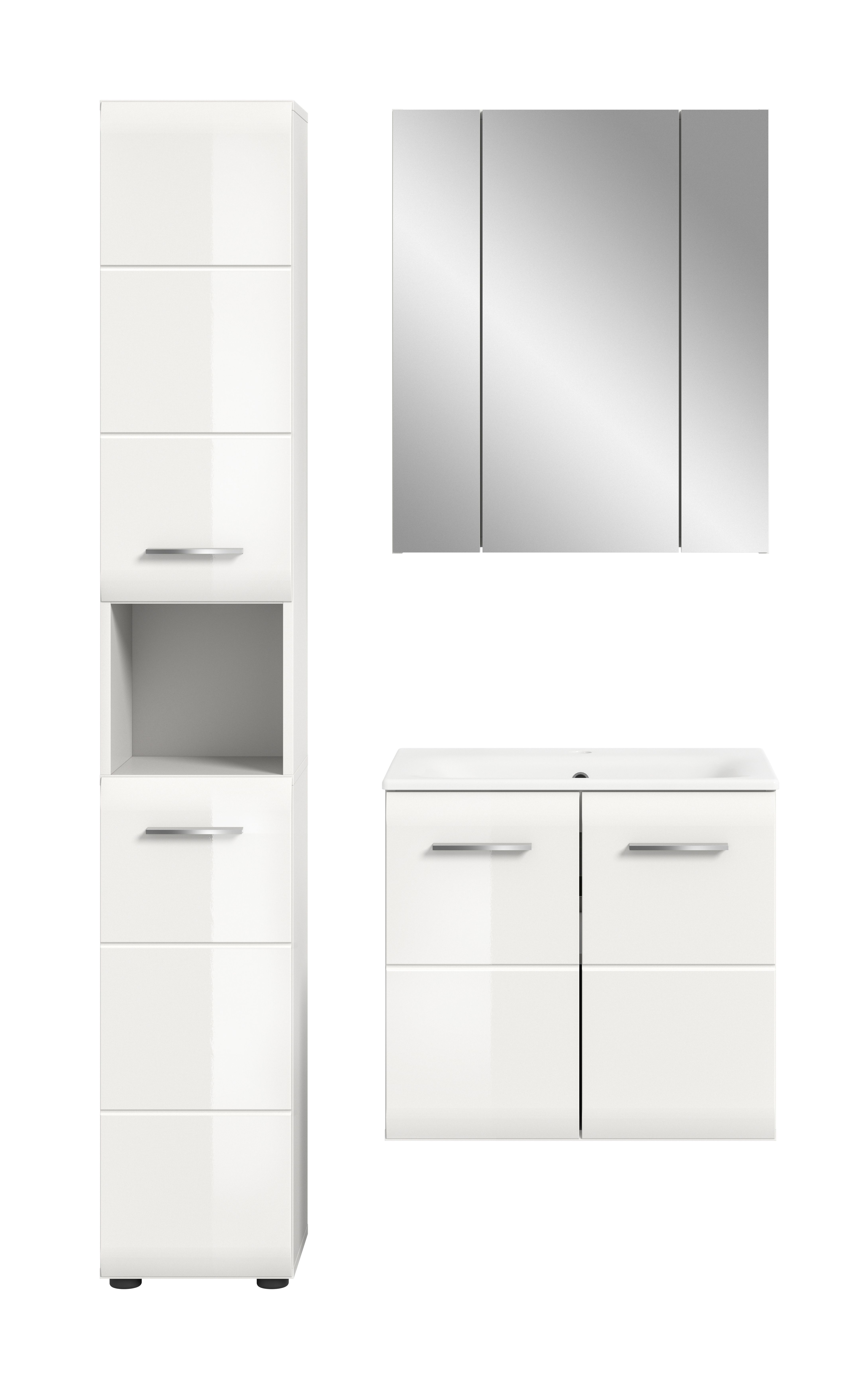- Fonctionnalité : ensemble comprenant un meuble sous vasque avec vasque intégrée, une armoire de toilette et un meuble colonne pour un rangement sur un faible encombrement dans la salle de bains.