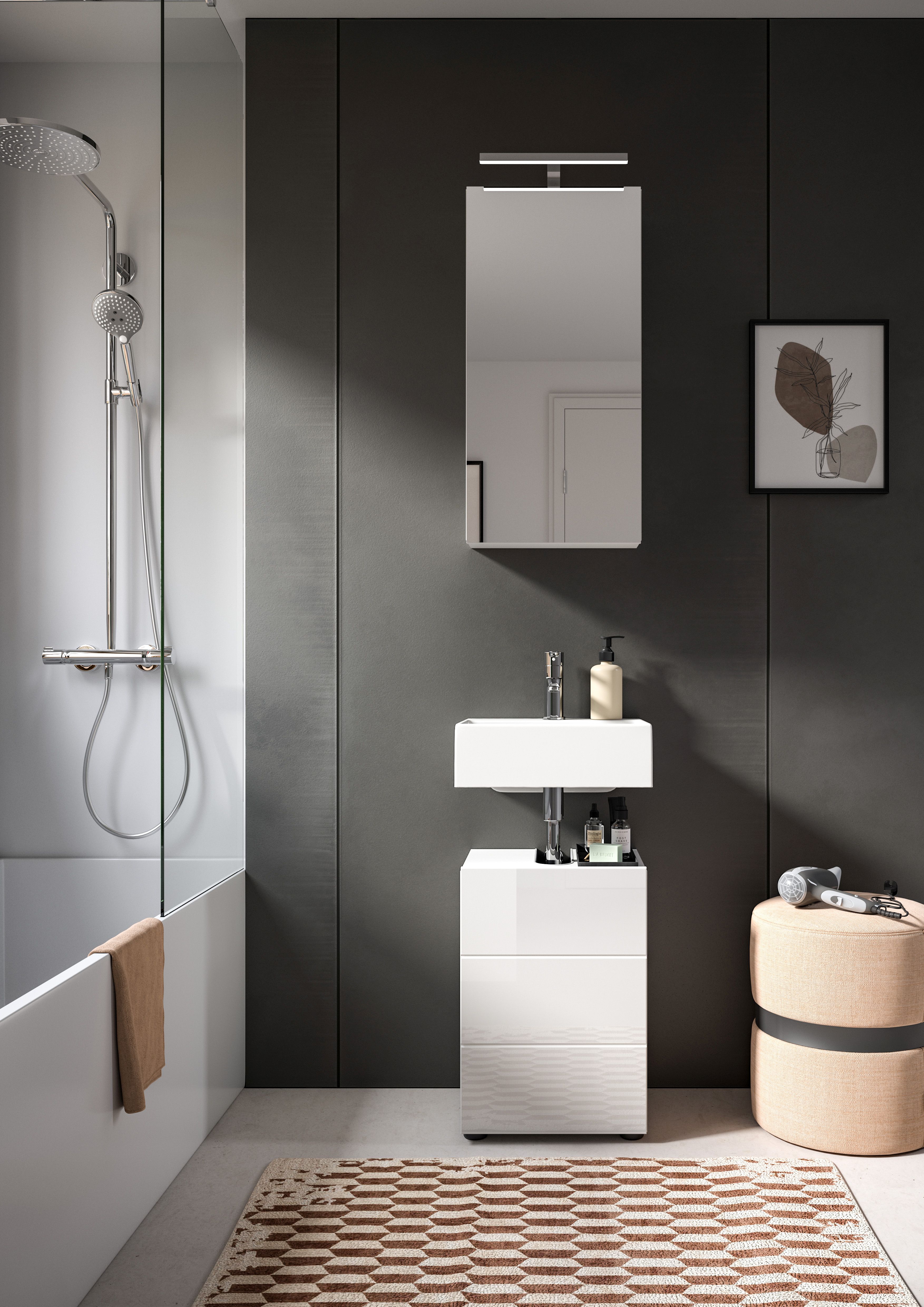 - Fonctionnalité : l’ensemble de salle de bains offre un espace de rangement pratique pour différents accessoires de bain ainsi que les serviettes. Avec son meuble sous lavabo et son armoire de toilette, cet ensemble offre des possibilités de rangement variées tandis que la finition aspect ultra brillant garantit un nettoyage aisé.