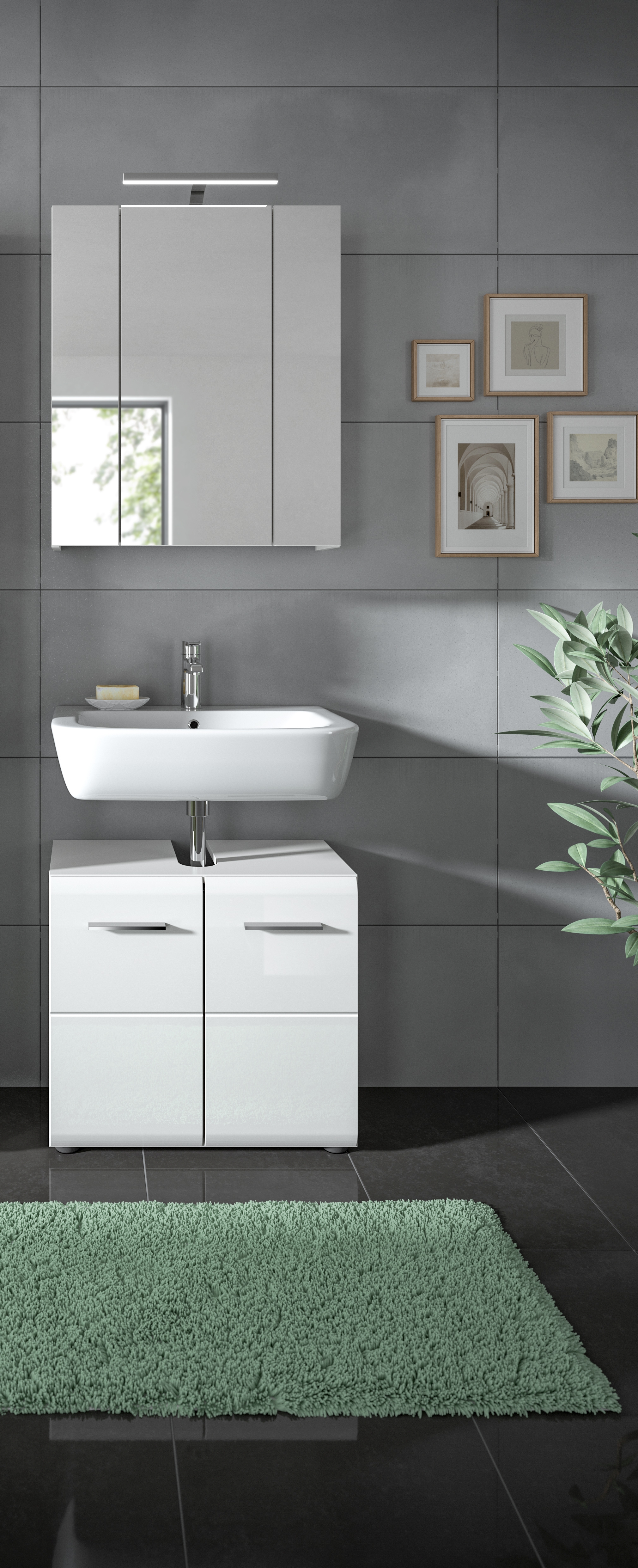 - Fonctionnalité : ensemble constitué d’un meuble sous lavabo et d’une armoire de toilette pour une solution de rangement complète sur un faible encombrement dans la salle de bains.