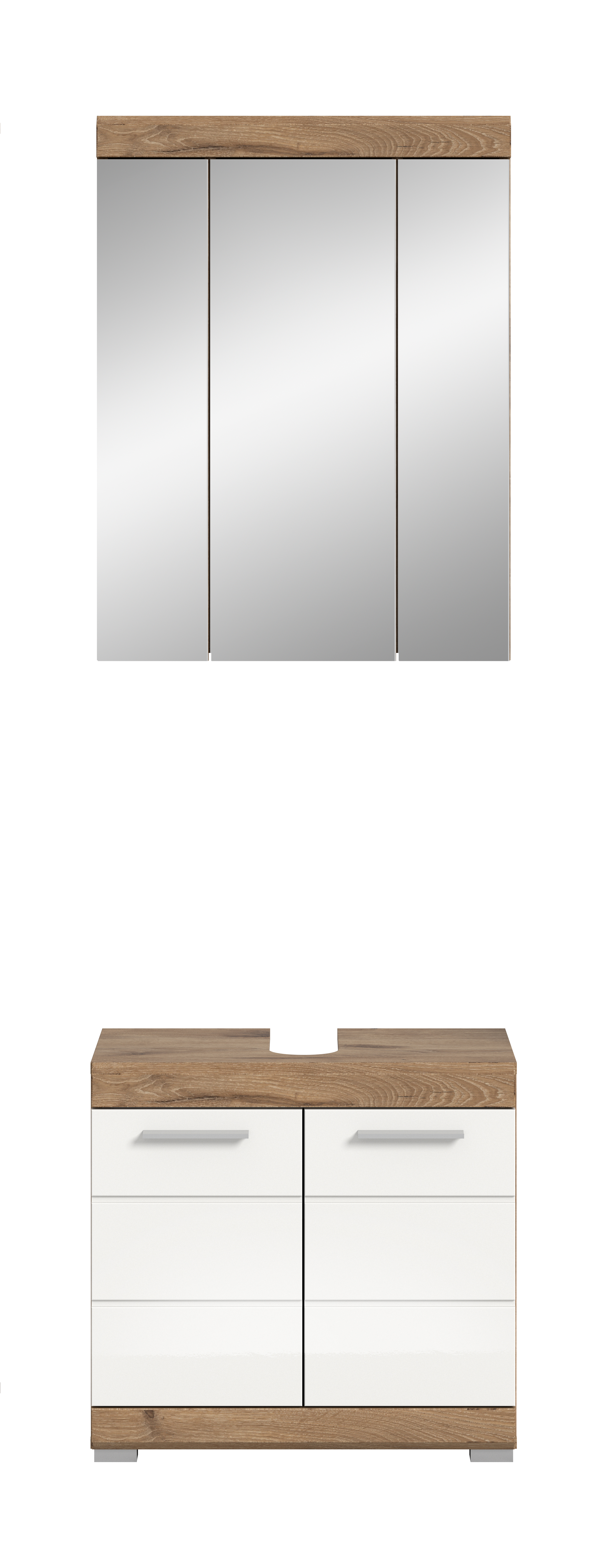 Cette élégante salle de bains combinée associe design moderne et fonctionnalité. Elle constitue une solution gain de place idéale pour les petites salles de bains, sans devoir renoncer à l’espace de rangement. L’association raffinée de façades ton blanc ultra brillant et décor chêne Nox confère à la pièce une ambiance contemporaine et accueillante. L’ensemble salle de bains comprend deux portes classiques et trois portes miroir, offrant un espace de rangement optimal pour vos accessoires et une surface miroir pratique au quotidien.