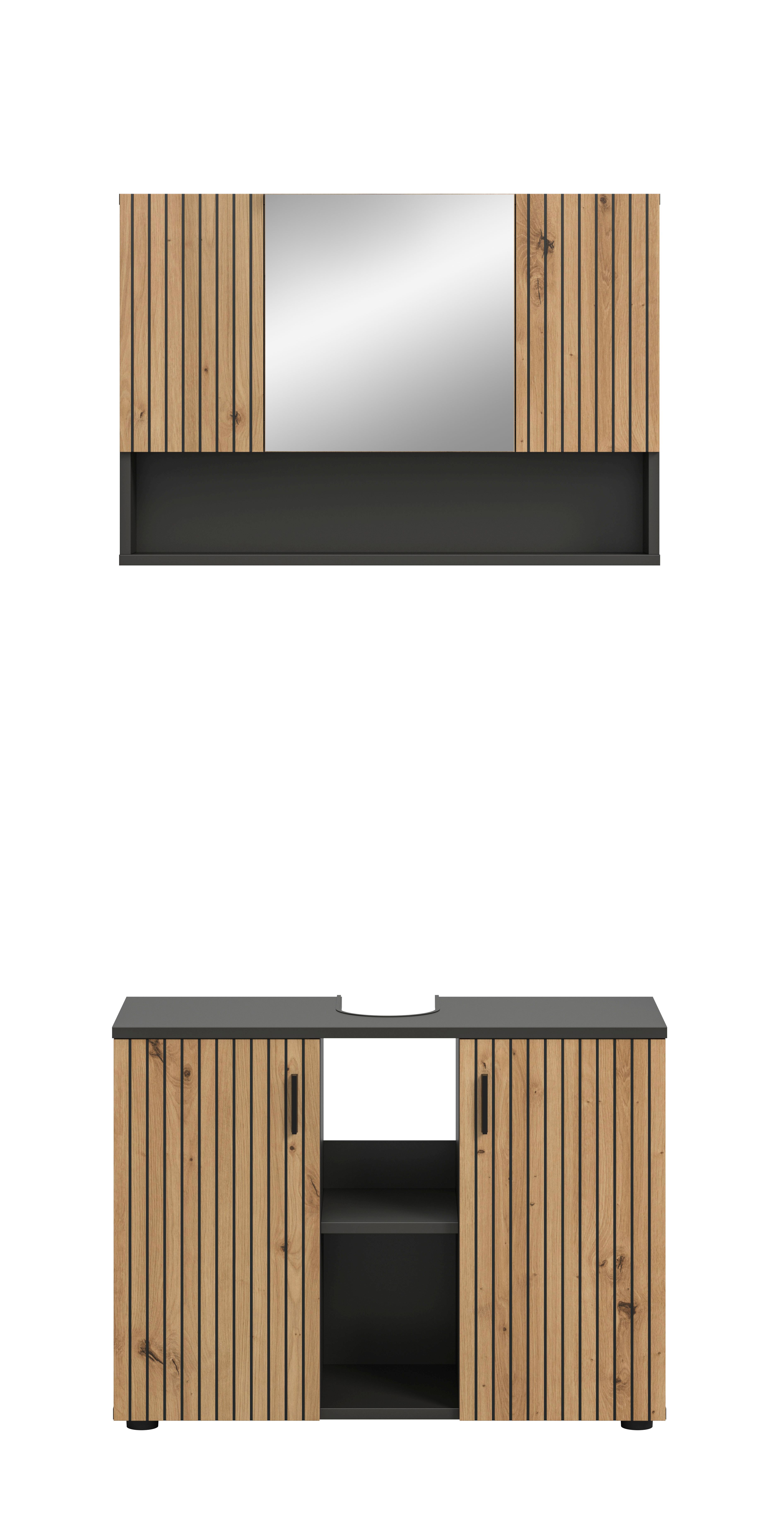 Cet ensemble 2 éléments compact en décor basalte et chêne Artisan (80x180x30 cm) se compose d’un meuble sous lavabo et d’une armoire de toilette. La façade soigneusement travaillée avec finition rainurée, facile d’entretien, confèrera à votre salle de bains une allure stylée et élégante. Cet ensemble est idéal pour les petites salles de bains ne souhaitant faire aucune concession sur le rangement et le style. Les meubles offrent un espace suffisant pour vos produits de soin et permettent de garder votre pièce bien ordonnée. Grâce aux nombreuses possibilités d’association entre les meubles de la série, vous pourrez personnaliser l’aménagement de votre salle de bains pour l’utiliser de façon optimale. Cet ensemble associe fonctionnalité, qualité et design dans un format compact.