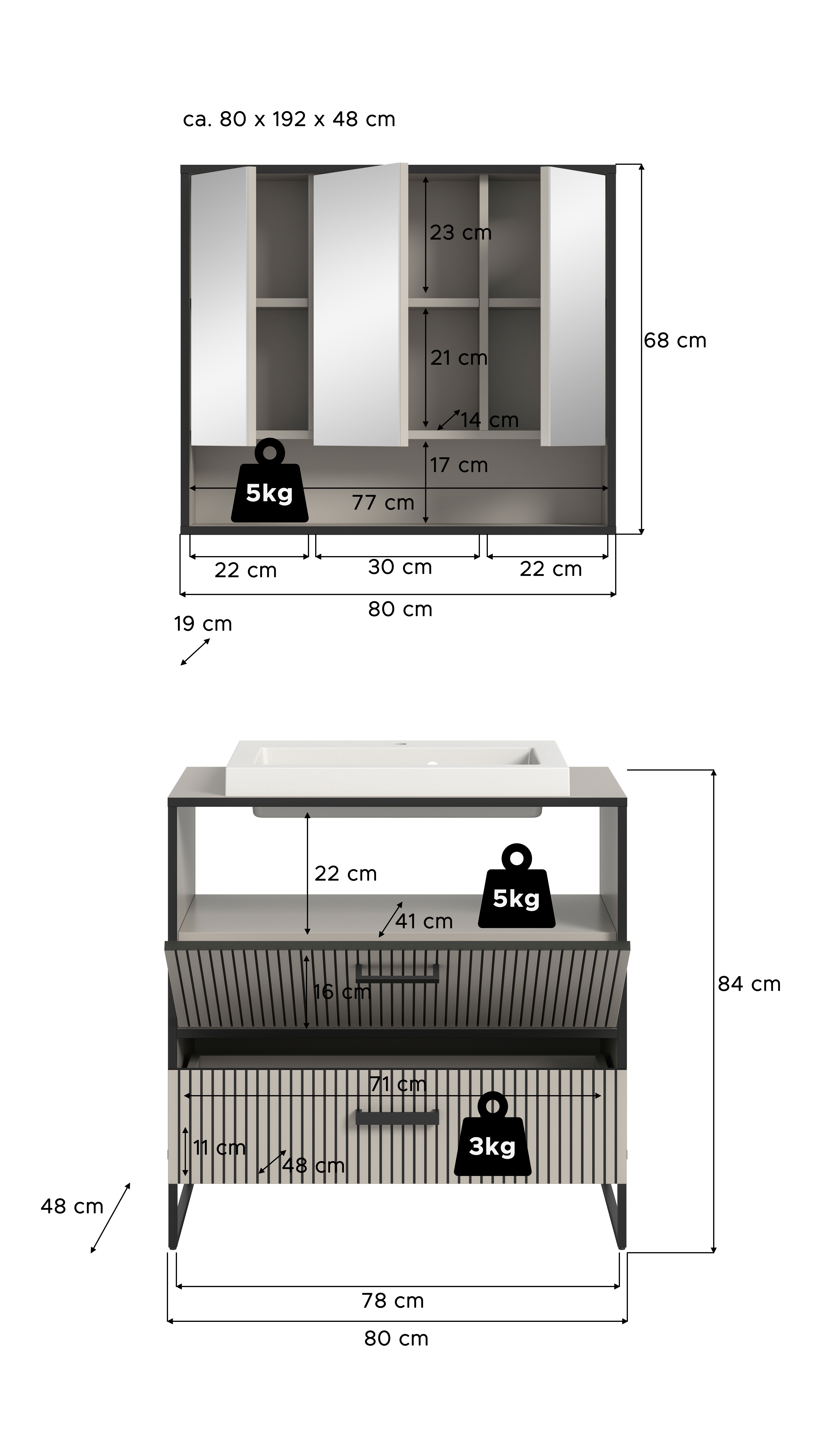 | Meuble sous vasque avec vasque | 80 | 84 | 48 |