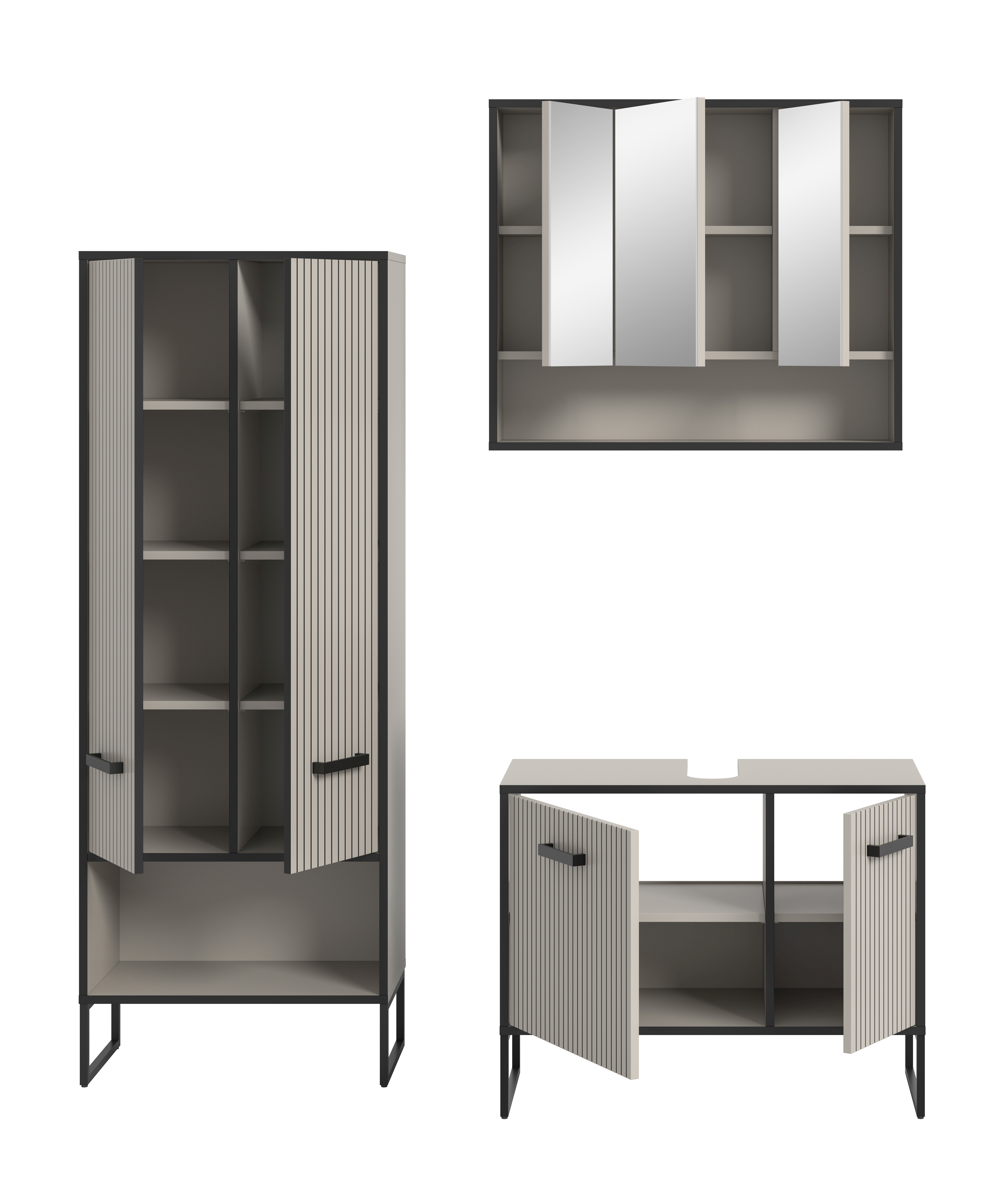 Misez sur l’élégance avec cet ensemble salle de bains 3 éléments (L/H/P : 154x192x36 cm) en décor ton cachemire. Cette salle de bains combinée comprend un meuble colonne, un meuble sous lavabo et une armoire de toilette pratique. Tous ces éléments sont dotés d’une surface dans une finition soignée, facile d’entretien. Le design à rainures conférera charme et élégance à votre salle de bains. Un modèle idéal si vous souhaitez associer style et fonctionnalité.
