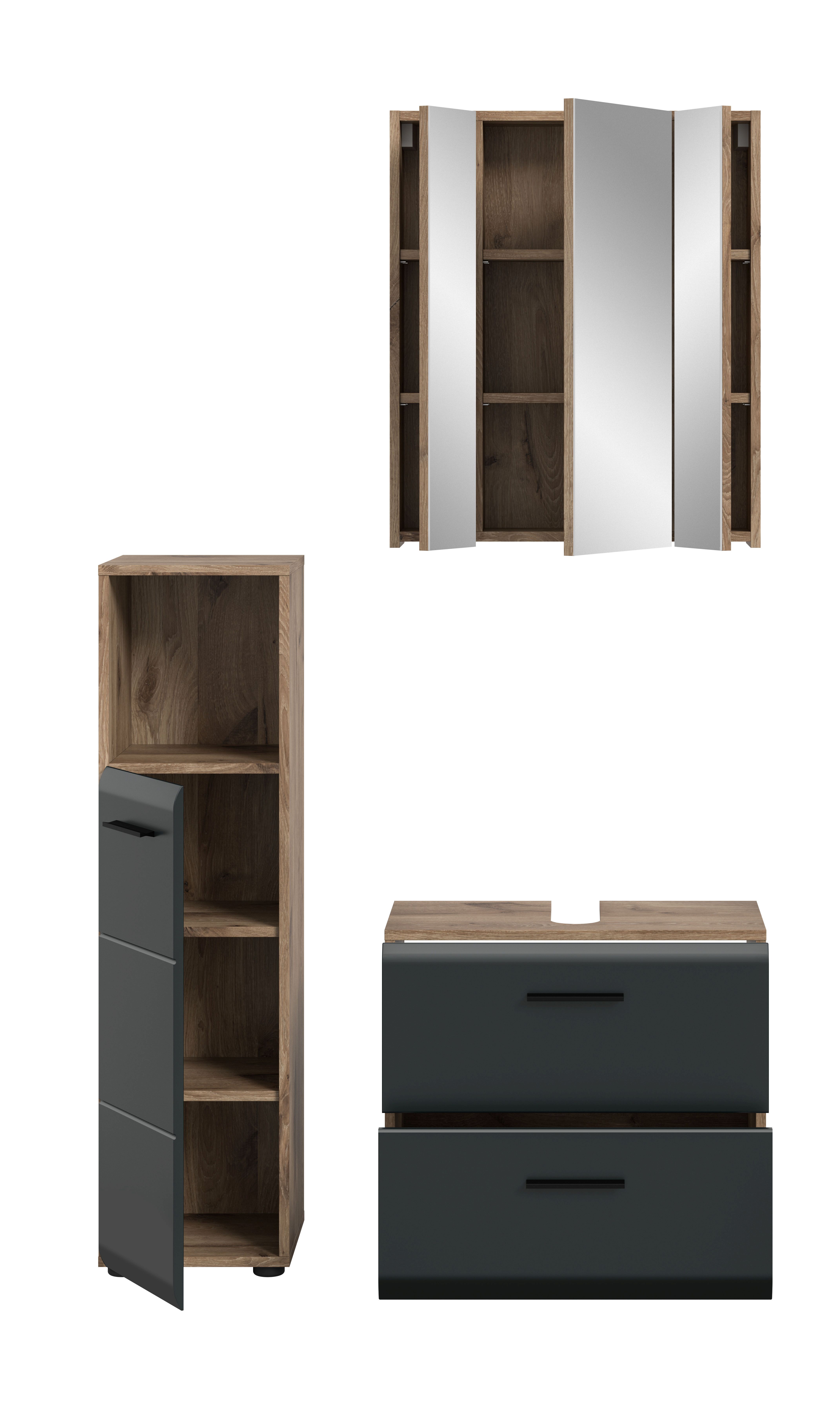 - Fonctionnalité : ensemble constitué d’un meuble sous lavabo, d’une armoire de toilette et d’un meuble demi-colonne pour une solution de rangement sur un faible encombrement dans la salle de bains.