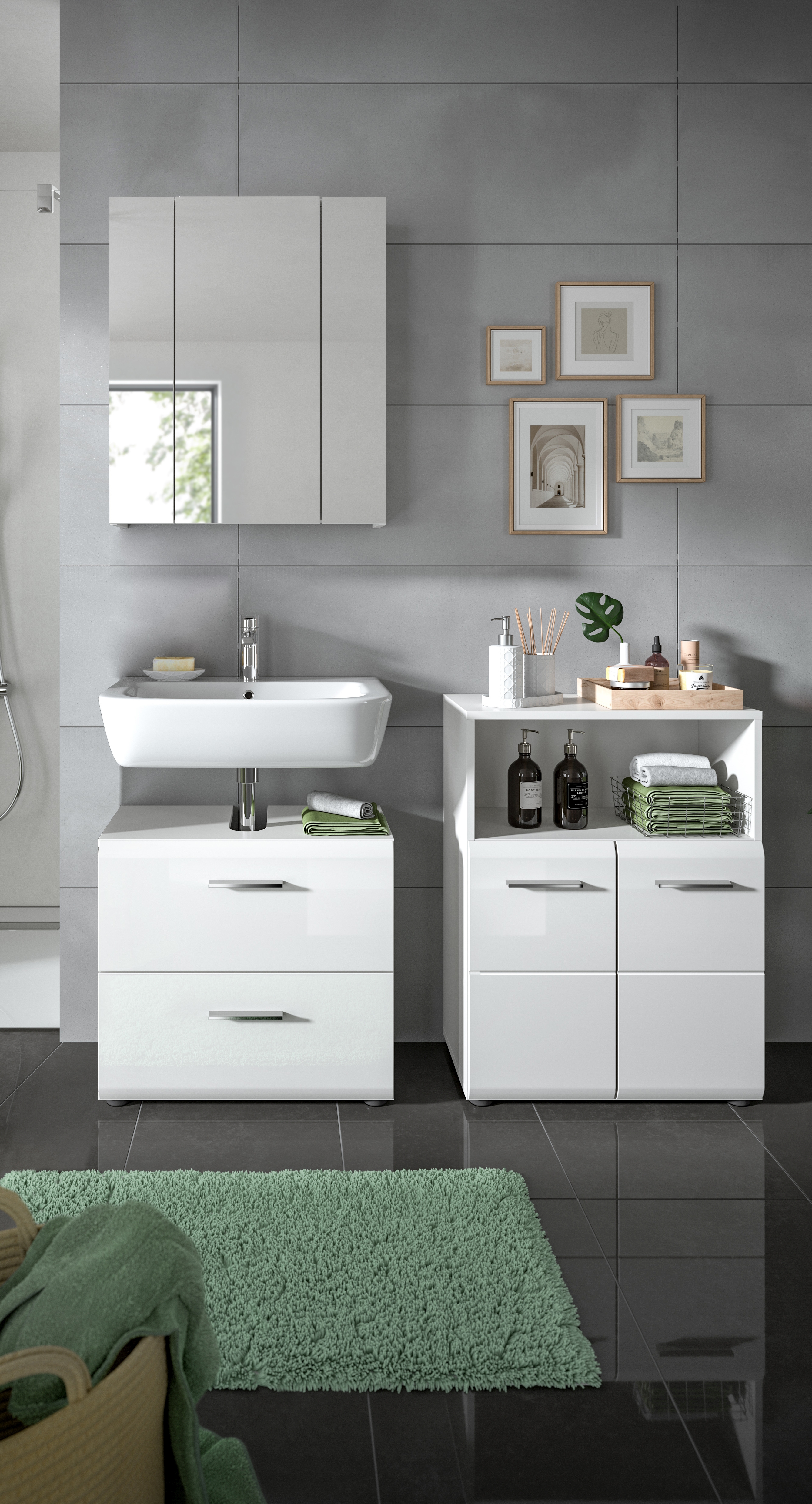 1 meuble de salle de bains avec 1 casier ouvert, 2 portes et 1 tablette amovible