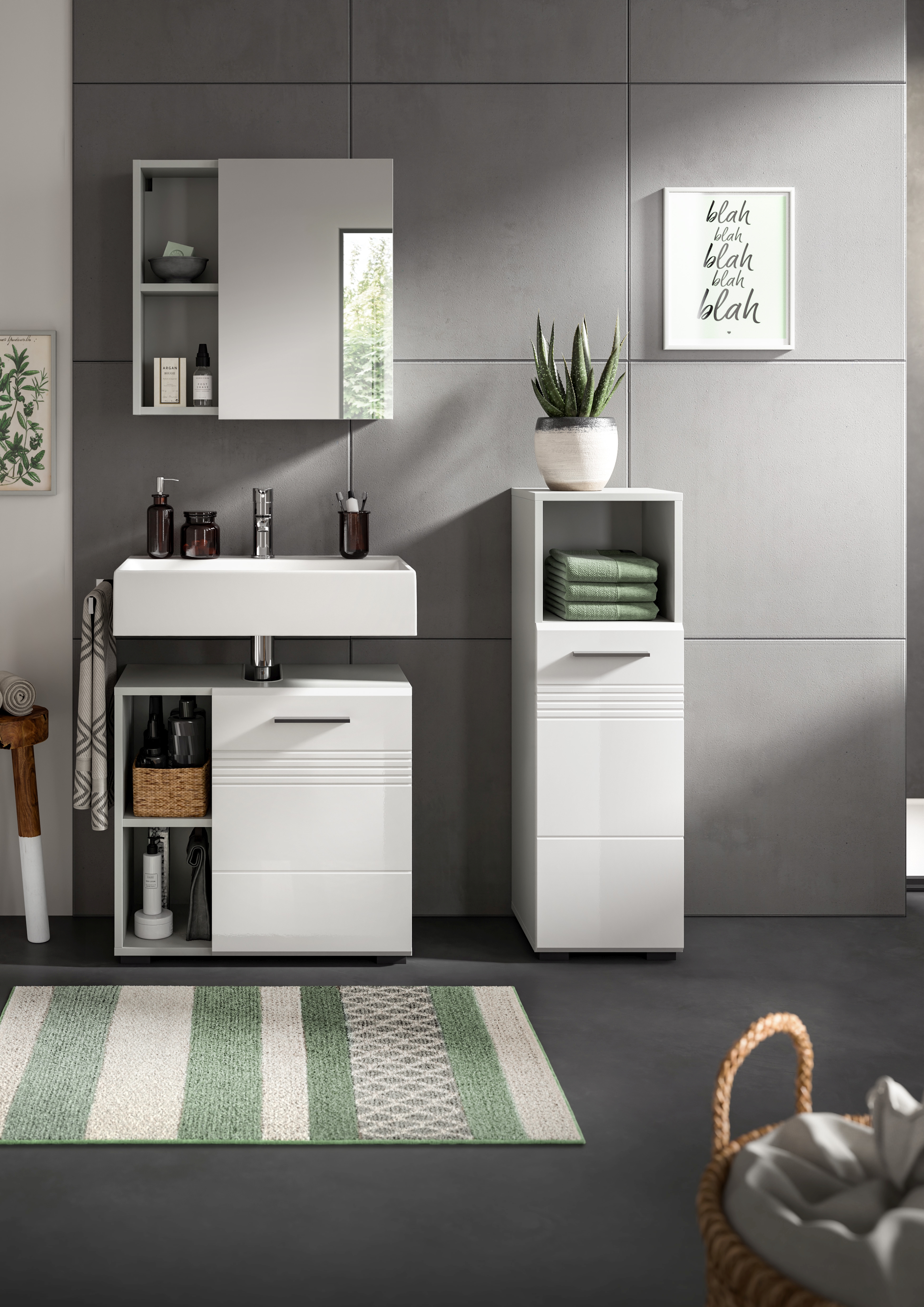 1 meuble sous vasque avec 1 porte, 1 tablette amovible et 2 casiers ouverts