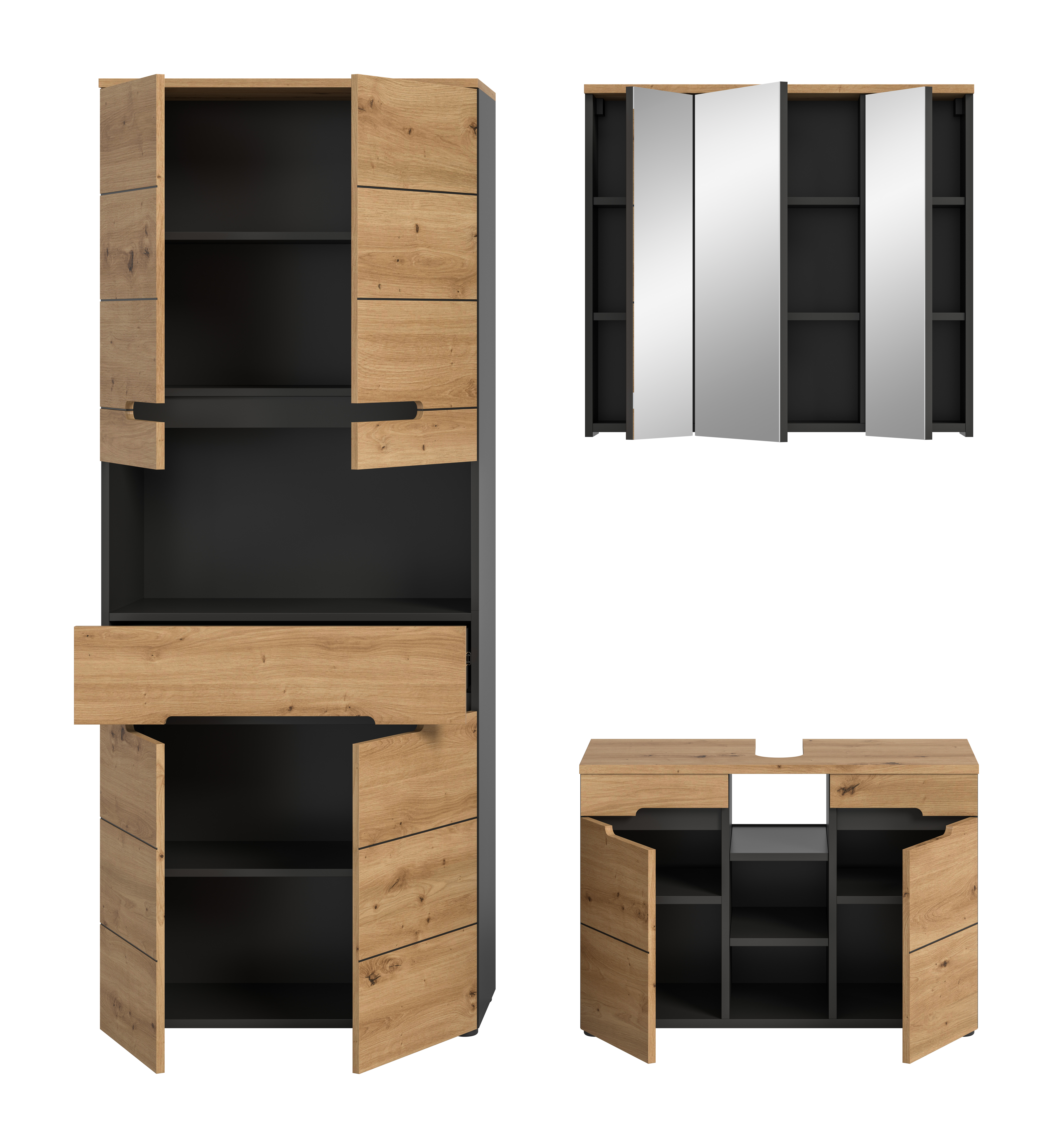 Notre ensemble combiné est le choix idéal pour les salles de bains modernes qui allient fonctionnalité et esthétique. L’association du décor ton gris basalte et du décor chêne Artisan aspect bois naturel avec des accents noirs confère à l’ensemble une allure élégante et intemporelle. Tous les éléments, du meuble colonne au meuble sous lavabo, sont parfaitement coordonnés visuellement, créant une apparence harmonieuse et uniforme. Les meubles offrent des solutions de rangement polyvalentes, à la fois pratiques et peu encombrantes.