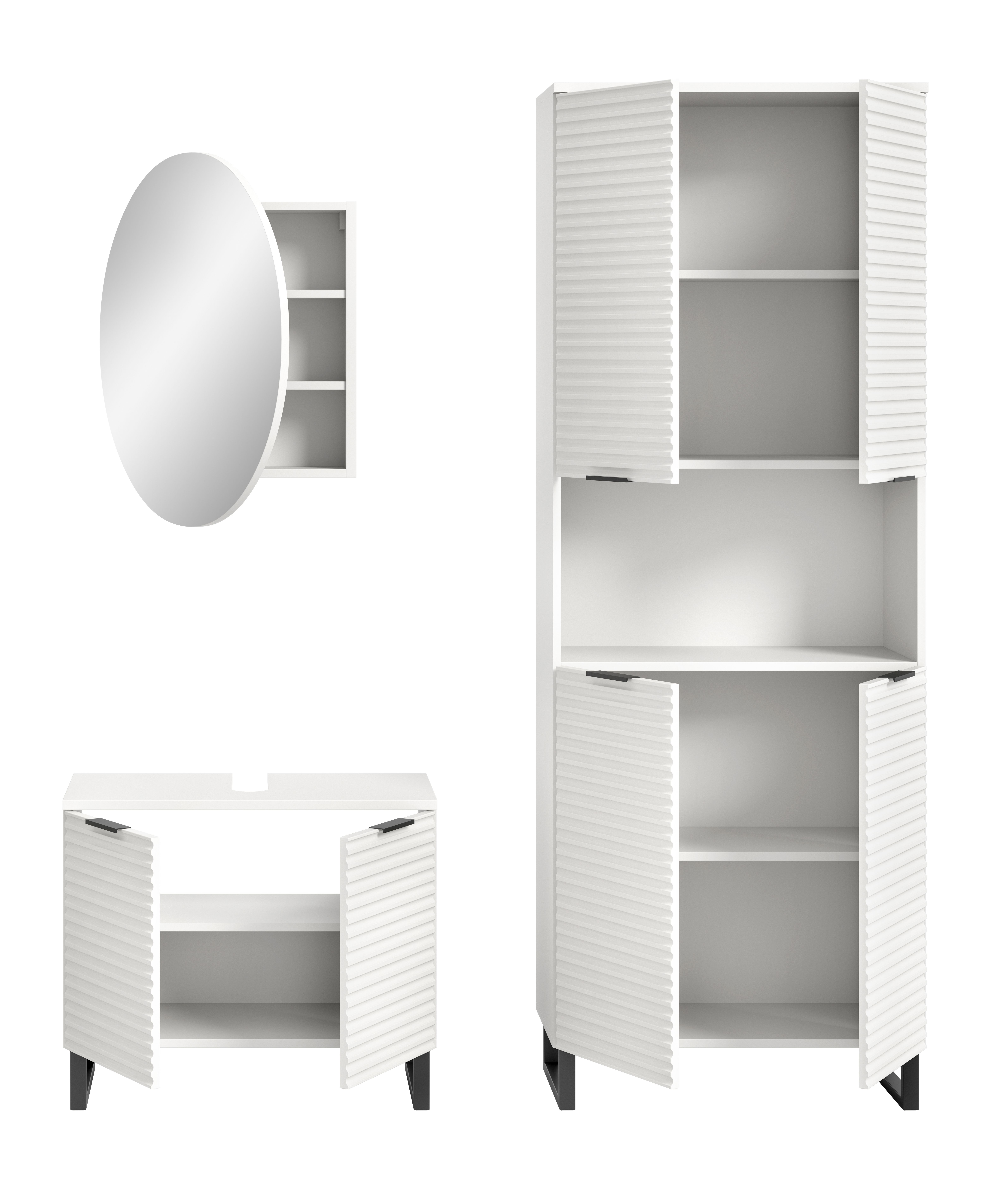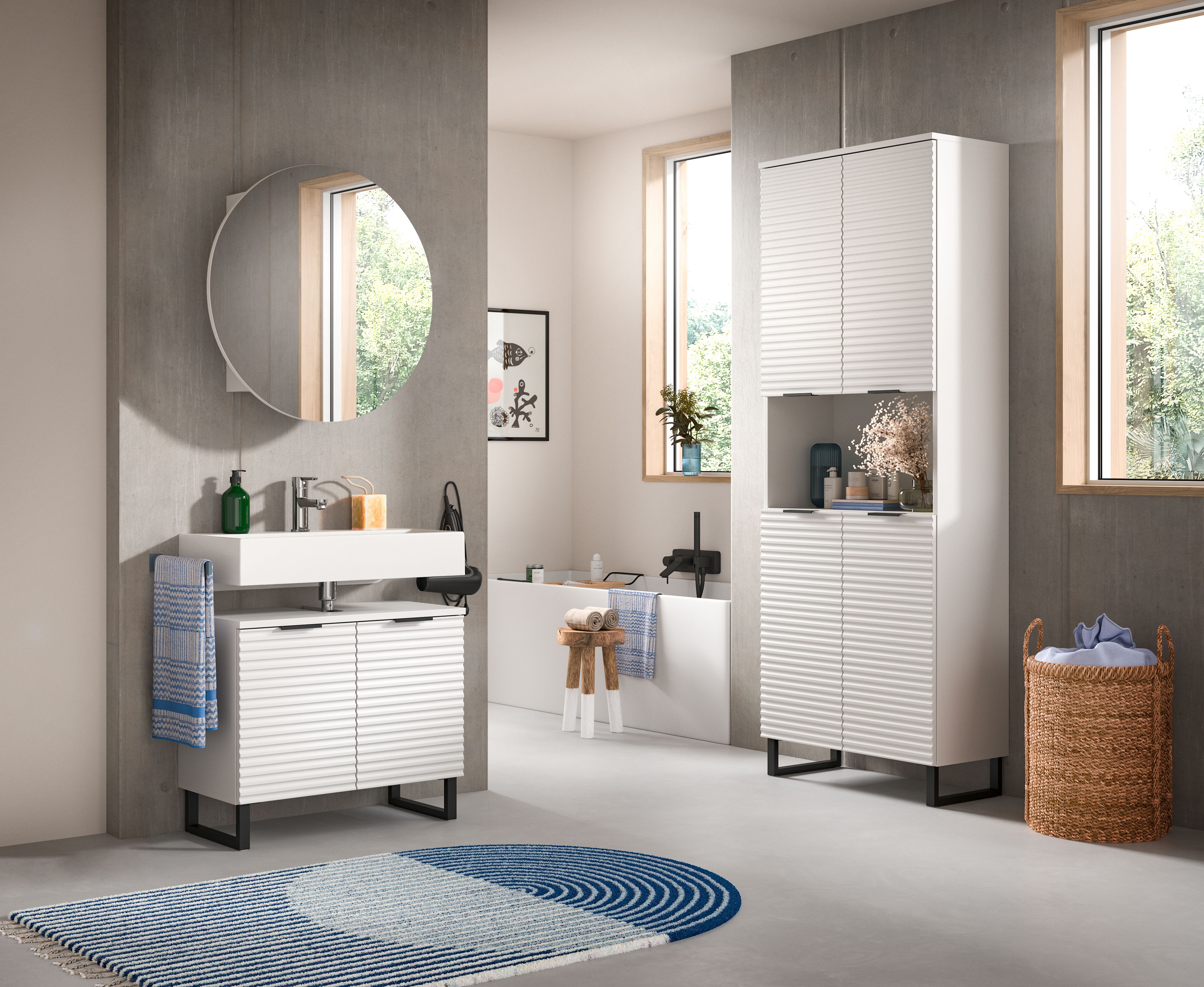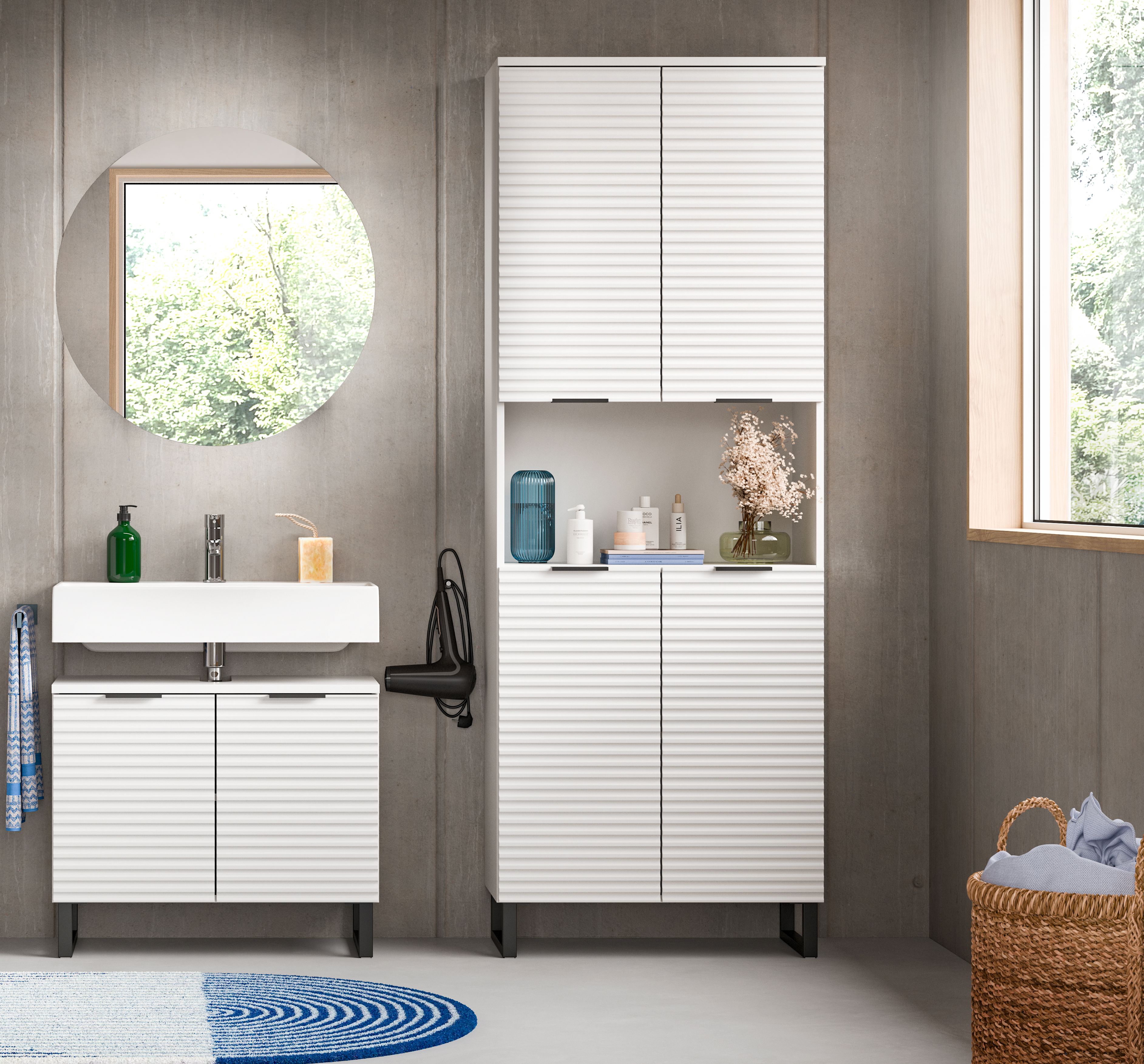 1 colonne de salle de bains avec 4 portes, 2 tablettes amovibles, 2 tablettes fixes et 1 casier ouvert