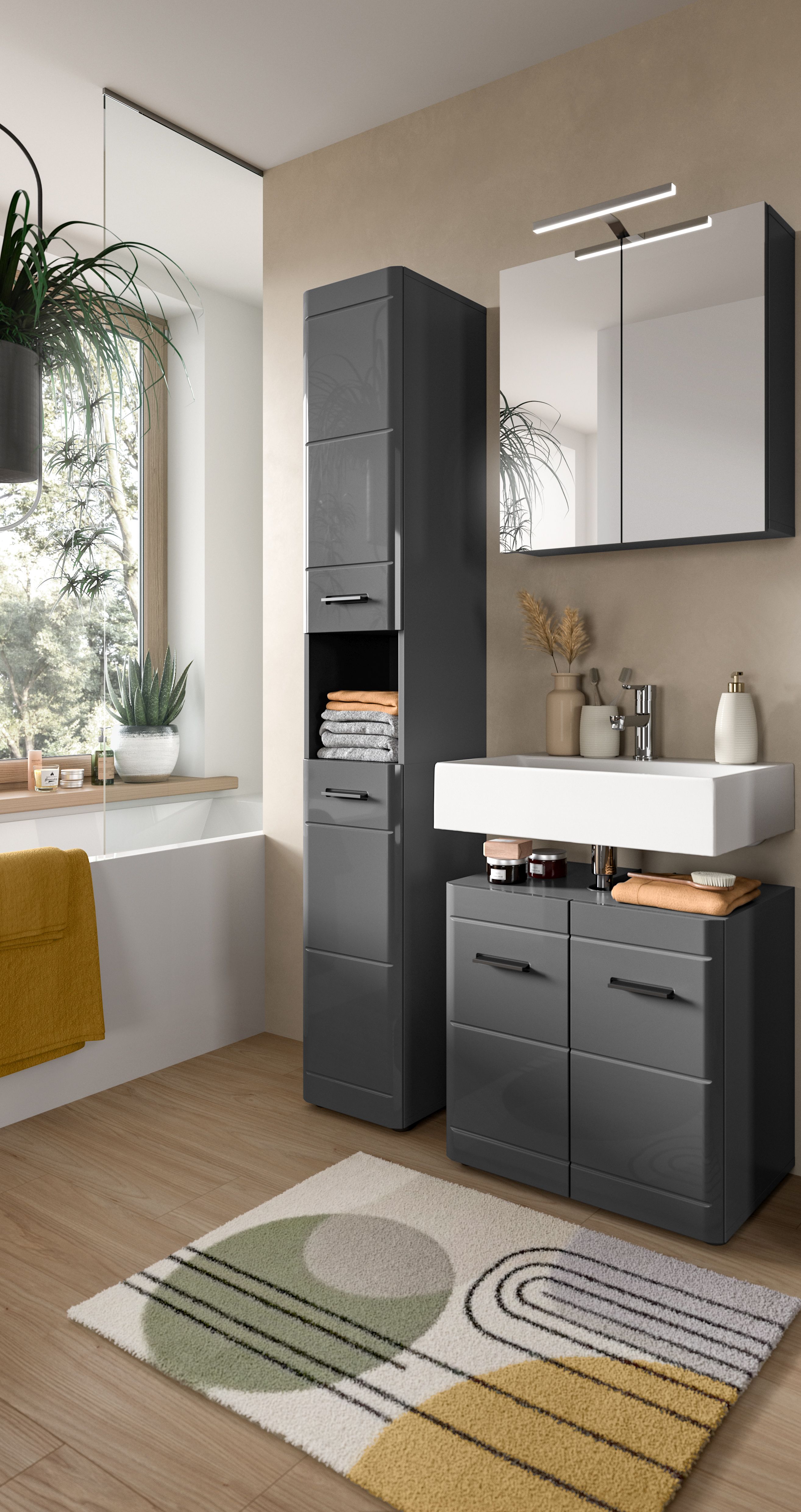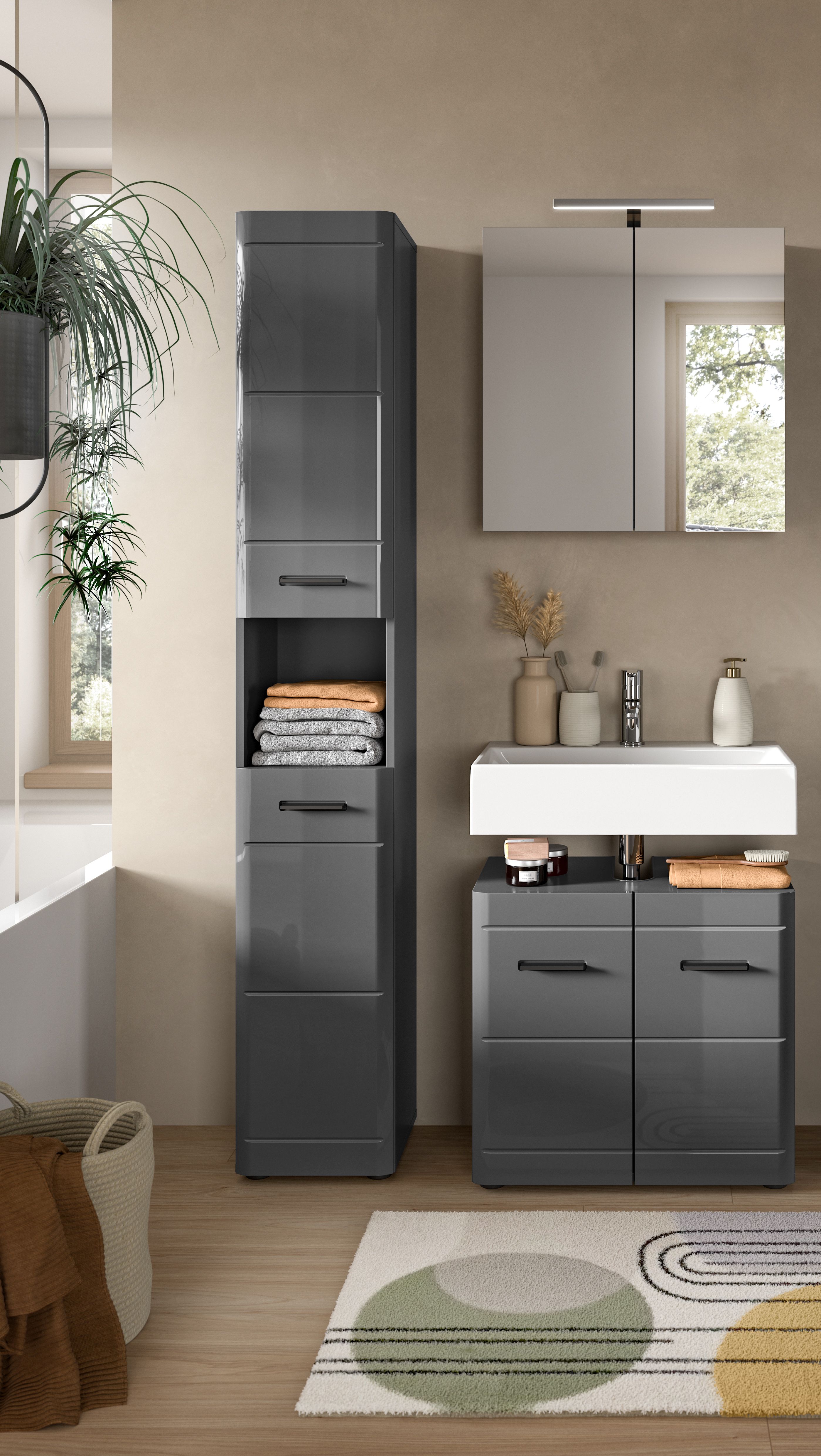 • Fonctionnalité : avec un vaste espace de rangement derrière les portes et sur le panneau supérieur du meuble sous lavabo, cette salle de bains combinée offre une solution pratique pour ranger serviettes, produits de soin et autres accessoires. Elle habille également le point d'eau et contribue à une organisation optimale de la pièce.