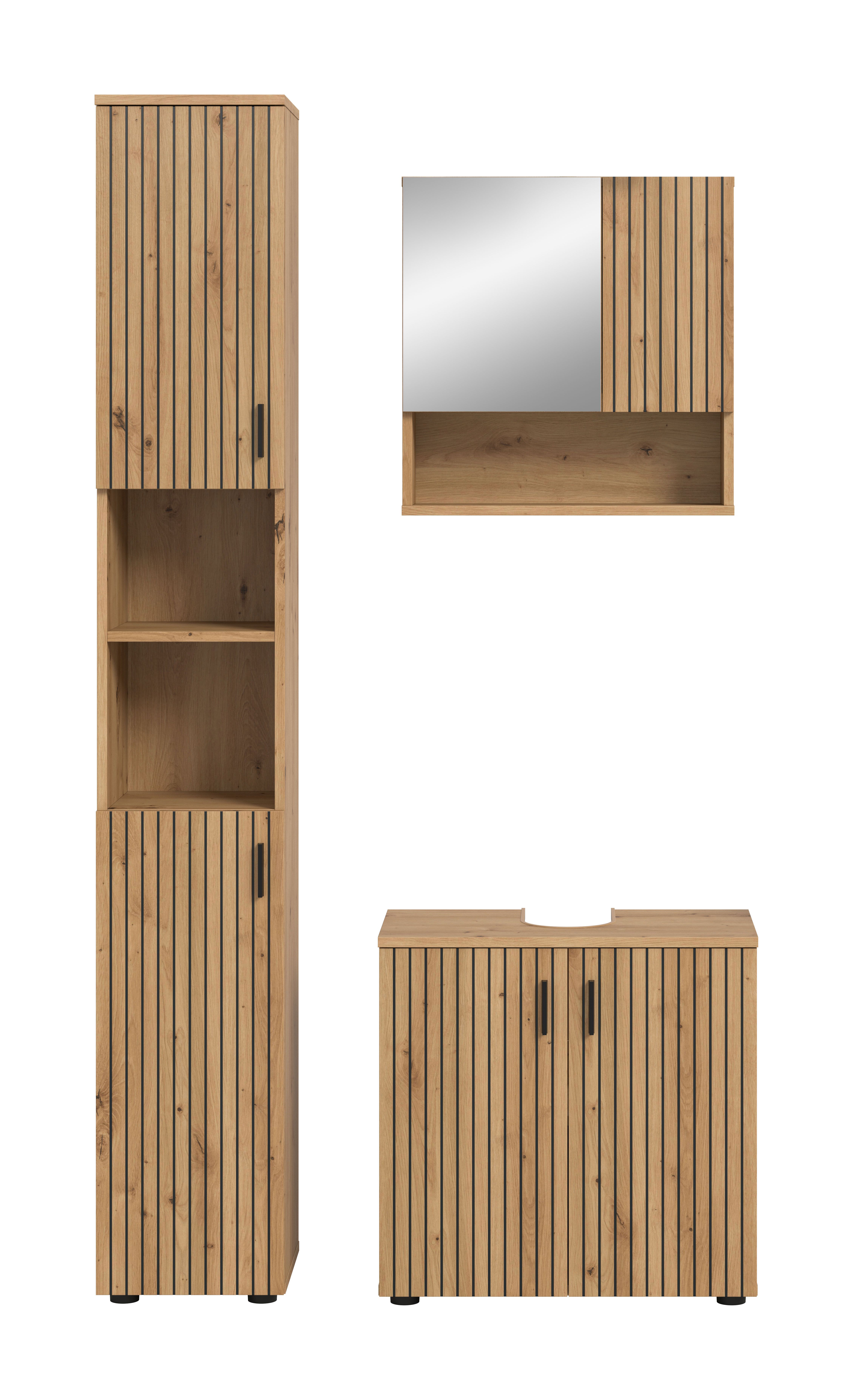 Cet ensemble 3 éléments en décor chêne Artisan (105 x 192 x 30 cm) comprend un meuble colonne, un meuble sous lavabo et une armoire de toilette. La façade soigneusement travaillée avec finition rainurée, facile d’entretien, confèrera à votre salle de bains une allure chaleureuse et naturelle. Les meubles offrent un vaste espace de rangement pour vos produits de beauté, serviettes et autres accessoires pour une salle de bains fonctionnelle et bien ordonnée. Grâce aux nombreuses possibilités d’association avec les autres meubles de la série, vous pourrez personnaliser et compléter votre salle de bains de façon flexible. Cet ensemble est idéal si vous recherchez la qualité, le design et la fonctionnalité tout en accordant de l’importance à un aménagement harmonieux de votre pièce.