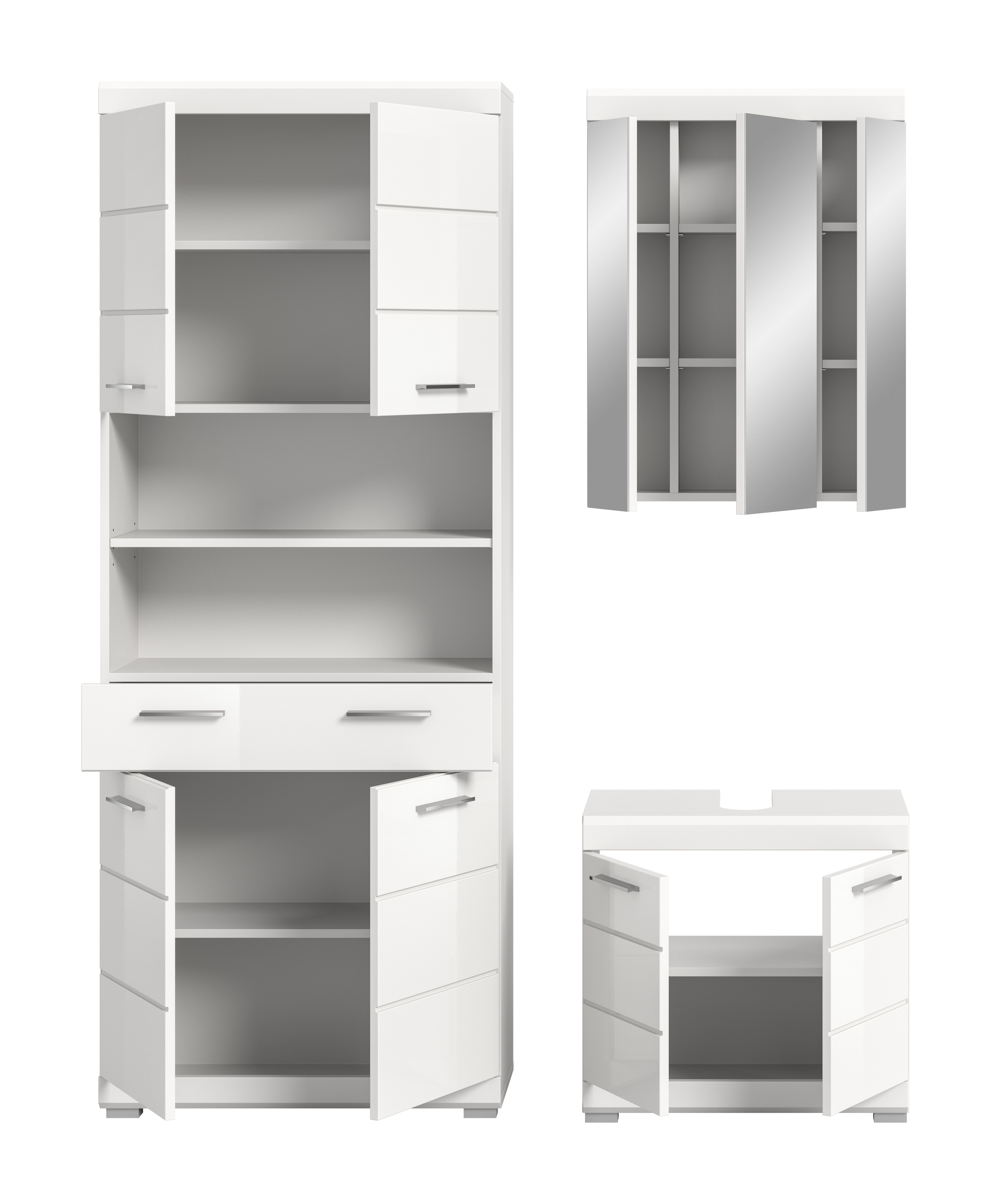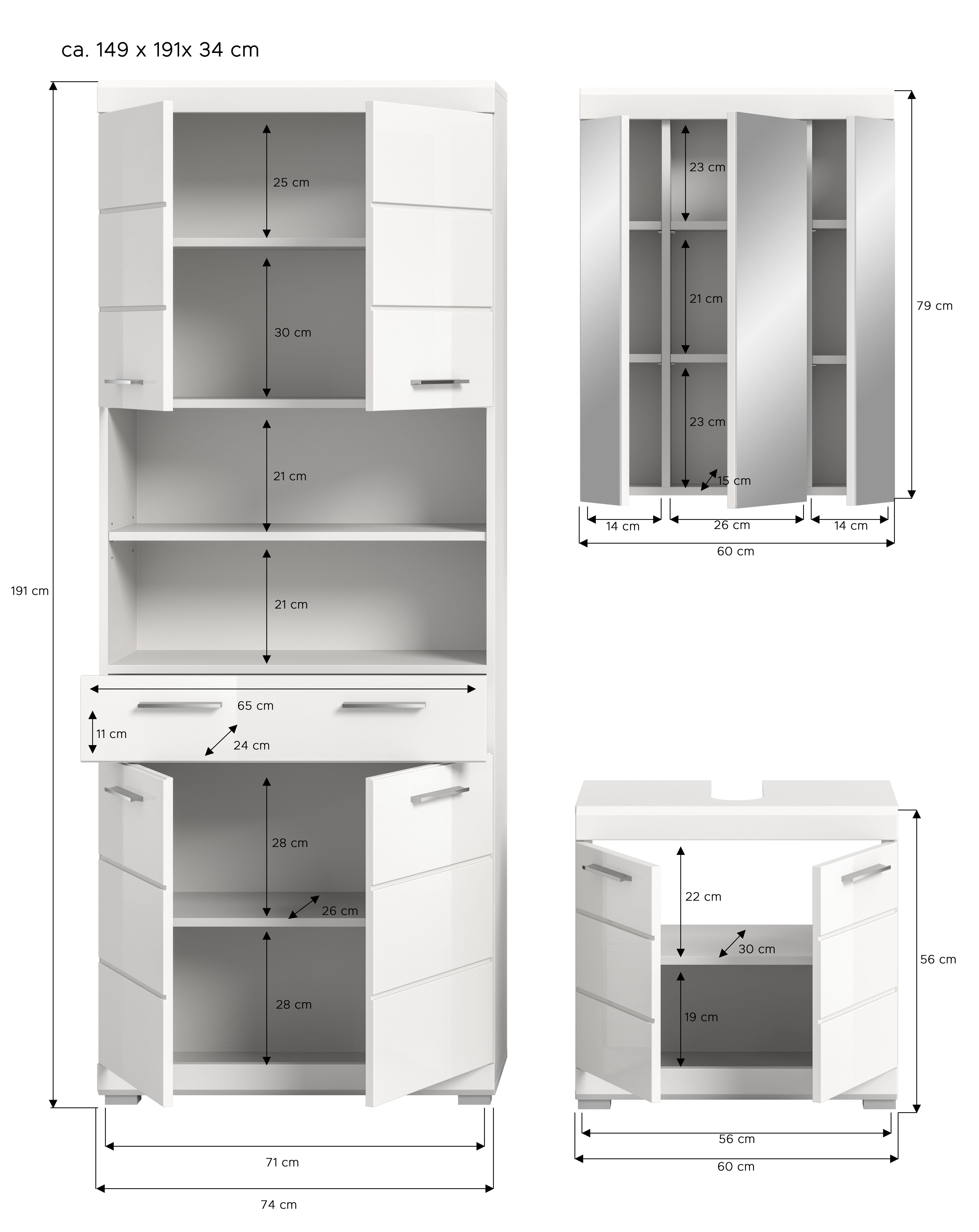Cette salle de bains combinée 3 éléments en décor blanc et façades finition blanc ultra brillant (dimensions : 149 x 191 x 34 cm) se compose d’une armoire de salle de bains, d’un meuble sous lavabo et d’une armoire de toilette. Les façades soigneusement travaillées en MDF, avec finition rainurée, confèrent à la salle de bains un aspect moderne et élégant. La surface facile d’entretien simplifie le nettoyage tout en conservant son bel aspect dans le temps. Cet ensemble dispose d’un vaste espace de rangement pour les serviettes, produits de beauté et autres accessoires de bain, afin de garder la pièce toujours bien rangée et fonctionnelle. Les meubles se distinguent par leur robustesse et leur longévité tout en facilitant le quotidien. Avec cet ensemble, vous optez pour une alliance harmonieuse entre design, qualité et fonctionnalité.