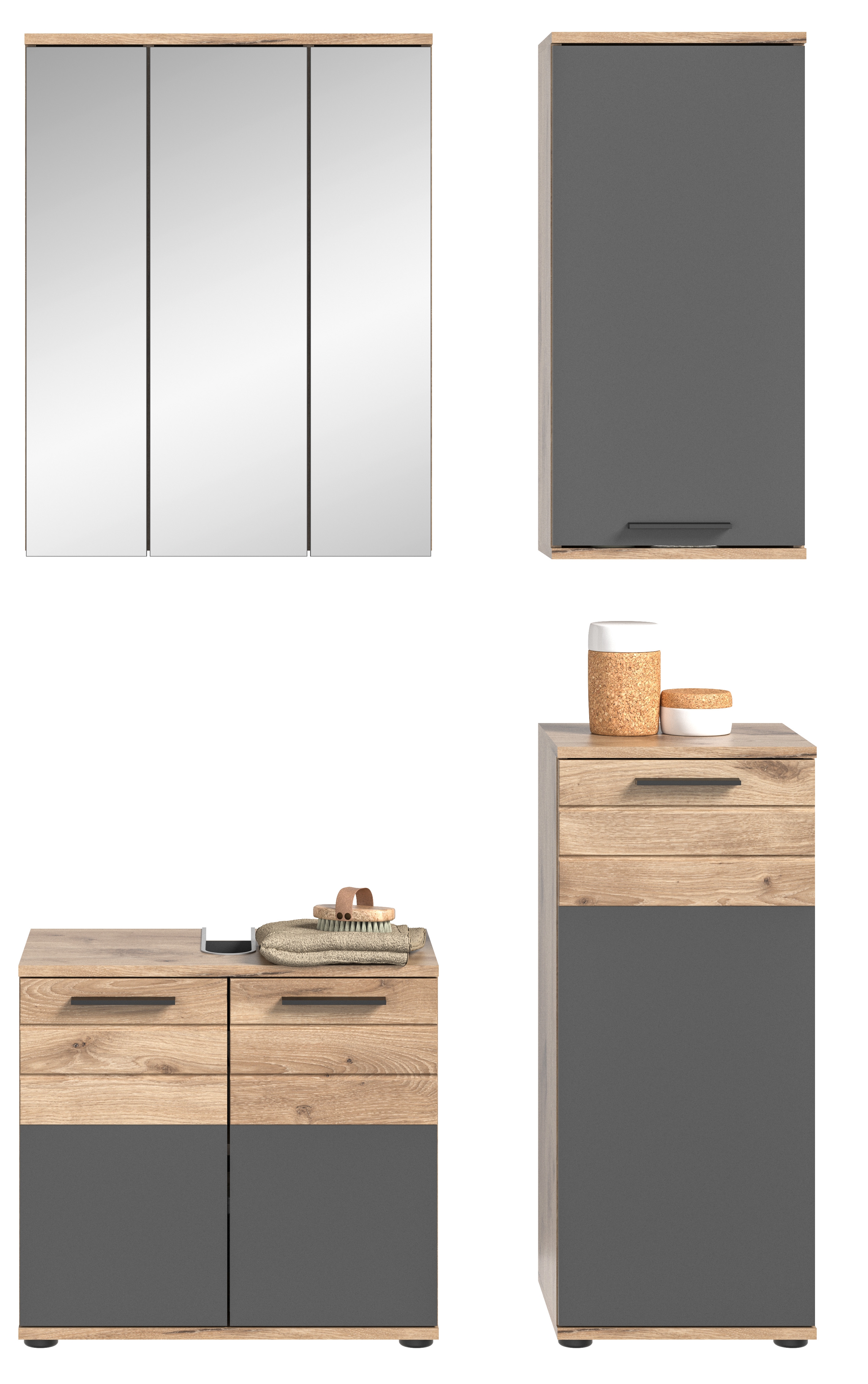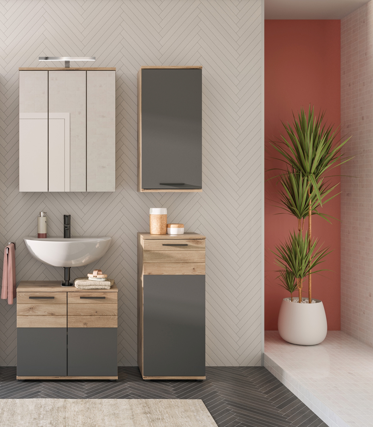 - Qualité/entretien : la finition de qualité et les matériaux robustes garantissent une durée de vie accrue pour cet ensemble de salle de bains. Les décors chêne Nox et gris basalte sont faciles à nettoyer ce qui facilite l’entretien des meubles et garantit une utilisation longue durée.