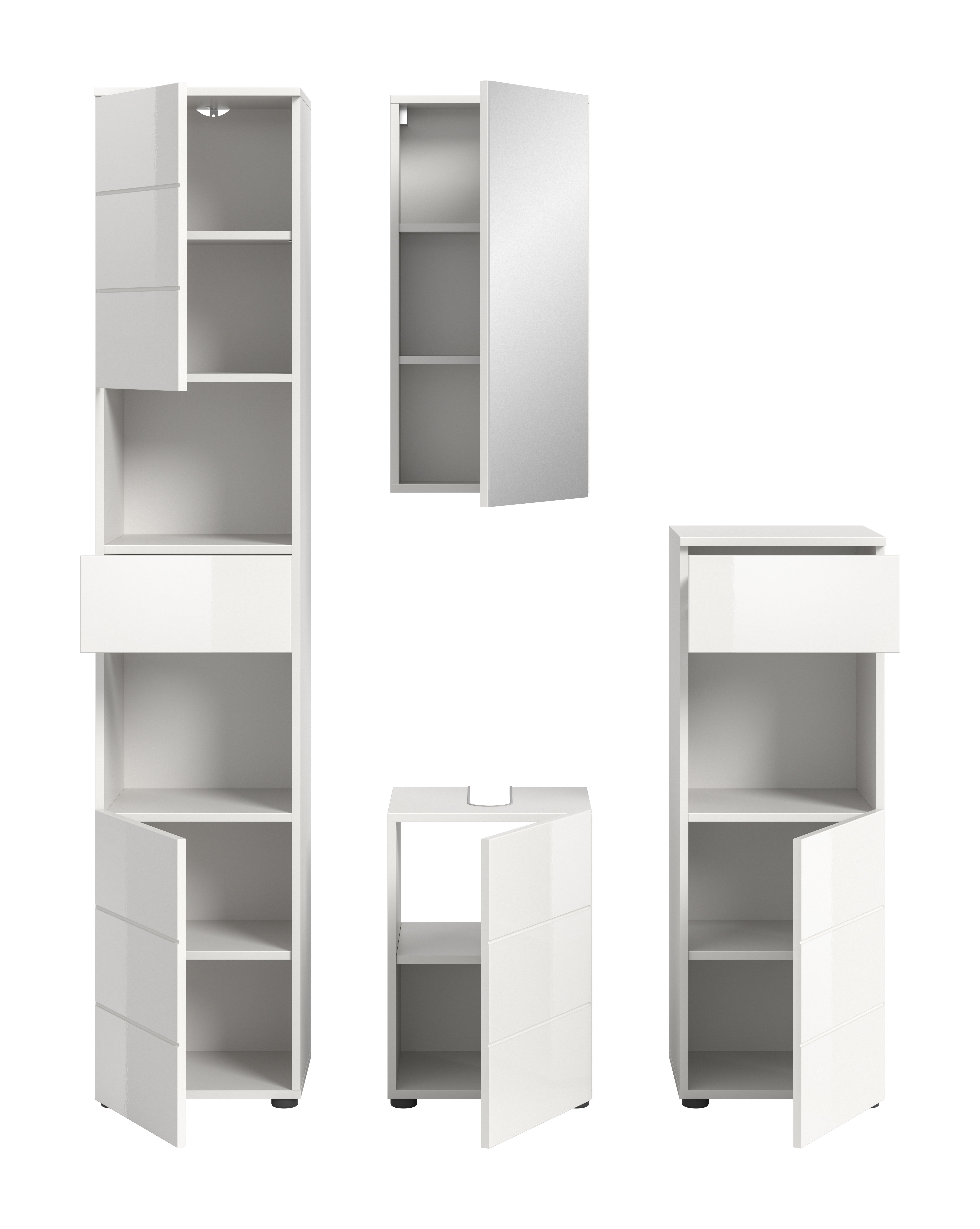 - Ensemble 4 éléments comprenant : 1 colonne de salle de bains, 1 meuble sous lavabo , 1 armoire de toilette, 1 meuble de rangement étroit
