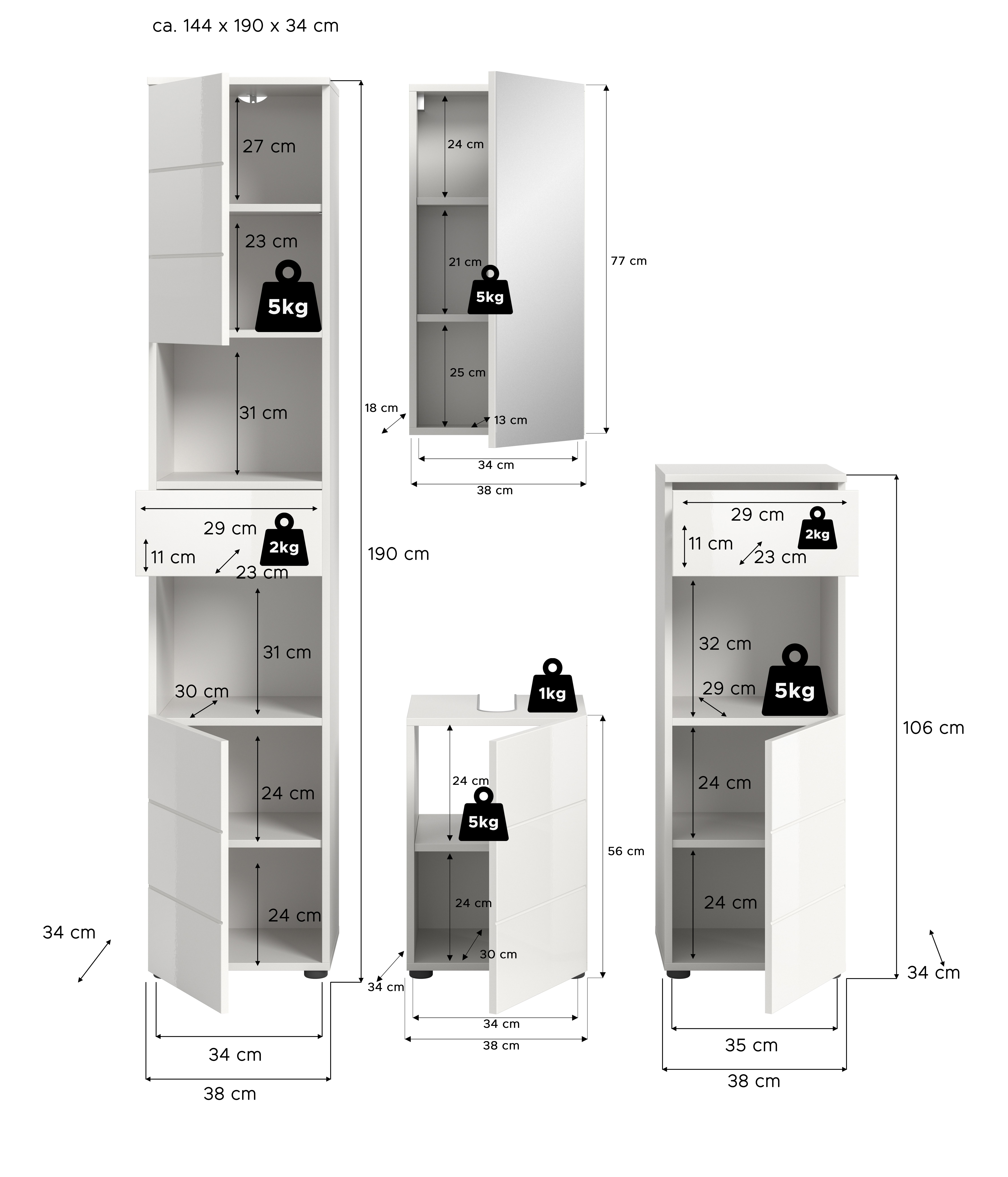 Notre salle de bains combinée (L/H/P: 144x190x34 cm) dans une finition thermoformée ton blanc ultra brillant associe style et fonctionnalité ! Cet ensemble comprenant un meuble colonne, un meuble sous lavabo, une armoire de toilette et un meuble de rangement étroit offre un espace de rangement suffisant dans un design tendance. Cette salle de bains combinée est idéale pour toutes les pièces d’eau et permet de faire régner l’ordre tout en créant une atmosphère conviviale. Découvrez l’équilibre parfait entre design et aspect pratique au quotidien !