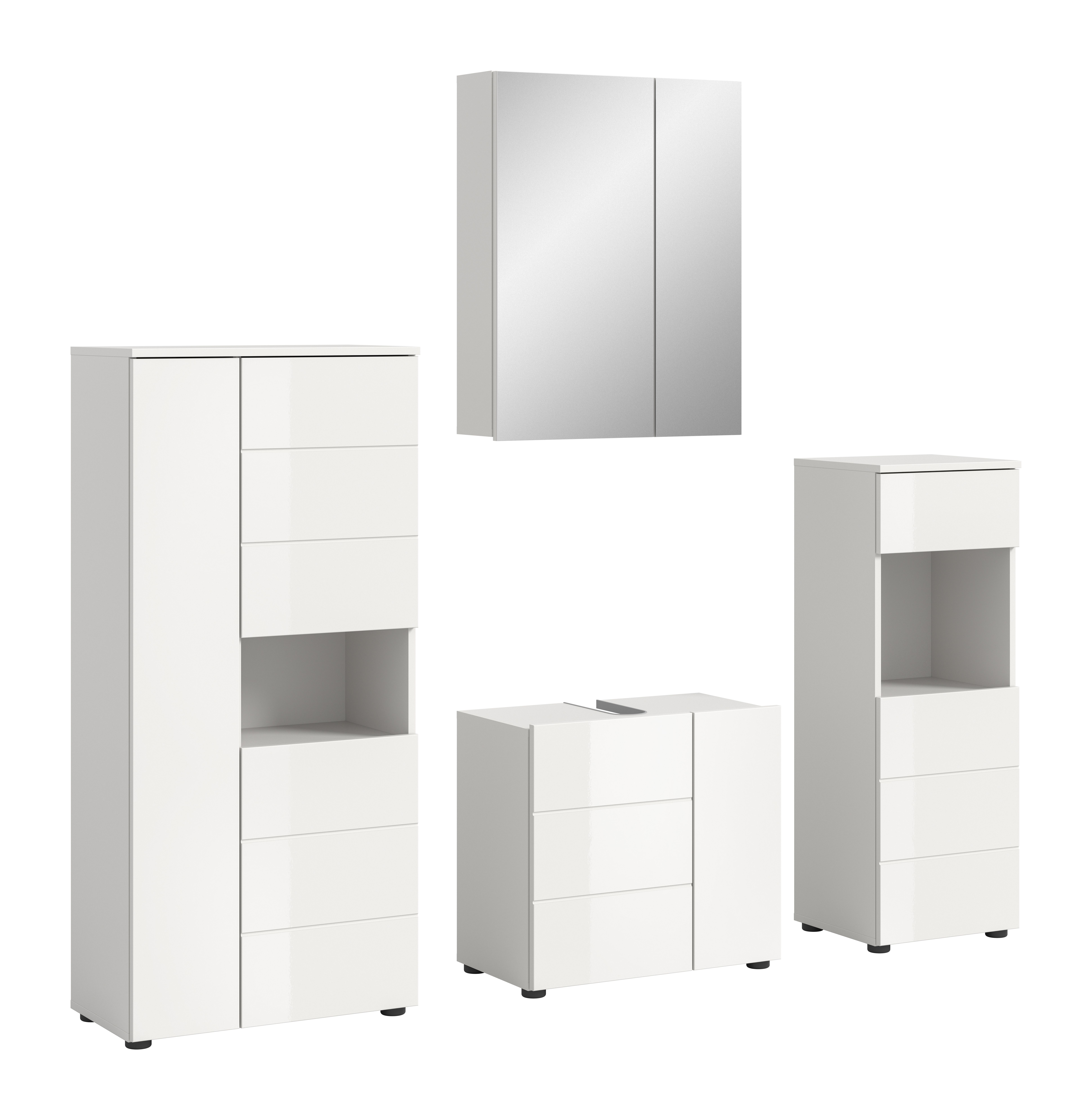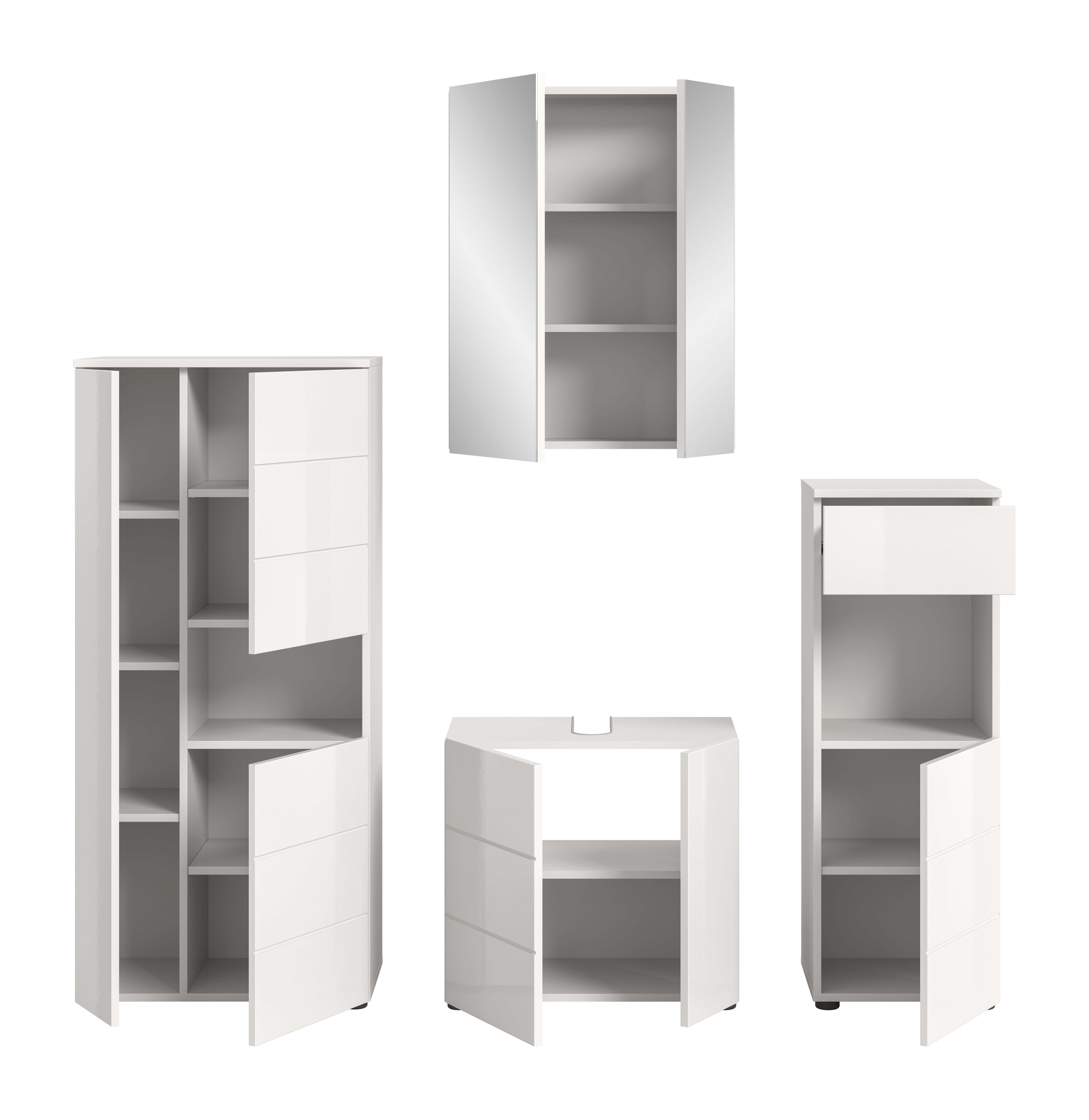 La salle de bains combinée (L/H/P : 188x190x34 cm) dans un design élégant aspect thermoformé ton blanc ultra brillant offre un bel espace de rangement pour votre salle d’eau. Cet ensemble comprend un meuble demi-colonne, un meuble sous lavabo, une armoire de toilette et un meuble de rangement étroit pour conserver votre pièce bien ordonnée et organisée. Le style tendance créera une ambiance accueillante dans votre salle de bains. Conférez à votre oasis de bien-être un charme éclatant avec cette salle de bains combinée ultra stylée.