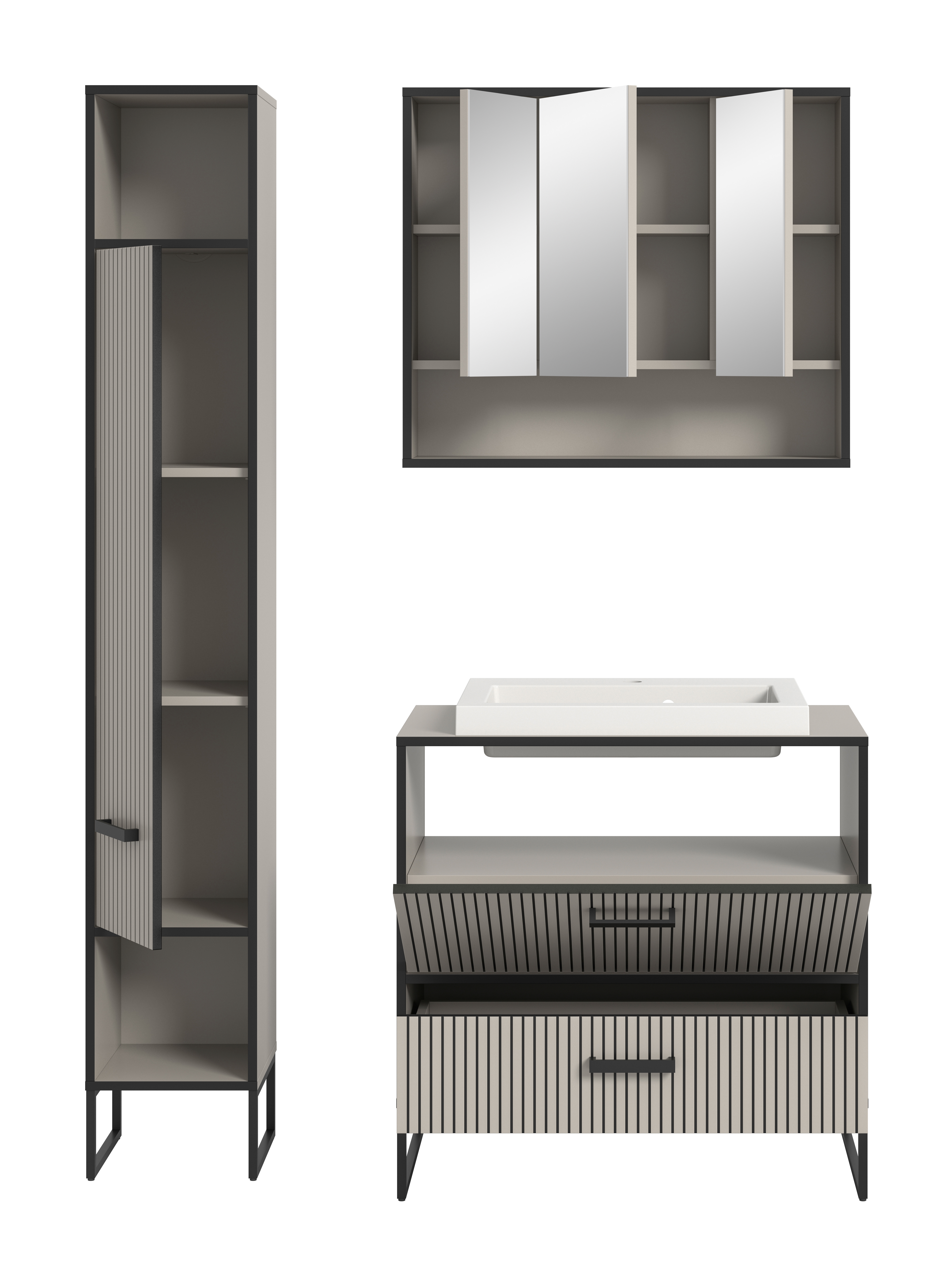 Cette salle de bains combinée 4 éléments (L/H/P : 125x192x48 cm) en décor bois ton cachemire dispose d'un design astucieux adapté à tout type de salles de bains. Composée d’un meuble colonne élégant, d’une armoire de toilette pratique et d’un meuble sous vasque de qualité avec vasque, elle apporte style et ordre à votre pièce. Sa surface facile d’entretien assure une apparence toujours soignée, tandis que l’effet rainuré confère une touche moderne à l’ensemble. Idéale pour celles et ceux qui recherchent à la fois fonctionnalité et esthétique !