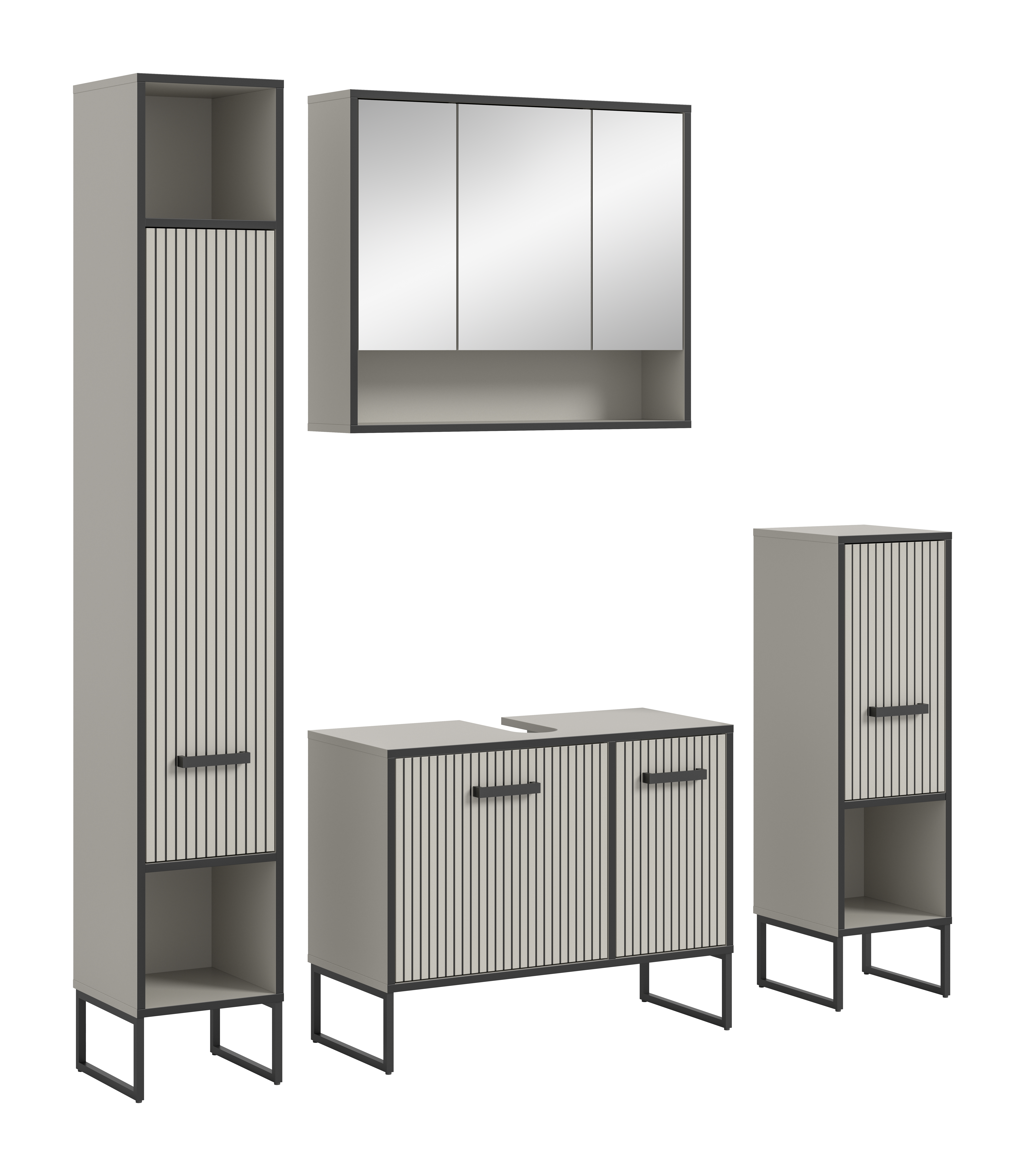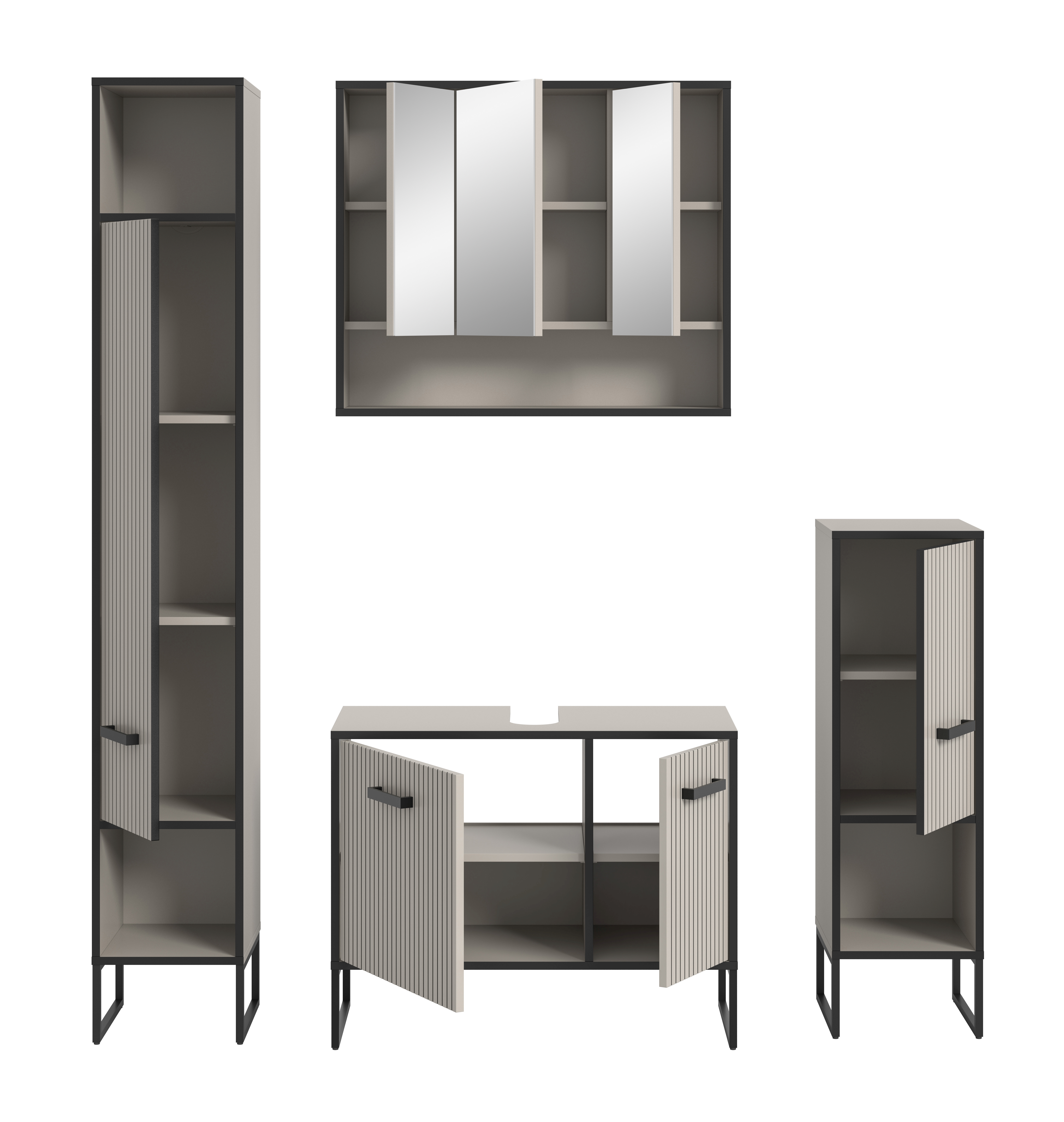 Apportez une touche de luxe à votre salle de bains grâce à cette combinaison 4 éléments (L/H/P : 170x192x36 cm) en décor bois ton cachemire. Cet ensemble complet comprend un meuble colonne, un meuble sous lavabo, une armoire de toilette et un meuble de rangement, offrant ainsi un maximum d’espace de stockage. Sa surface de qualité, facile d’entretien, et sa finition tendance à effet rainuré créent une ambiance élégante et accueillante. Idéal pour les salles de bains spacieuses !