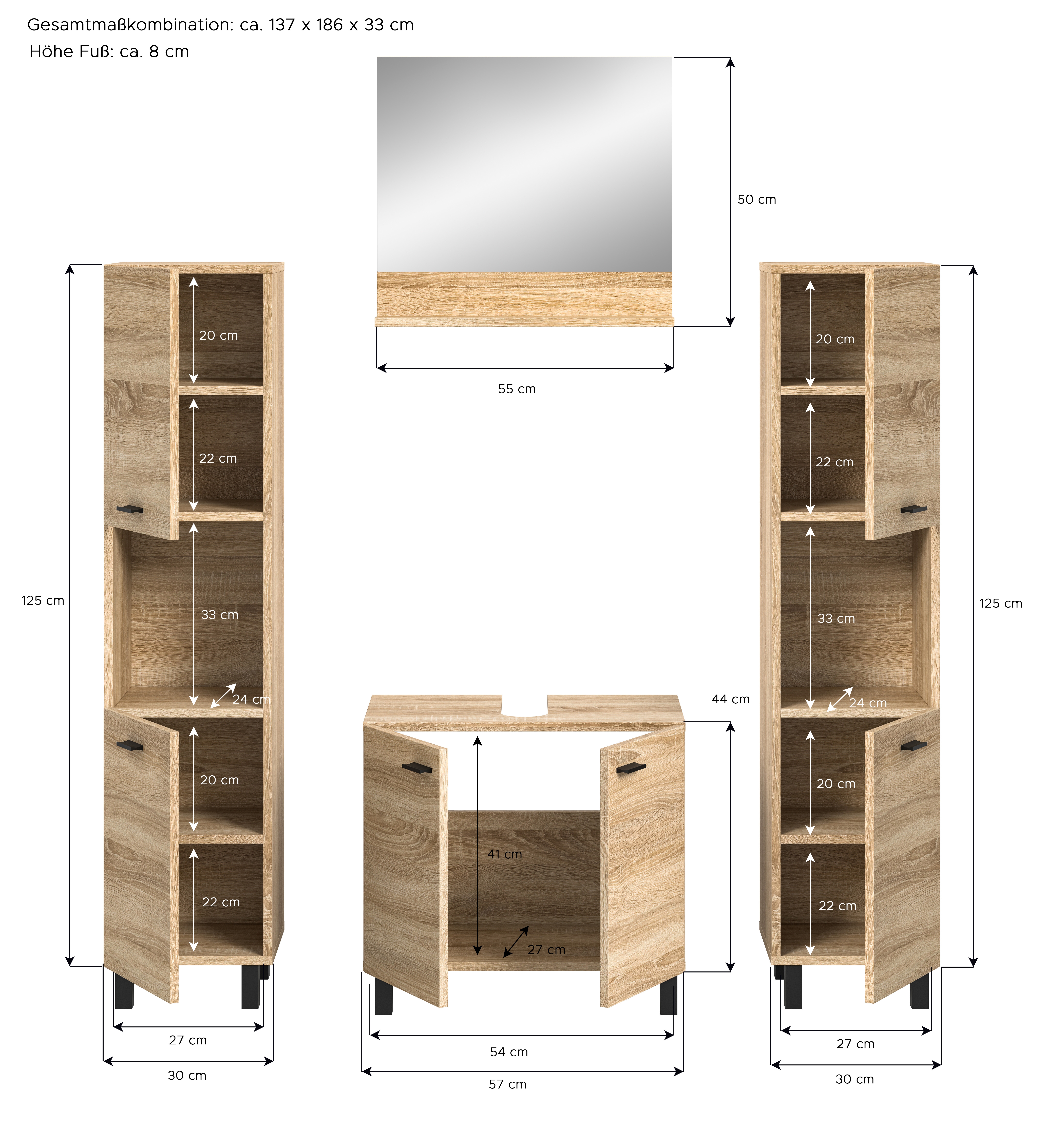 - Fonctionnalité : vaste espace de rangement avec différentes armoires et divers casiers pour le stockage organisé des accessoires de bain, serviettes et produits de soins ; cet ensemble permet également d’aménager joliment la salle de bains.