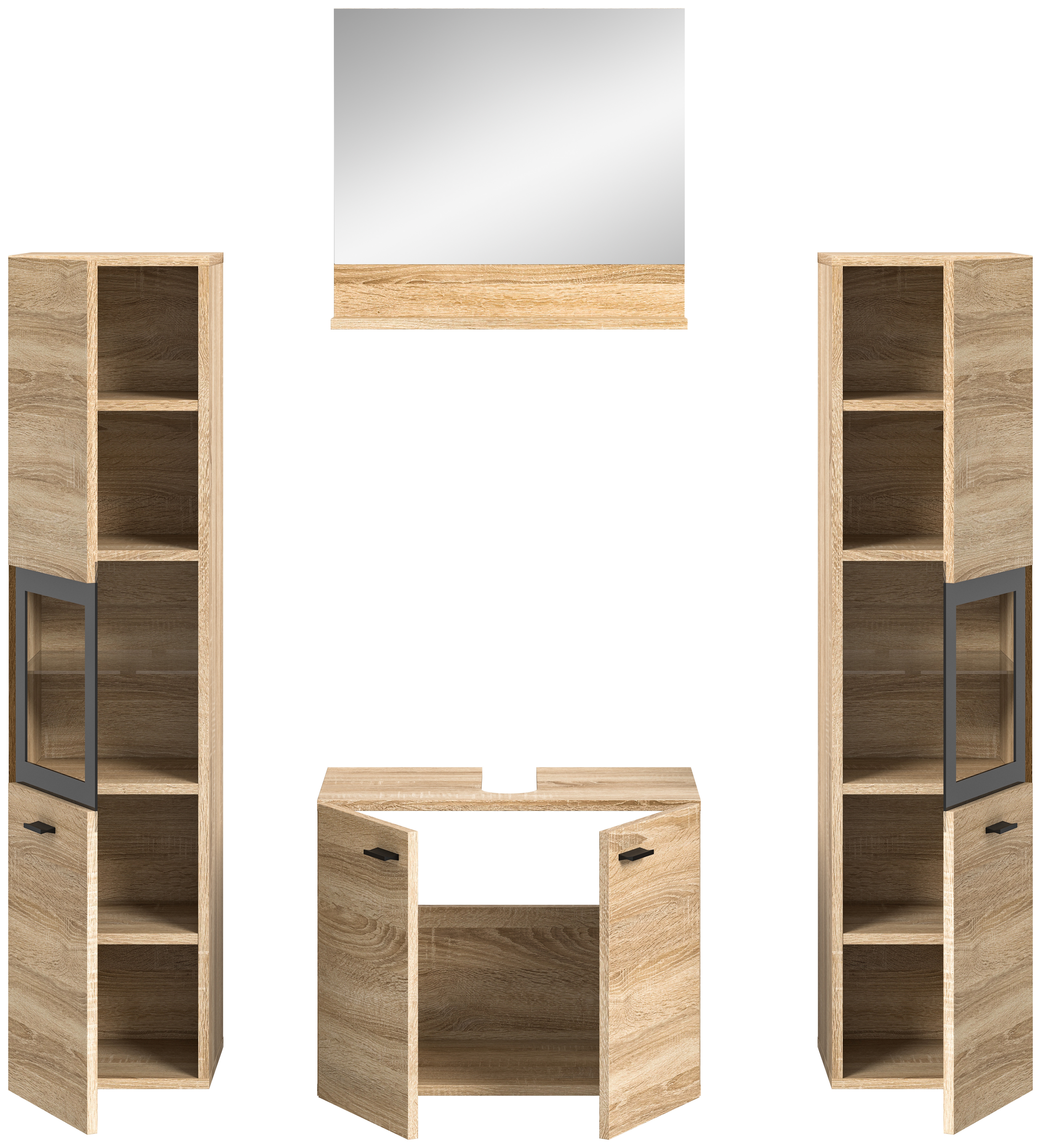 - Fonctionnalité : vaste espace de rangement avec différentes armoires et divers casiers pour le stockage organisé des accessoires de bain, serviettes et produits de soins ; cet ensemble permet également d’aménager joliment la salle de bains.