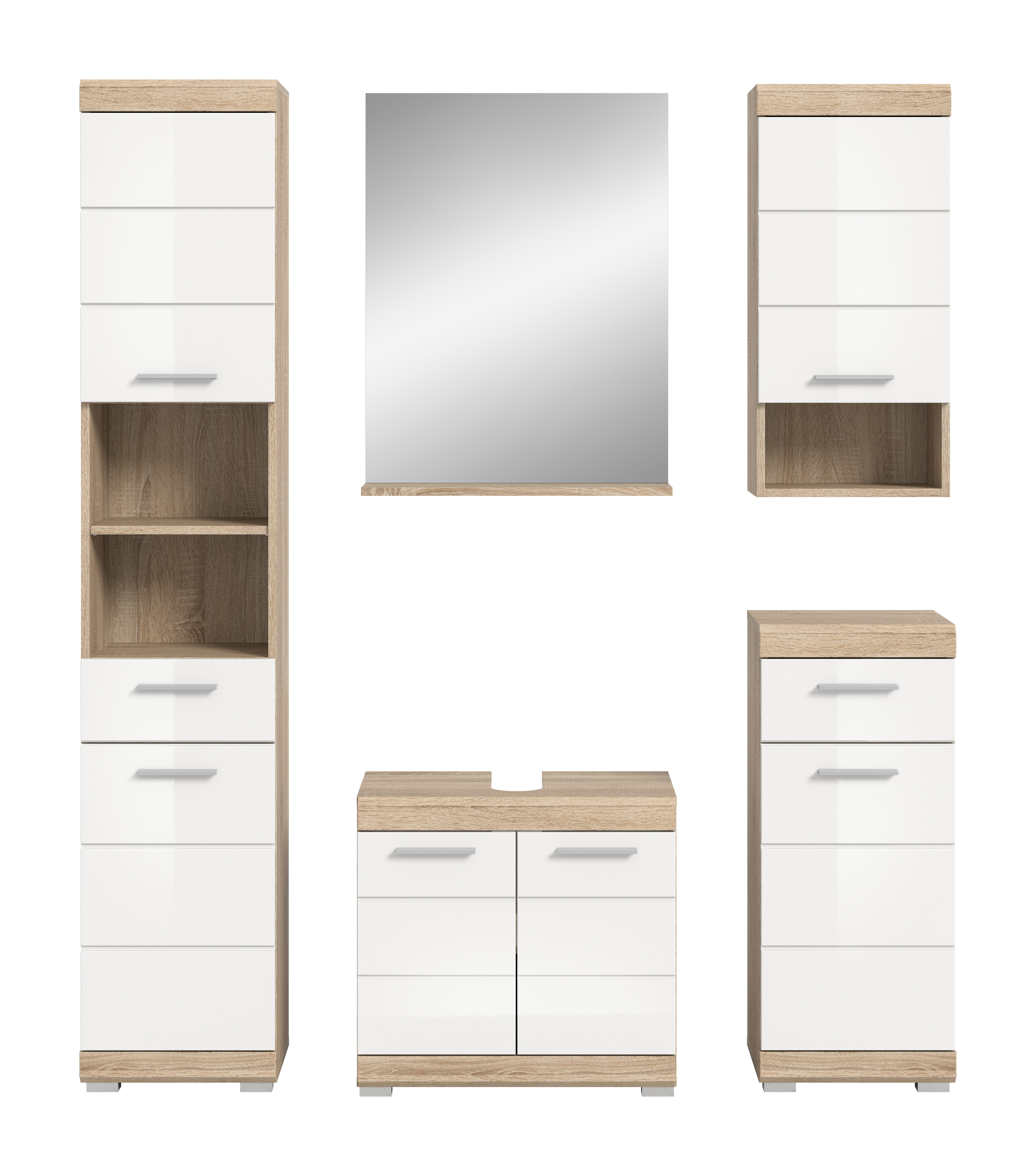 • Fonctionnalité : cette solution complète offre un espace de rangement généreux grâce à différents éléments comme le meuble sous lavabo, la colonne de salle de bains et l’armoire de toilette ; ceci permet une organisation efficace des accessoires de toilette et objets du quotidien.