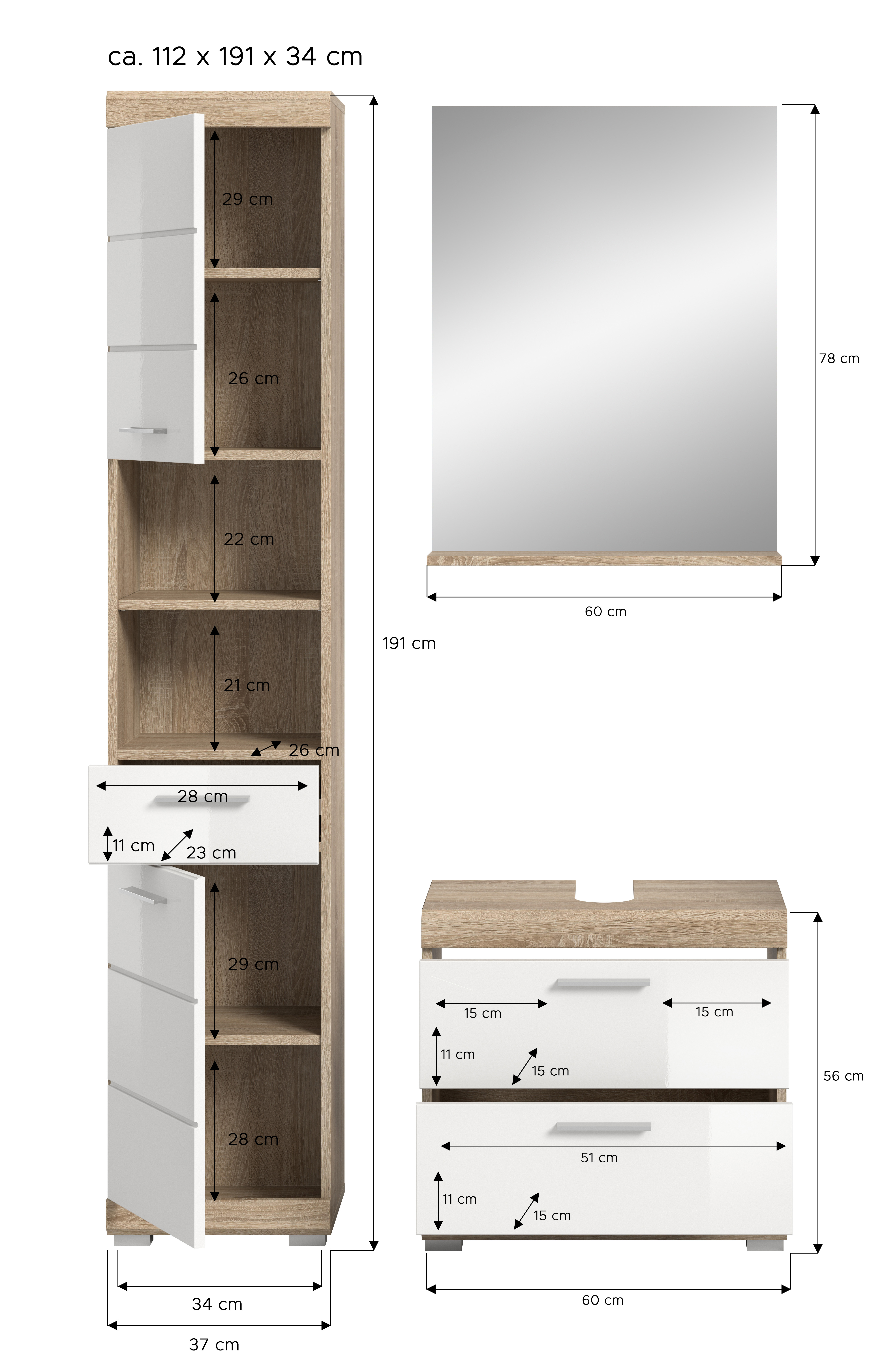 • Design/style : la combinaison du décor chêne Sonoma clair et de la finition thermoformée ton blanc ultra brillant crée une apparence moderne et attrayante dans la salle de bains ou la buanderie.