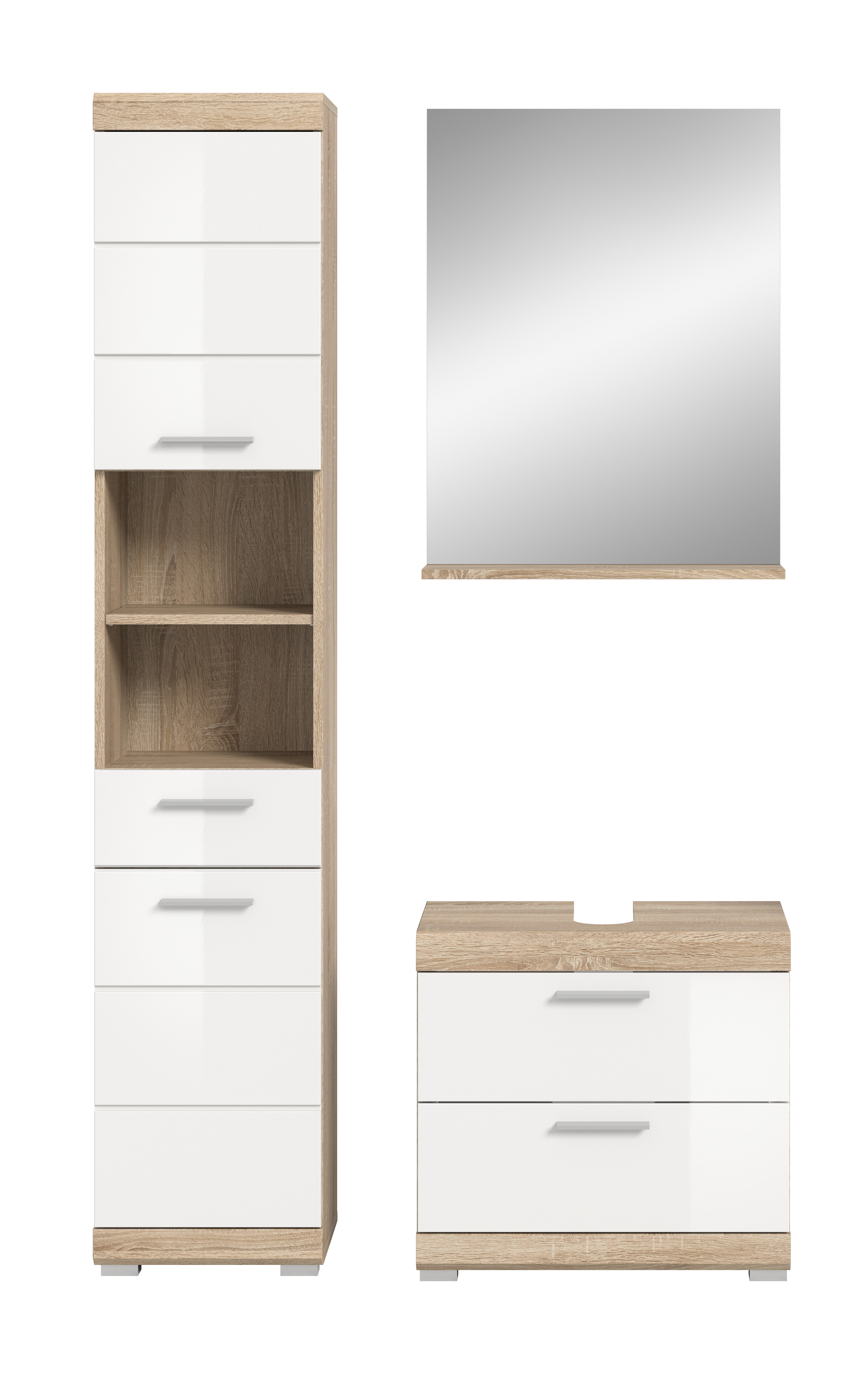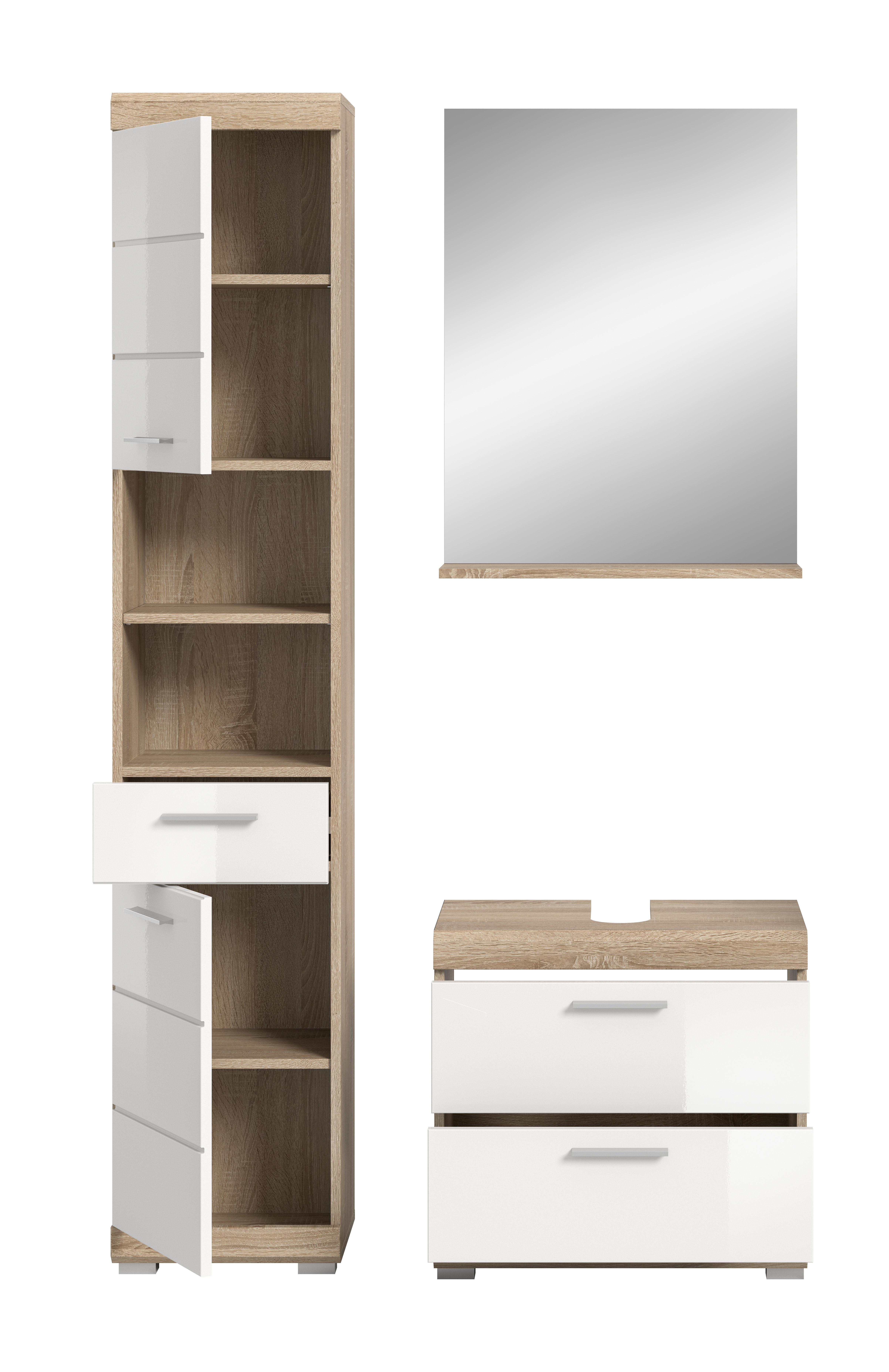 • Fonctionnalité : cette solution complète offre un espace de rangement généreux grâce à différents éléments comme le meuble sous lavabo, la colonne de salle de bains et l’armoire de toilette ; ceci permet une organisation efficace des accessoires de toilette et objets du quotidien.