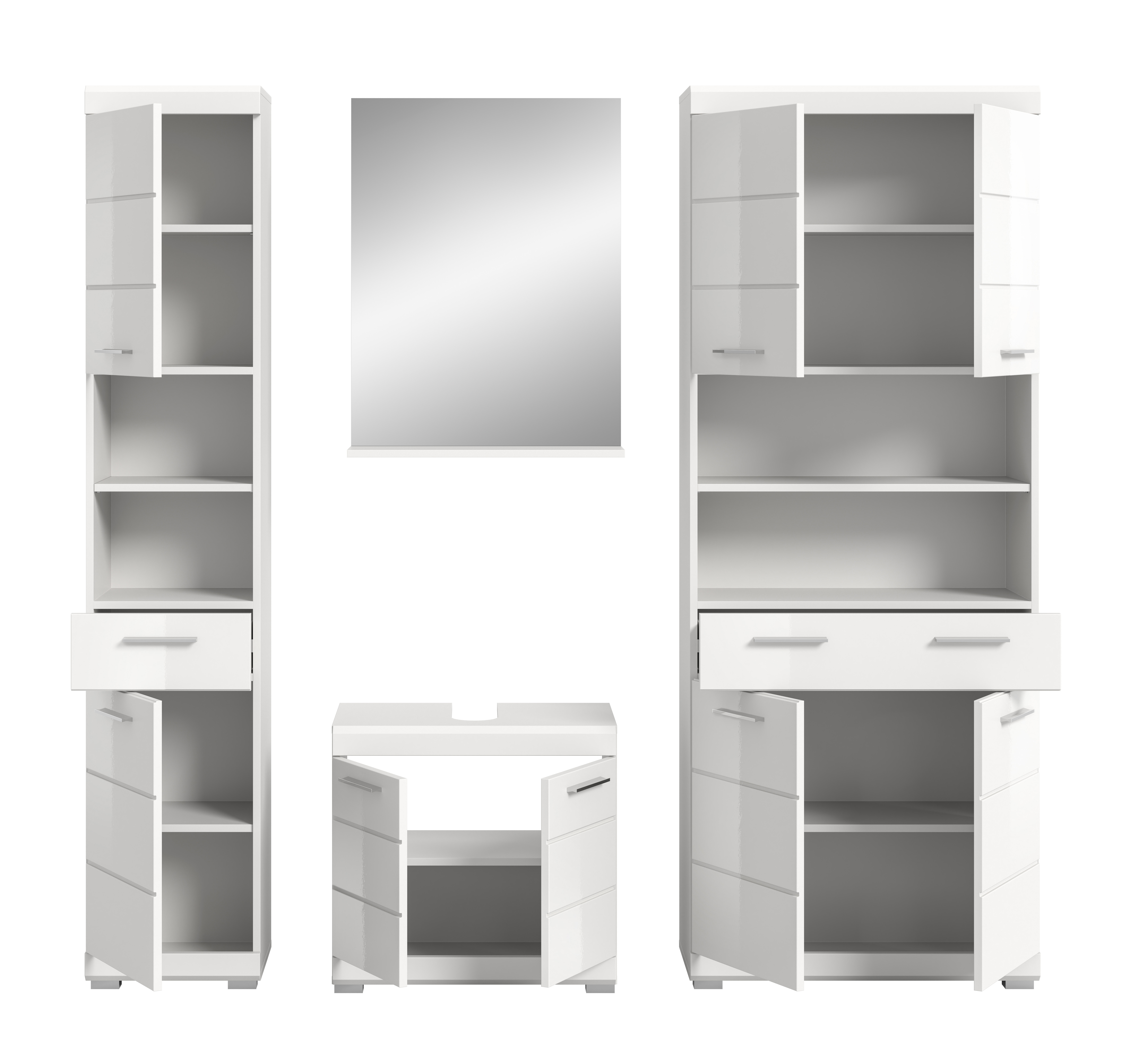 1 colonne de salle de bains avec 4 portes, 1 tiroir, 2 casiers ouverts, 2 tablettes fixes et 3 tablettes amovibles