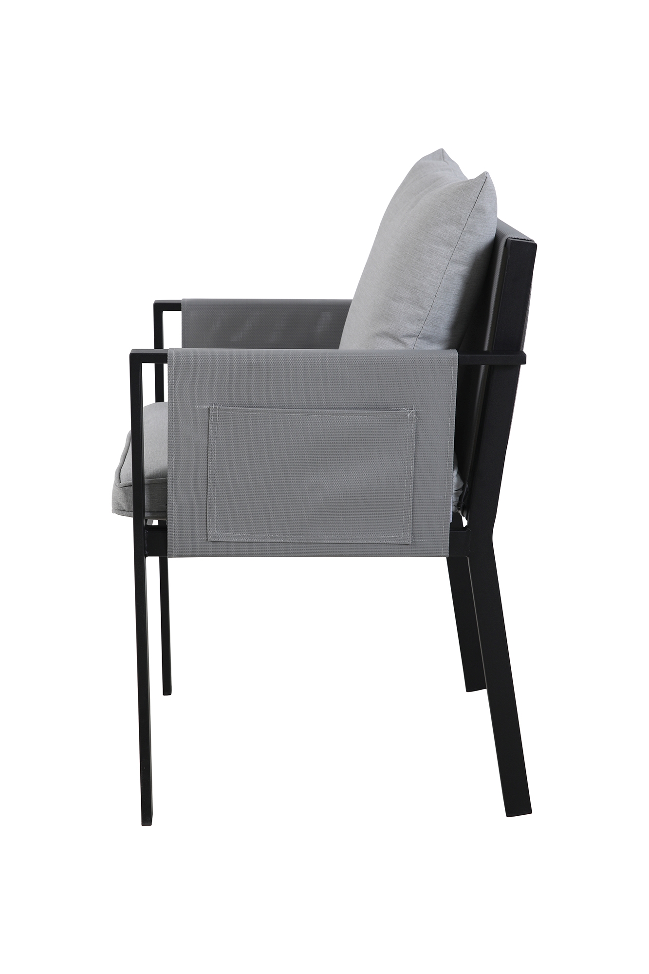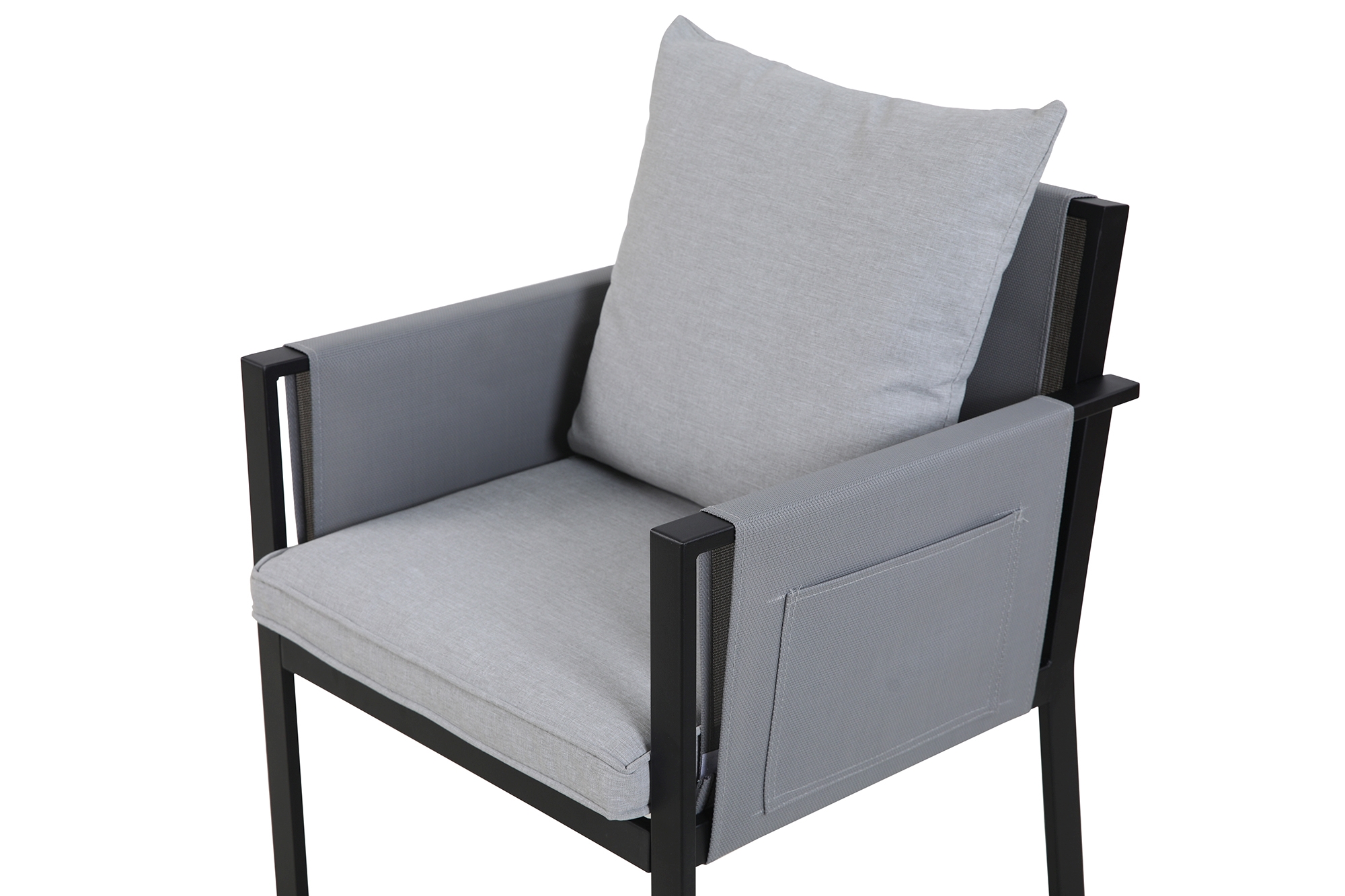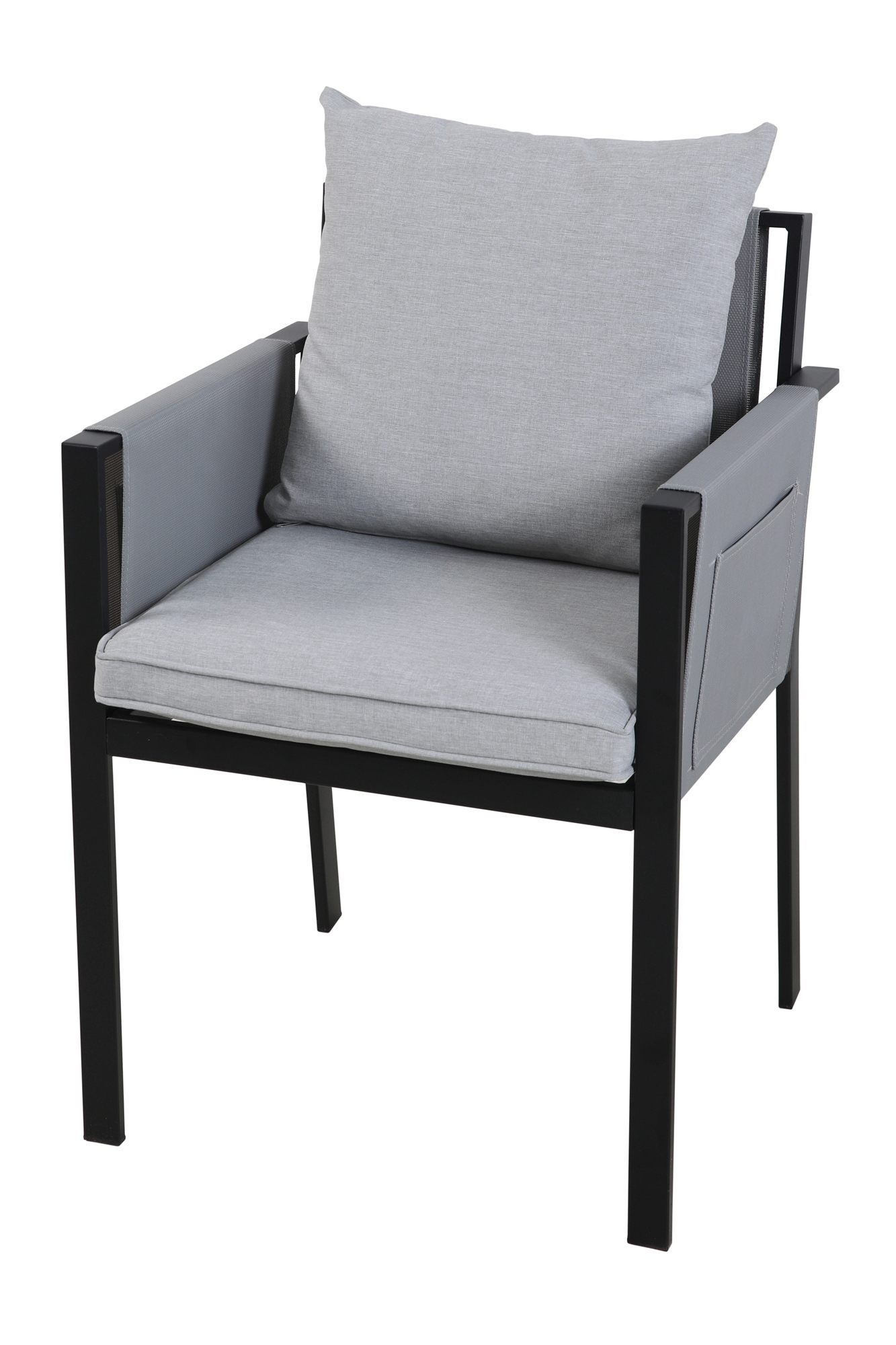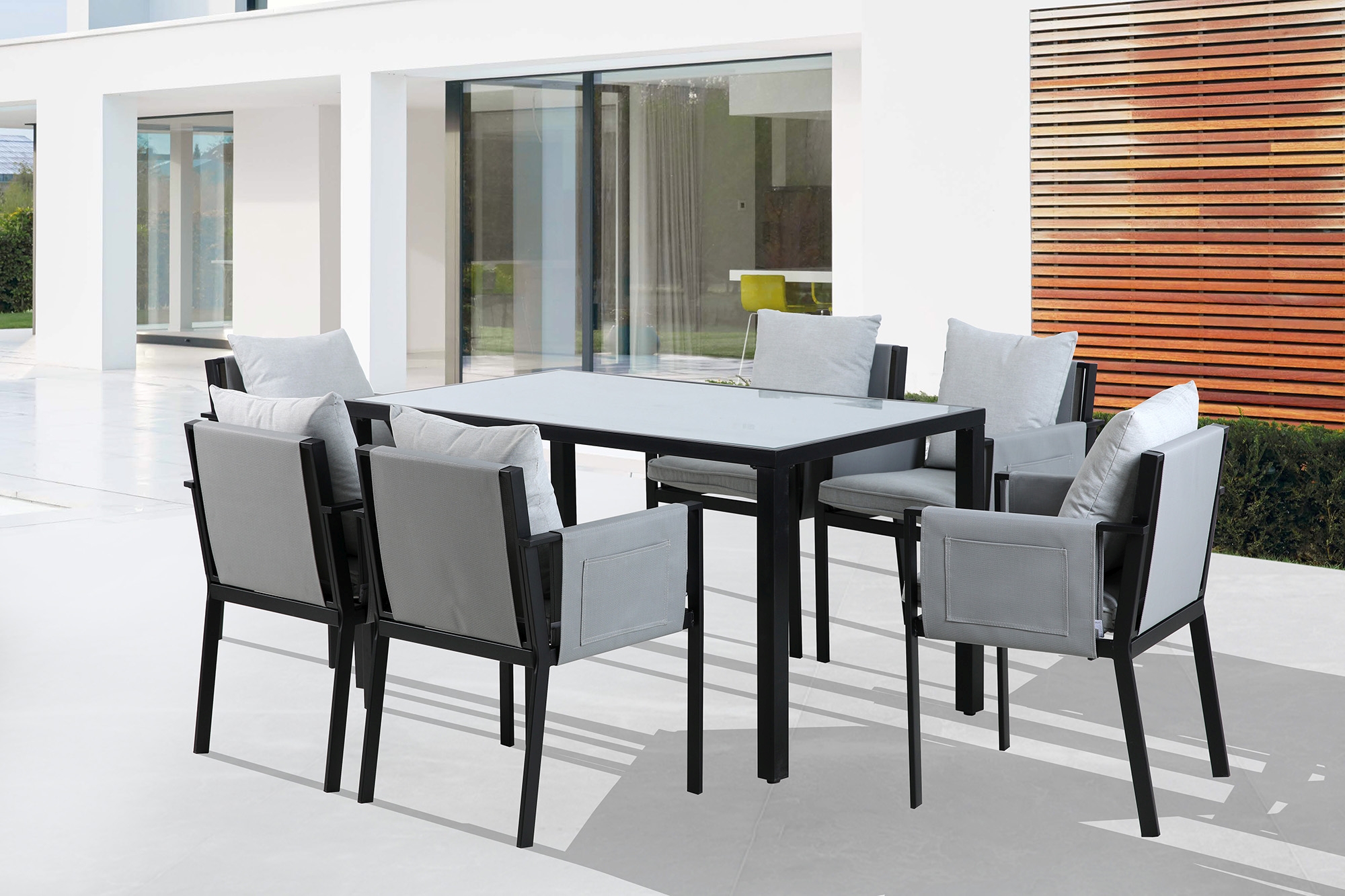 Ce salon de jardin, comprenant une table de repas, 6 chaises ainsi que des coussins d’assise et de dos, offre suffisamment d’espace pour 6 personnes. Les coussins d’assise d’env. 5 cm d’épaisseur et les coussins de dos moelleux permettent de se détendre confortablement. Le salon de jardin est la solution idéale pour le jardin, la terrasse et la véranda ; ce modèle spacieux offre un bel espace pour profiter des soirées entre amis, mais aussi des fêtes de famille et des barbecues. Le piètement en acier est particulièrement résistant et robuste et s’utilise parfaitement à l’extérieur. Le plateau de table en verre durci et satiné ainsi que les coussins d’assise gris apportent la touche finale au design moderne aux lignes droites de l’ensemble. Les accoudoirs disposent d’un revêtement textile pourvu d’une poche latérale ultra pratique.