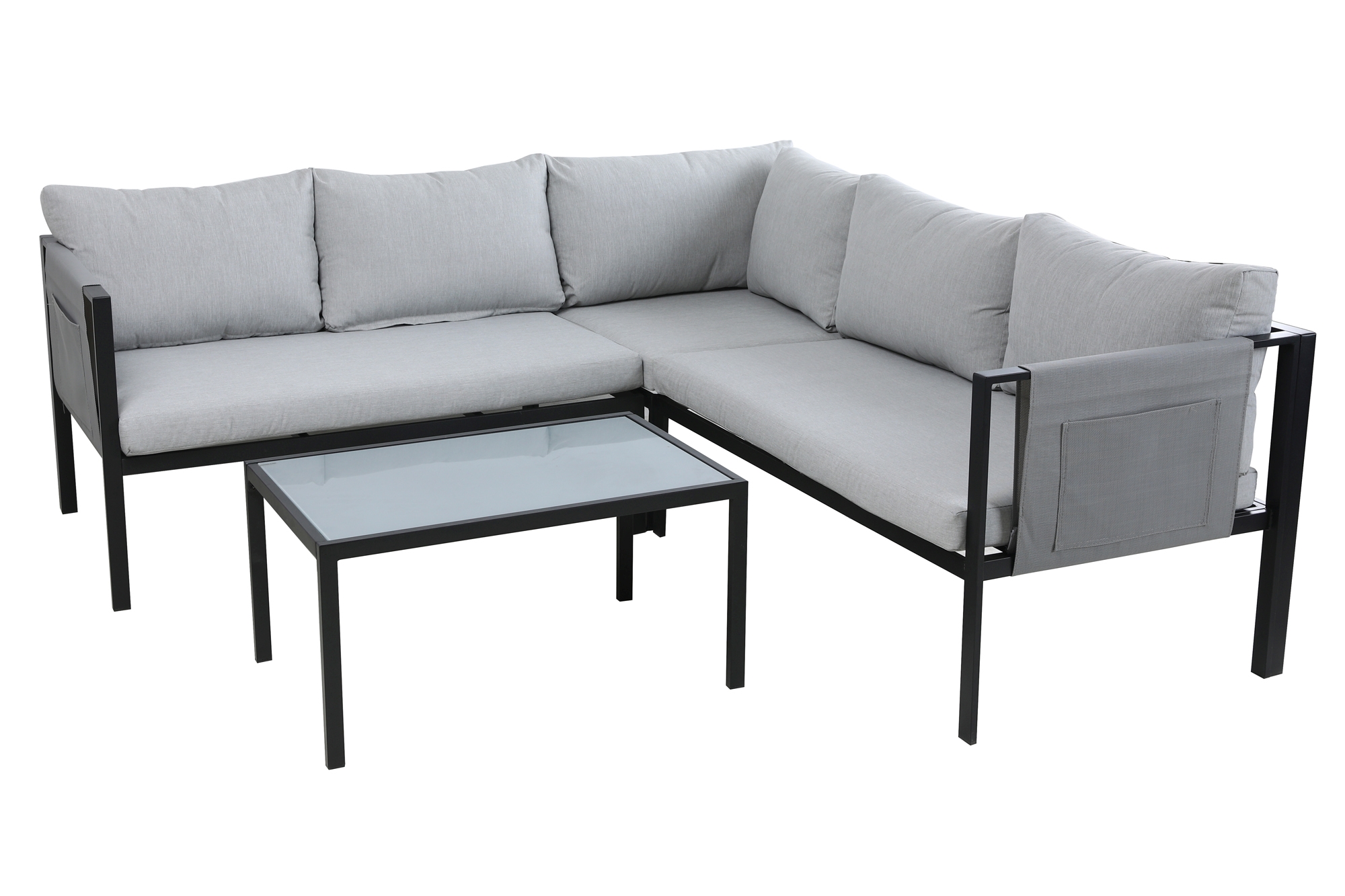 Ce salon de jardin, comprenant un canapé d’angle, une table basse et des coussins d’assise et de dos, offre suffisamment d’espace pour 6 personnes. Les coussins d’assise d’env. 7 cm d’épaisseur et les coussins de dos moelleux permettent de se détendre confortablement. Le salon de jardin est la solution idéale pour le jardin, la terrasse et la véranda ; ce modèle spacieux offre un bel espace pour profiter des soirées entre amis, mais aussi des fêtes de famille et des barbecues. Le piètement en acier est particulièrement résistant et robuste et s’utilise parfaitement à l’extérieur. Le plateau de table en verre durci et satiné ainsi que les coussins d’assise gris apportent la touche finale au design moderne aux lignes droites de l’ensemble. Les accoudoirs disposent d’un revêtement textile pourvu d’une poche latérale ultra pratique.