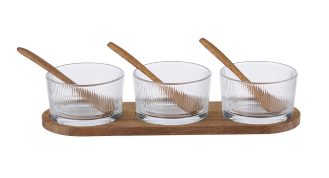 1 service apéro comprenant 3 coupelles, 3 petites cuillères et un plateau