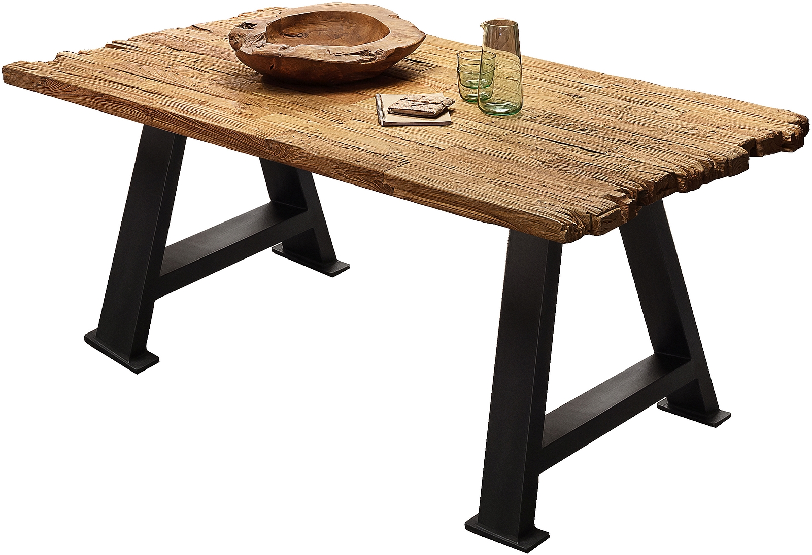 Plateau de table : teck massif recyclé ton naturel (Indonésie) avec bords irréguliers sur les côtés courts