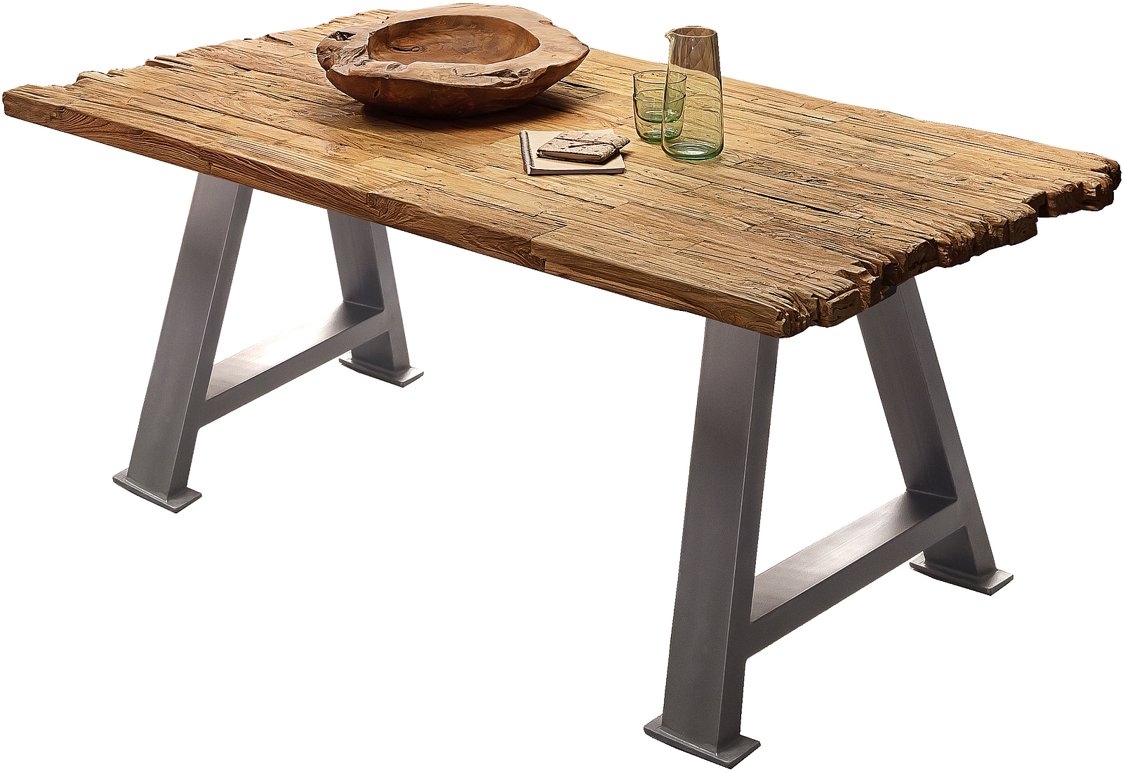 Plateau de table : teck massif recyclé ton naturel (Indonésie) avec bords irréguliers sur les côtés courts