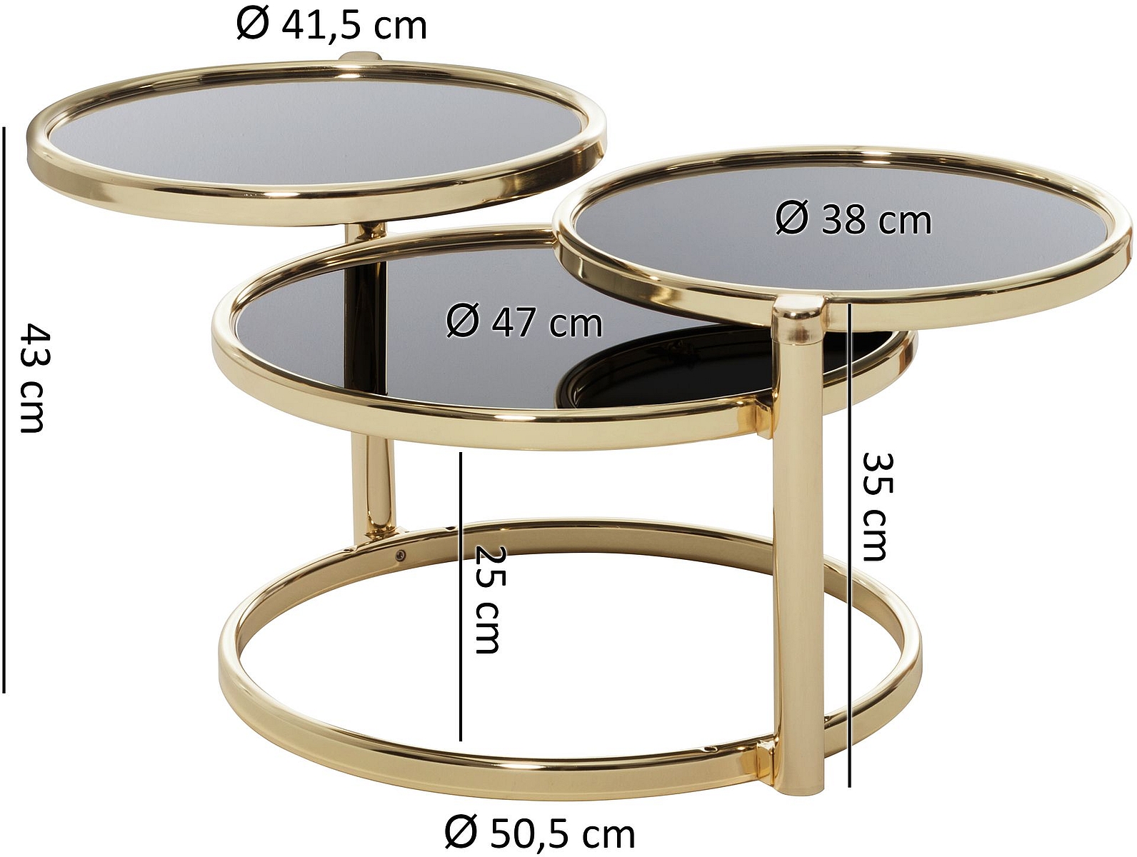 - IRRÉSISTIBLE ✔ Le superbe piètement en métal et les trois plateaux de tables en verre miroir trempé sont un vrai régal pour les yeux. Les trois plateaux pivotants achèvent parfaitement l’ensemble : une fois dépliés, la table a une largeur de 139 cm. Une bonne manière d’avoir toujours à portée de main vos boissons, snacks, portable, etc. Après une soirée télé tranquille, rabattez simplement les plateaux pour regagner de la place.