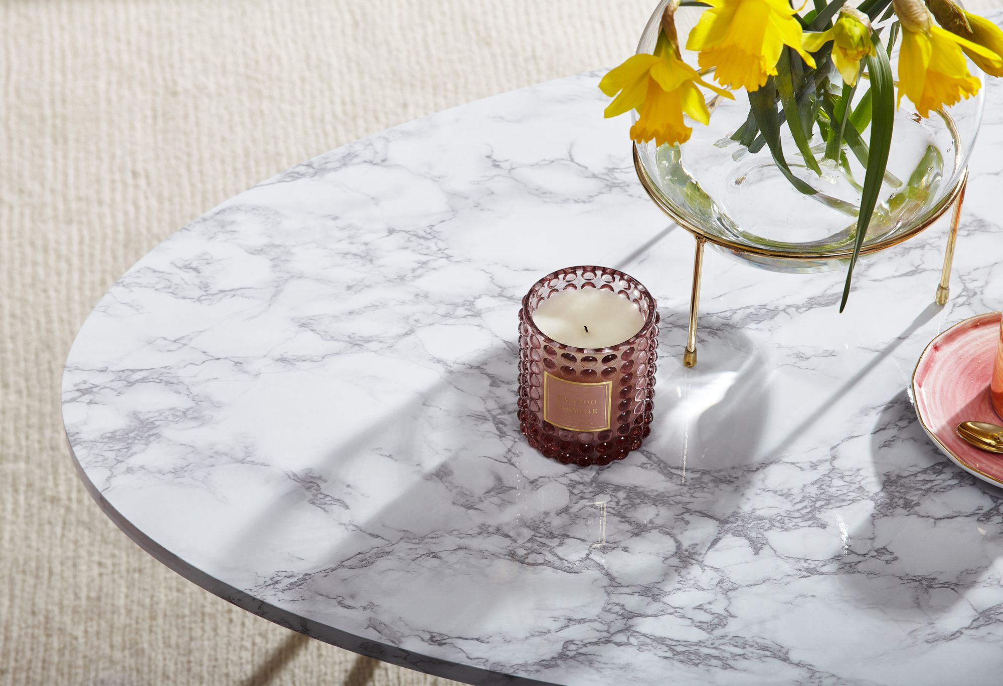 COMPOSITION ✔ Plateau de table : MDF pelliculé aspect marbre blanc avec revêtement protecteur en PVC // Piètement : fer thermolaqué.