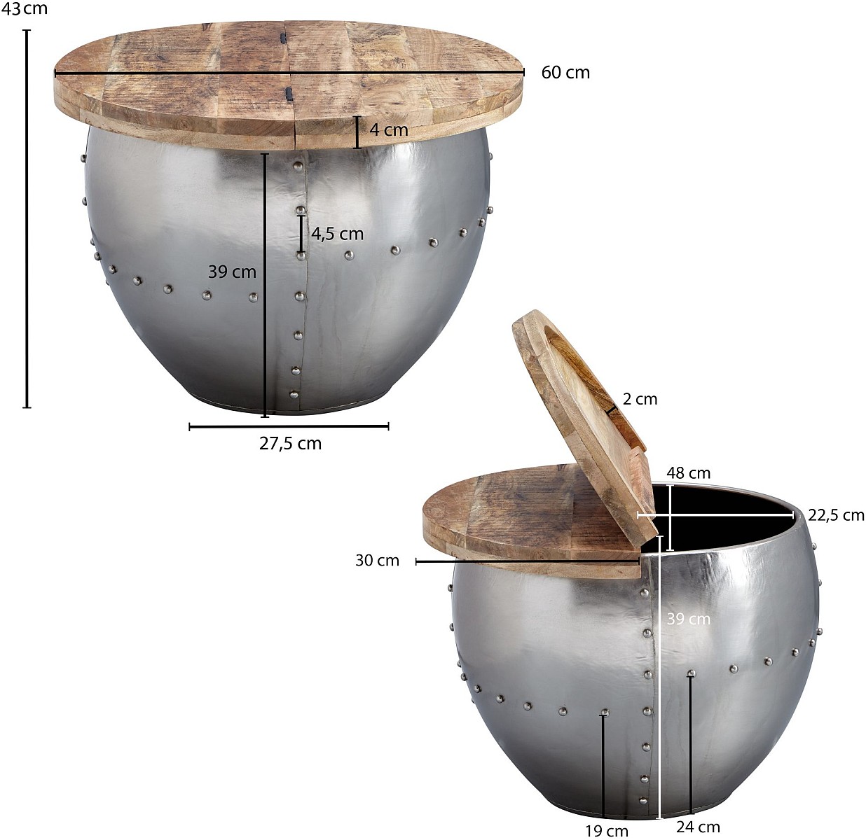 DIMENSIONS ✔ Largeur : 60 cm // Hauteur : 43 cm // Profondeur : 60 cm // Hauteur du coffre de rangement : 39 cm // Dimensions de l'ouverture (LxP) : 48 x 22,5 cm // Épaisseur plateau de table : env. 2 cm // Vous trouverez d'autres dimensions sur l'image correspondante.