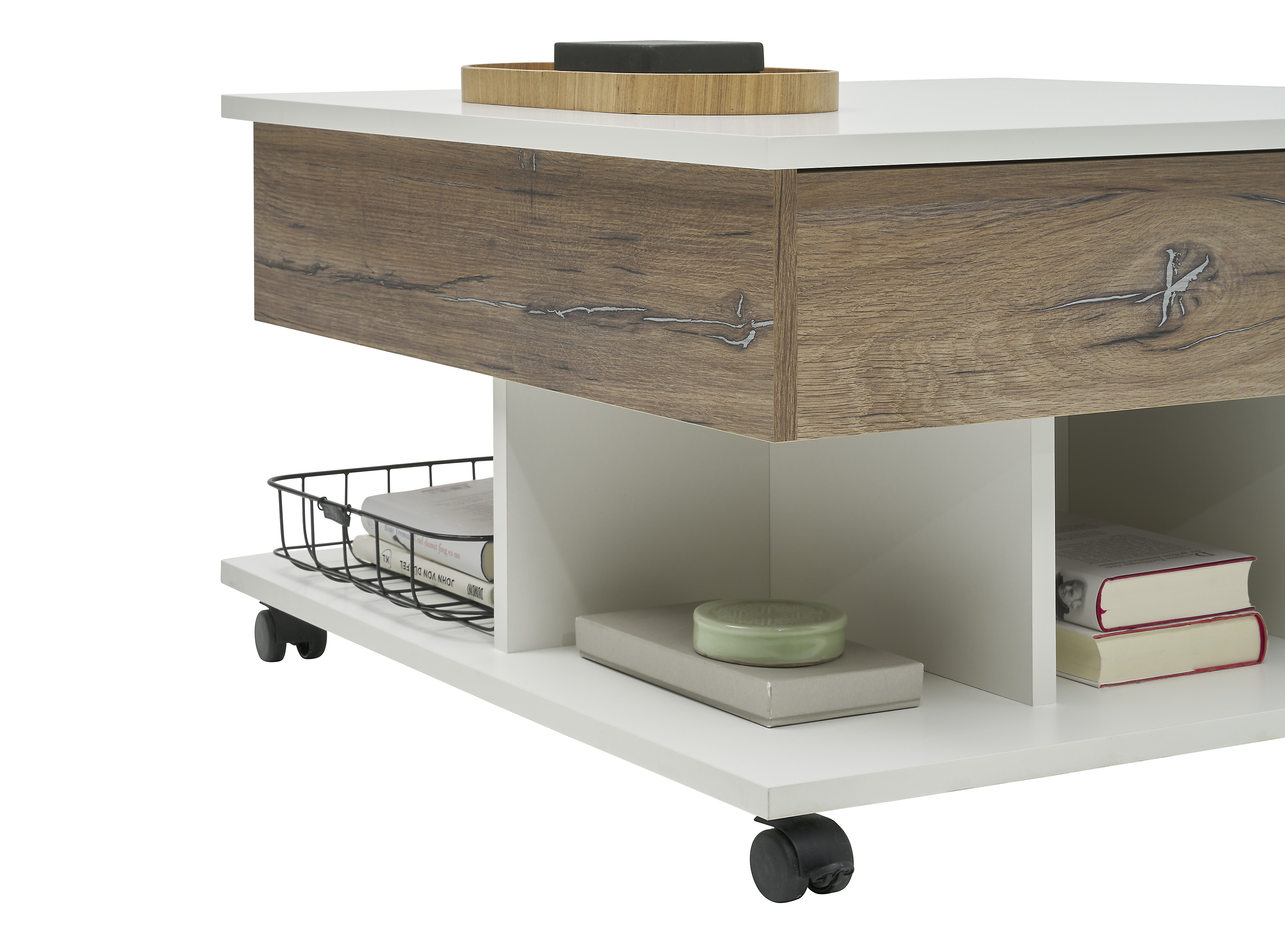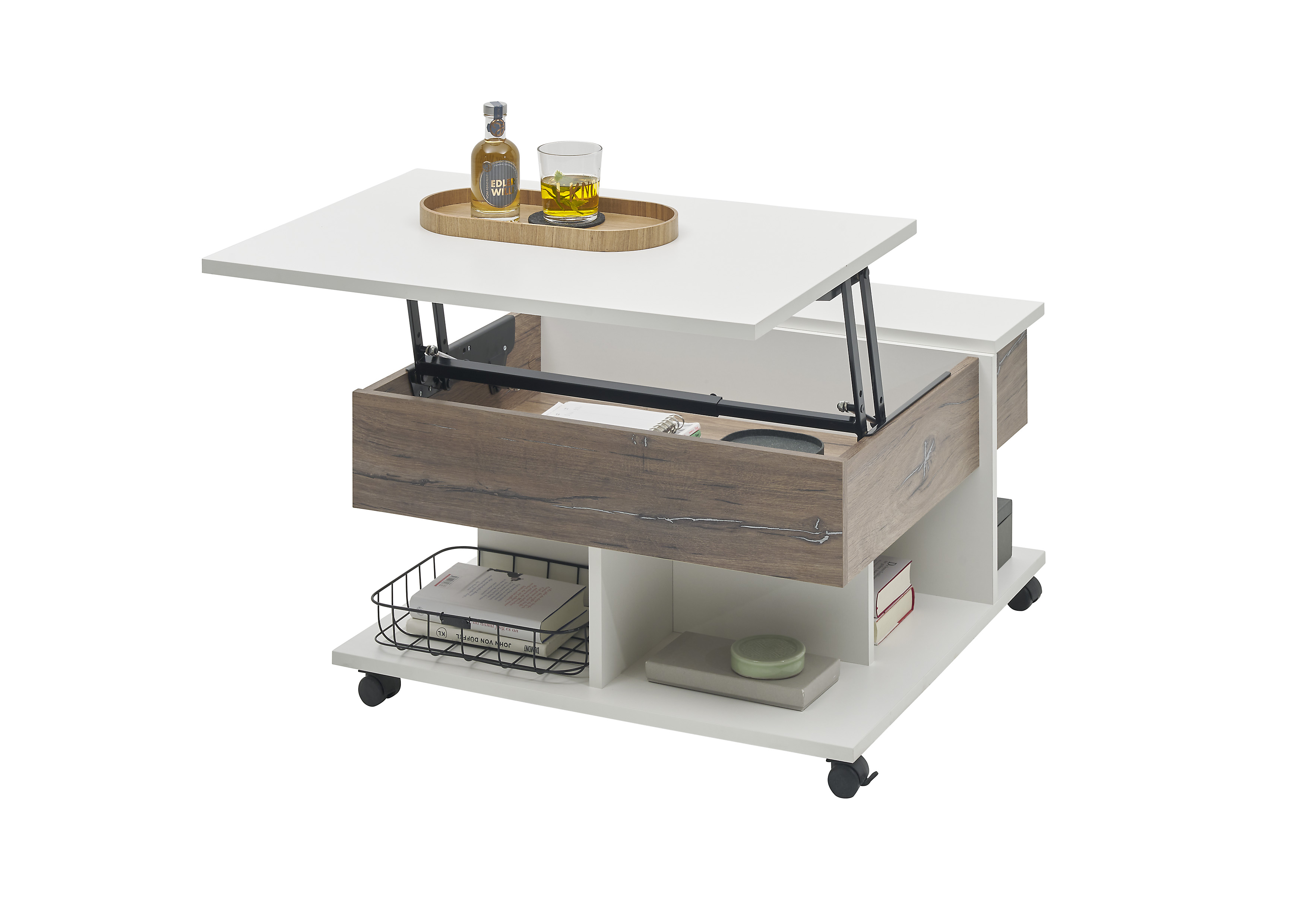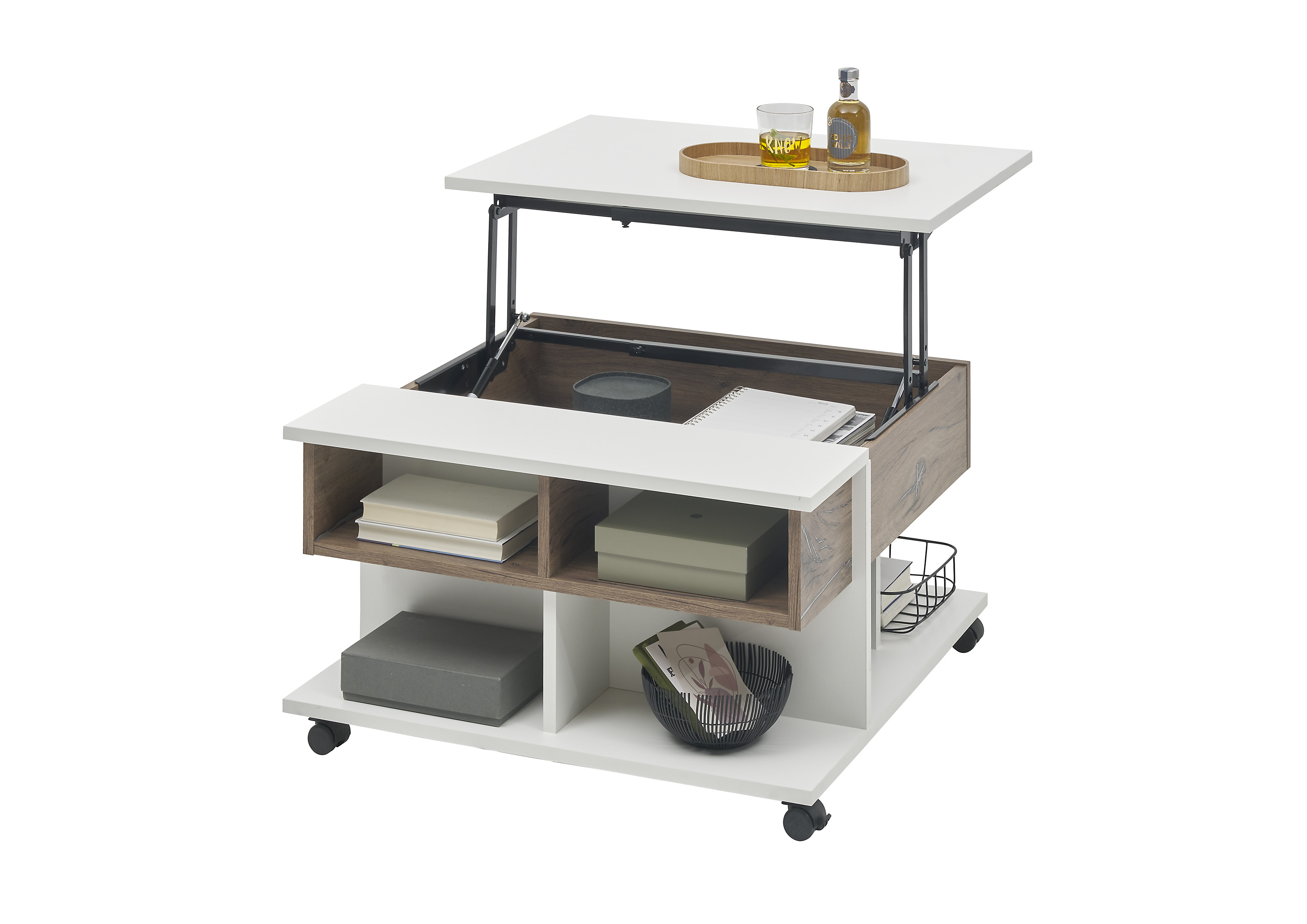 La table basse Helen est une table basse polyvalente et fonctionnelle avec un plateau réglable en hauteur (44-67 cm) et quatre roulettes maniables, idéale pour une utilisation flexible dans le salon.