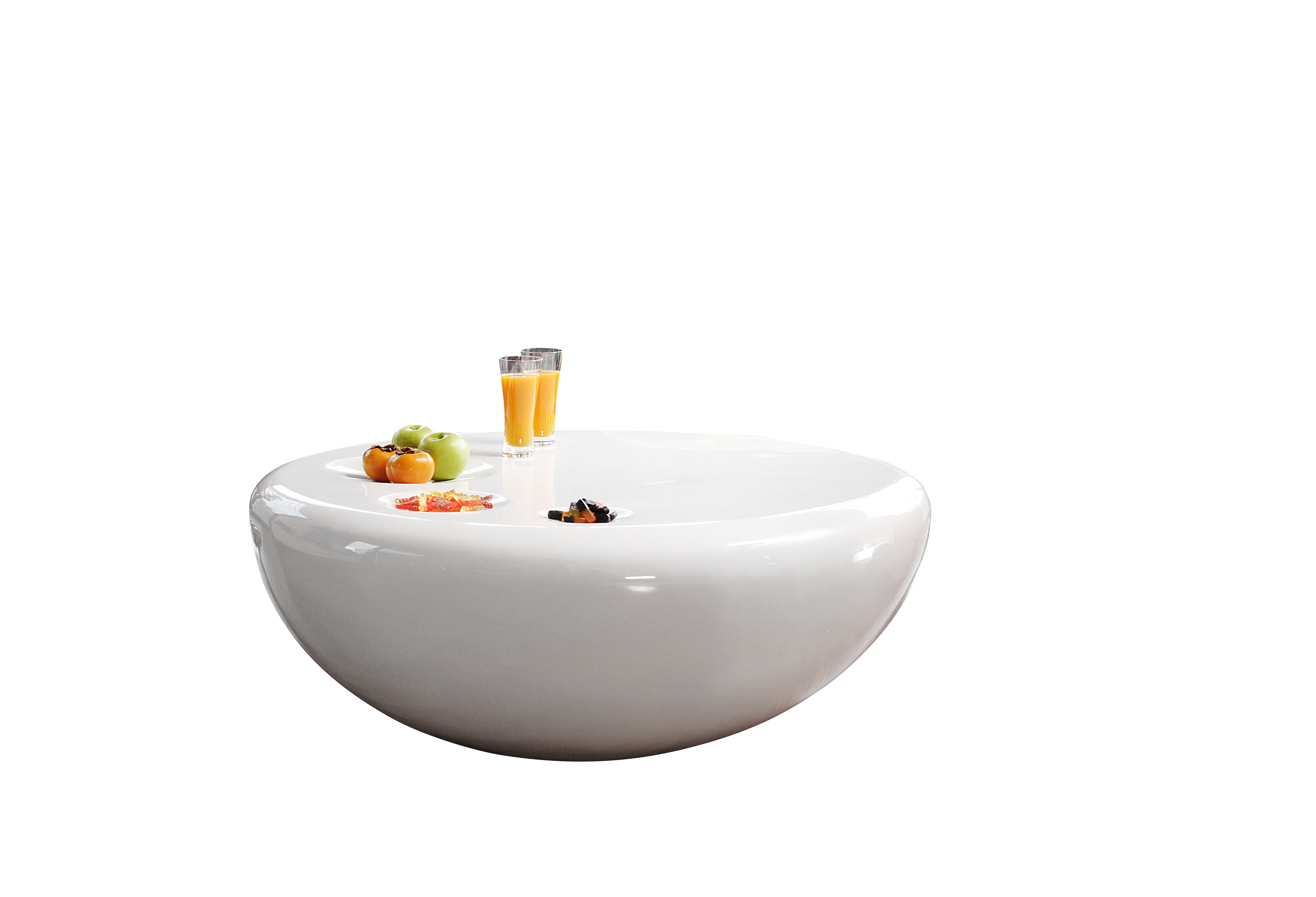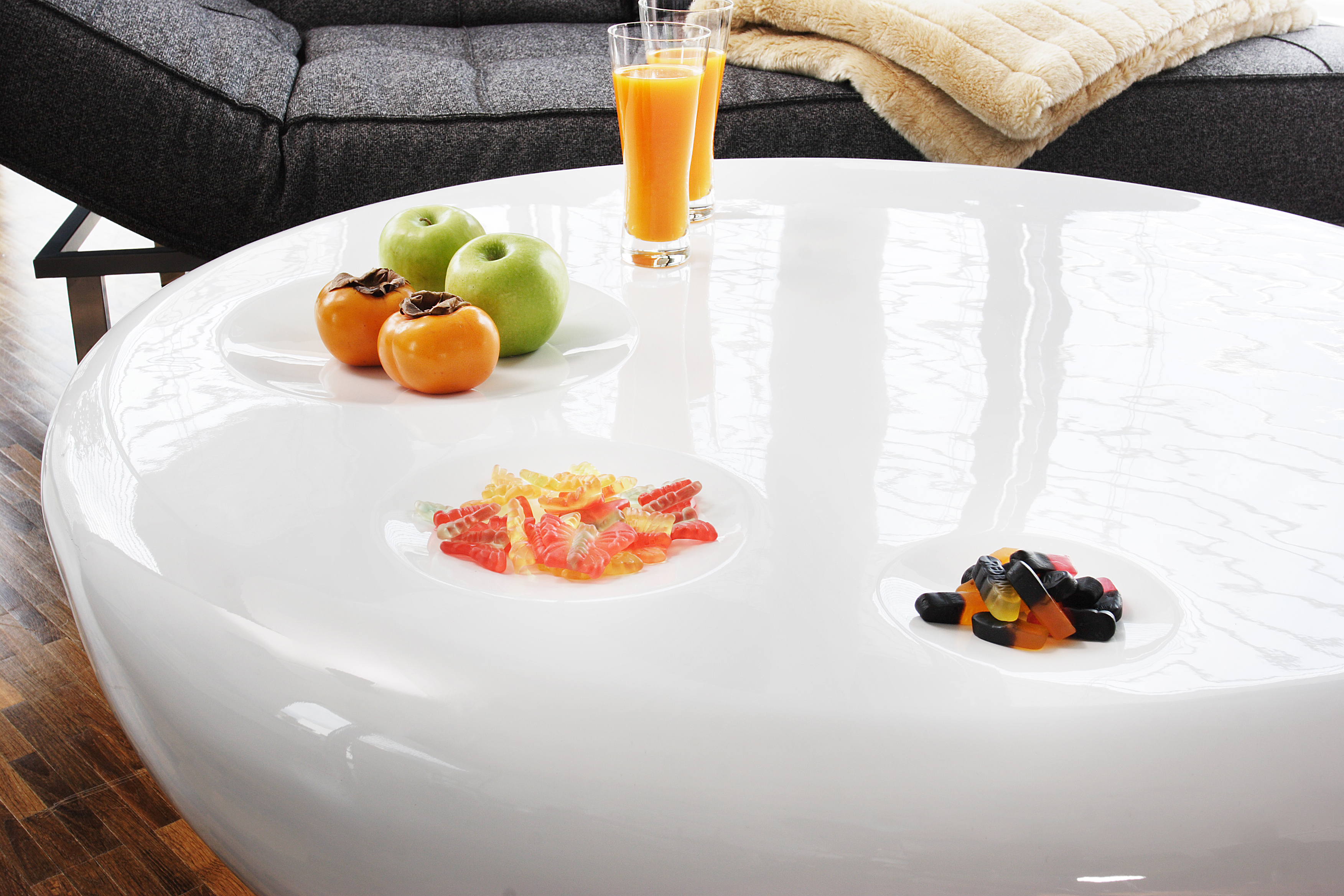 Retour aux années 70 ! Cette table basse ronde séduit par son look rétro. La table basse est entièrement fabriquée en fibre de verre laquée ton blanc ultra brillant. Ce petit bijou de design attire immédiatement le regard par sa forme originale. Mais l’aspect pratique n’a pas été négligé pour autant. Le plateau comporte trois cavités qui peuvent être utilisées pour y déposer des fruits ou des snacks. Avec un diamètre de 100 cm, elle offre également suffisamment de place pour les magazines ou les télécommandes. Grâce à sa forme ronde, vous ne risquez pas de vous cogner dans les coins.