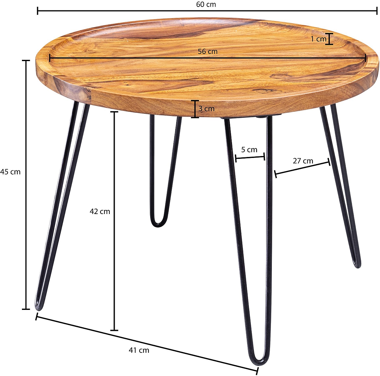 - MATÉRIAUX ✔ Le plateau de la table de salon est en bois massif de sheesham, qui est en outre recouvert d’un vernis protecteur transparent. Les pieds filaires en forme d’épingle à cheveux sont en inox thermolaqué.