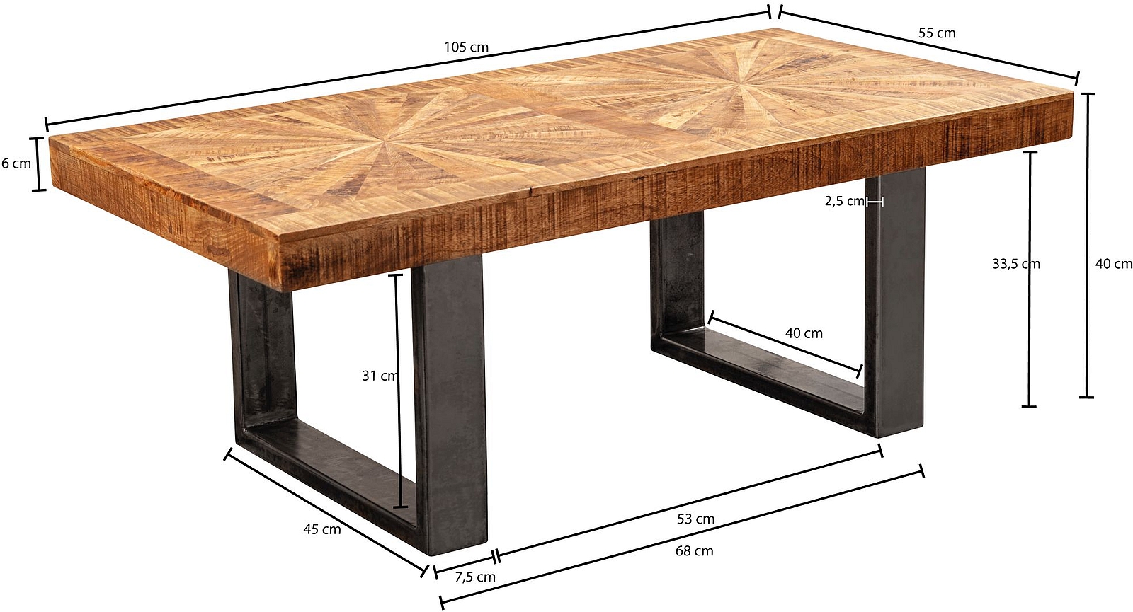 - MATÉRIAUX ✔ Le plateau de la table basse est en bois naturel de manguier. Les pieds sont en fer laqué.
