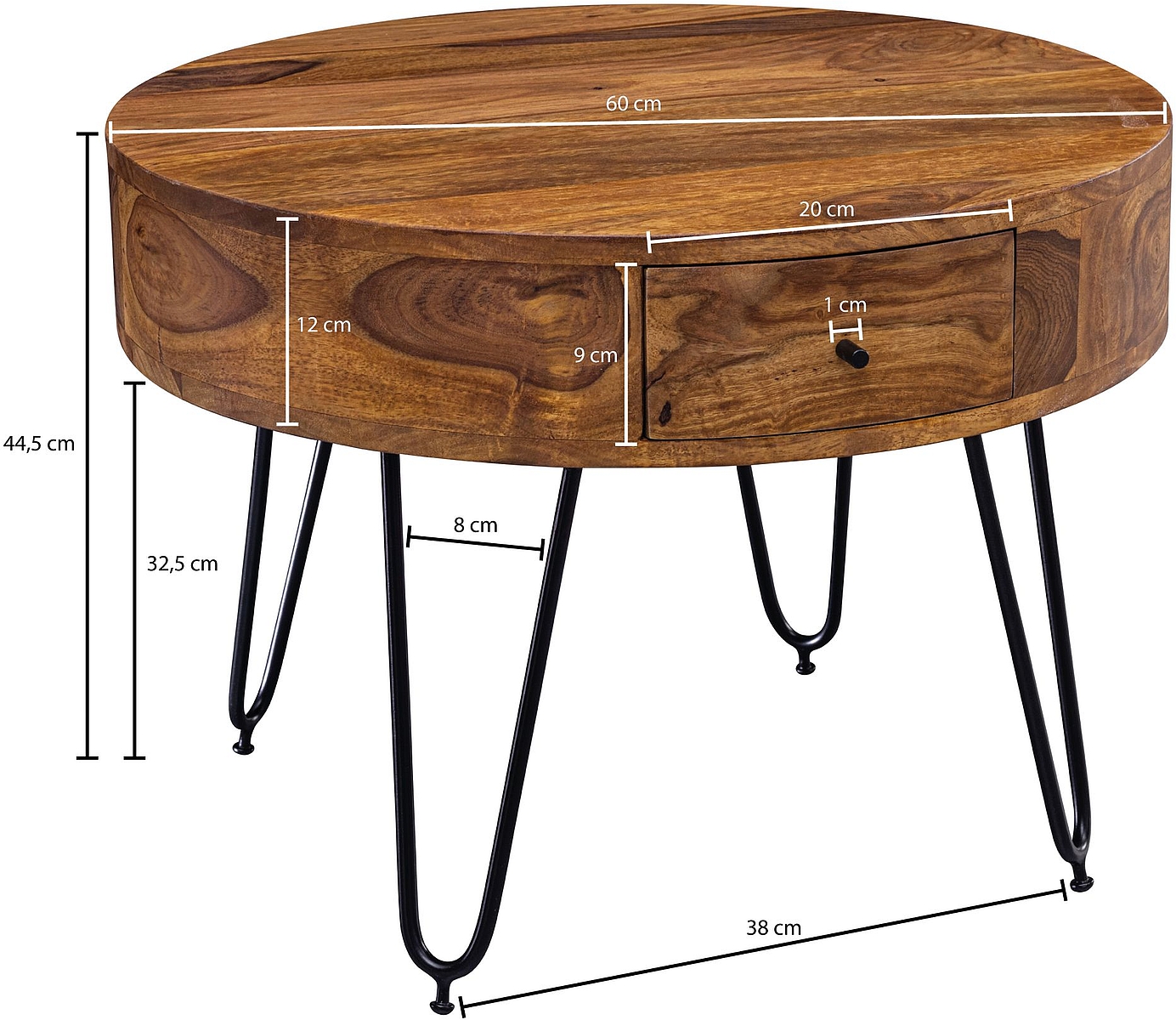 - SUPER TENDANCE ✔ Le point central de votre salon doit être non seulement utile mais aussi élégant. Fidèle à cette devise, notre table en bois fait mouche ! Deux tiroirs pratiques accueilleront vos magazines TV, la télécommande et d’autres accessoires - pour tout garder en ordre. Les chips, le popcorn et les boissons trouveront leur place sur le plateau rond massive pendant votre soirée cinéma. Celle-ci est soutenue par des pieds filaires en forme d’épingle à cheveux.