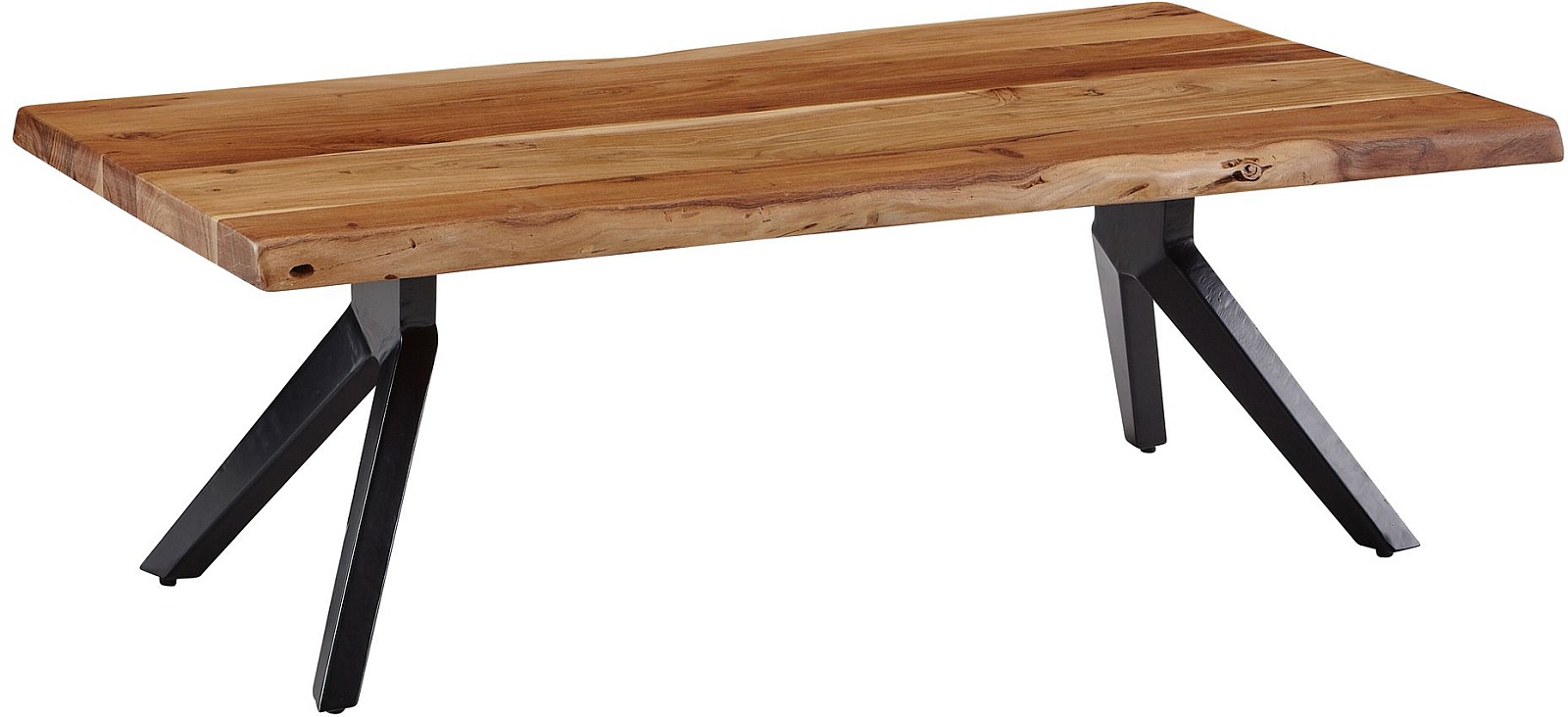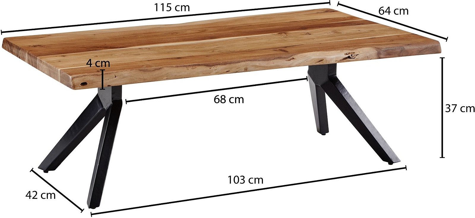 UN MODÈLE RUSTIQUE AVEC L'AMOUR DE LA NATURE ✔ Cette table de salon en bois massif séduit par son design particulier et associe un aspect rustique à des traits modernes. Le piètement en métal thermolaqué garantit une excellente stabilité. Une attention particulière est portée au plateau de table avec de superbes chants aspect flache et au veinage original du bois de cette pièce unique.