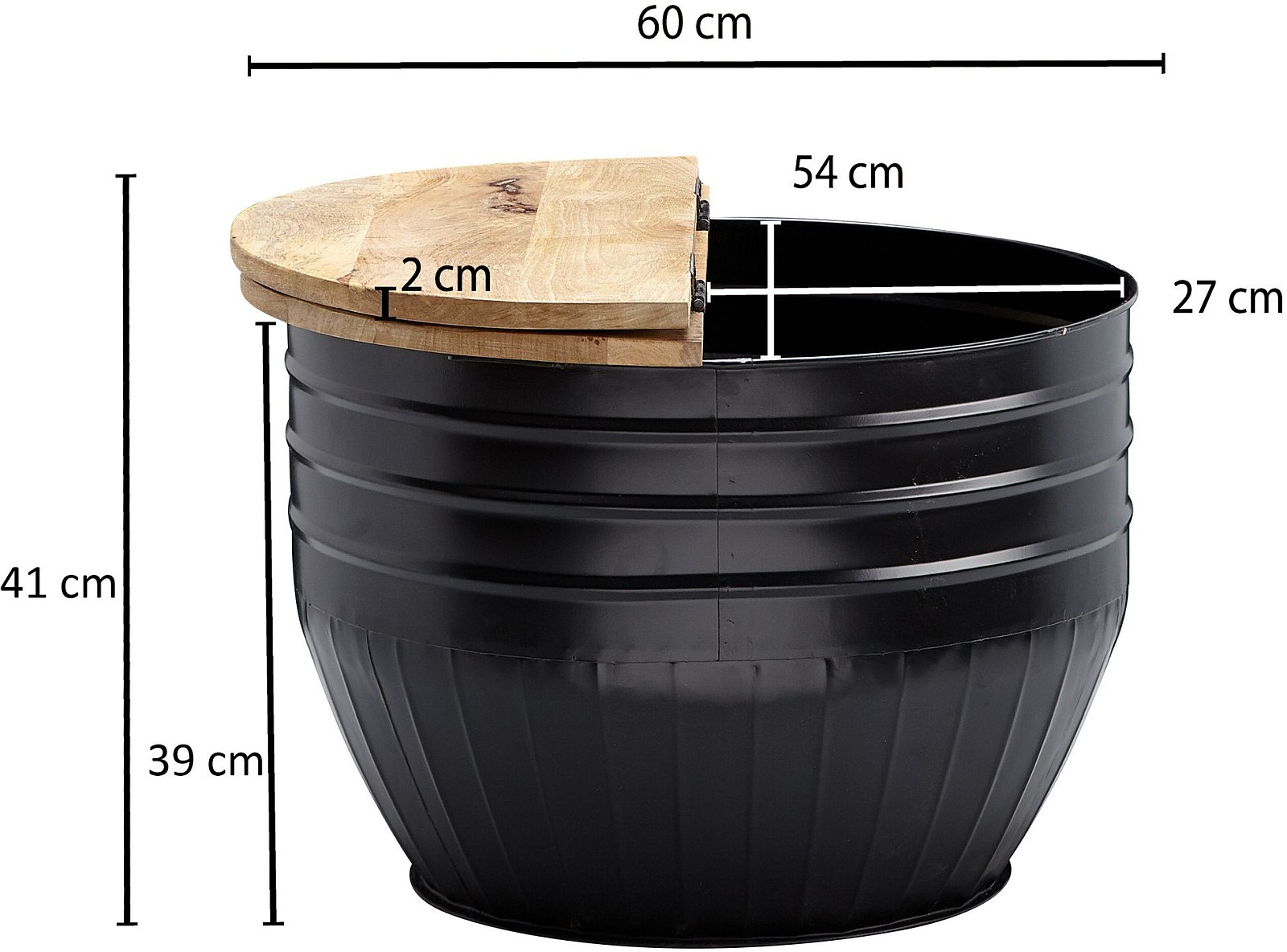 DIMENSIONS ✔ Largeur : 60 cm // Hauteur : 41 cm // Profondeur : 60 cm // Hauteur du coffre de rangement : 39 cm // Dimensions de l'ouverture (LxP) : 54 x 27 cm // Épaisseur plateau de table : env. 2 cm // Vous trouverez d'autres dimensions sur l'image correspondante.