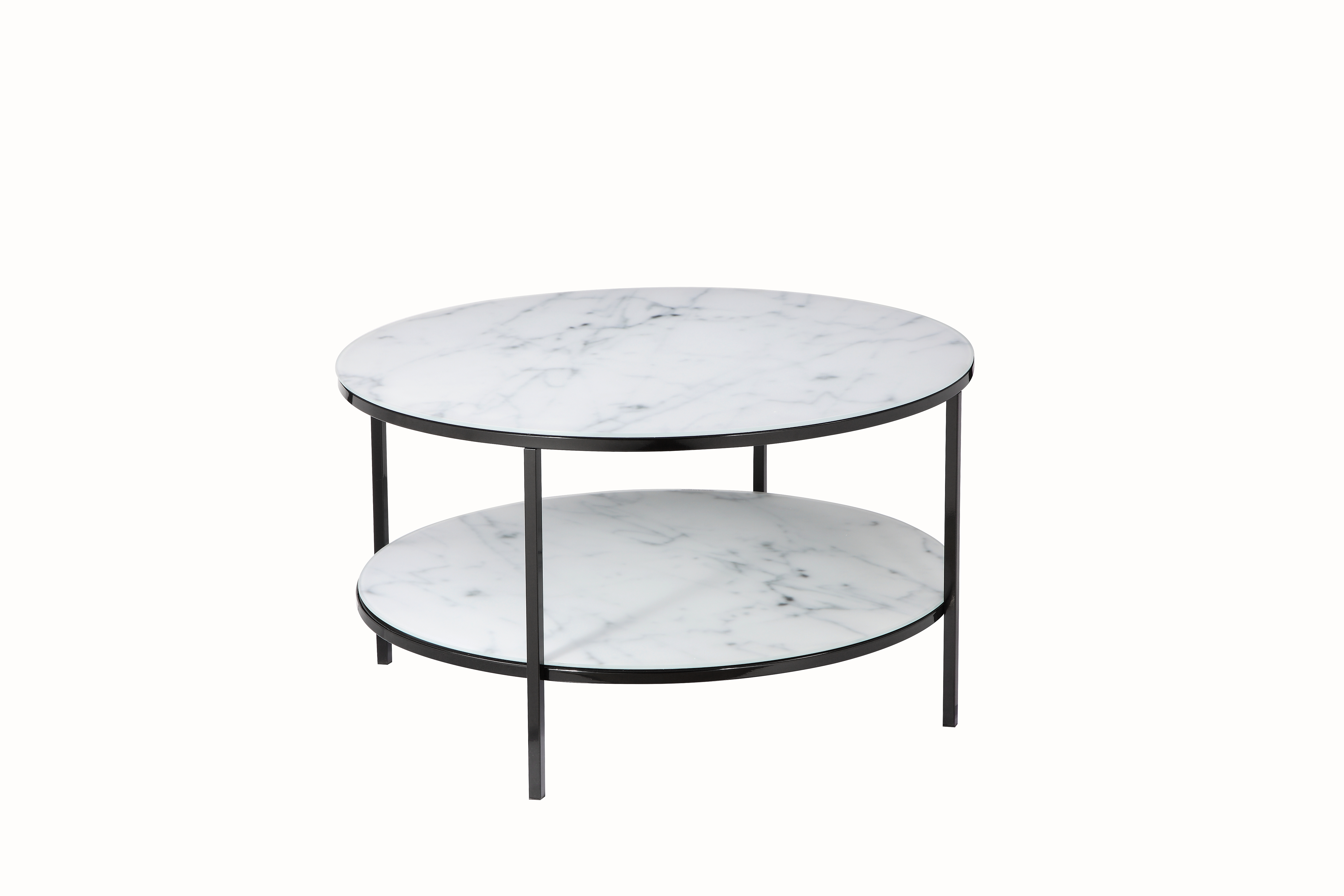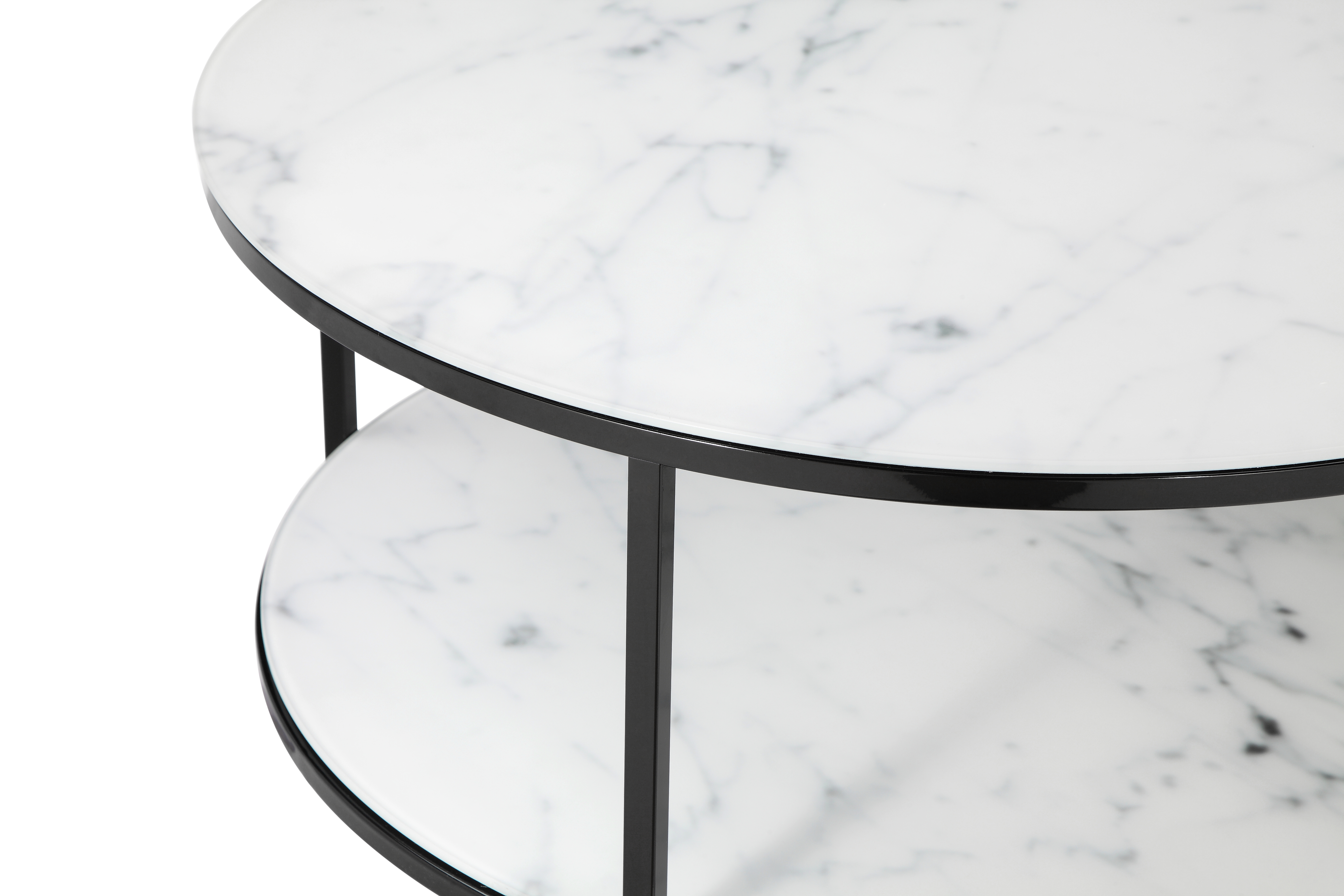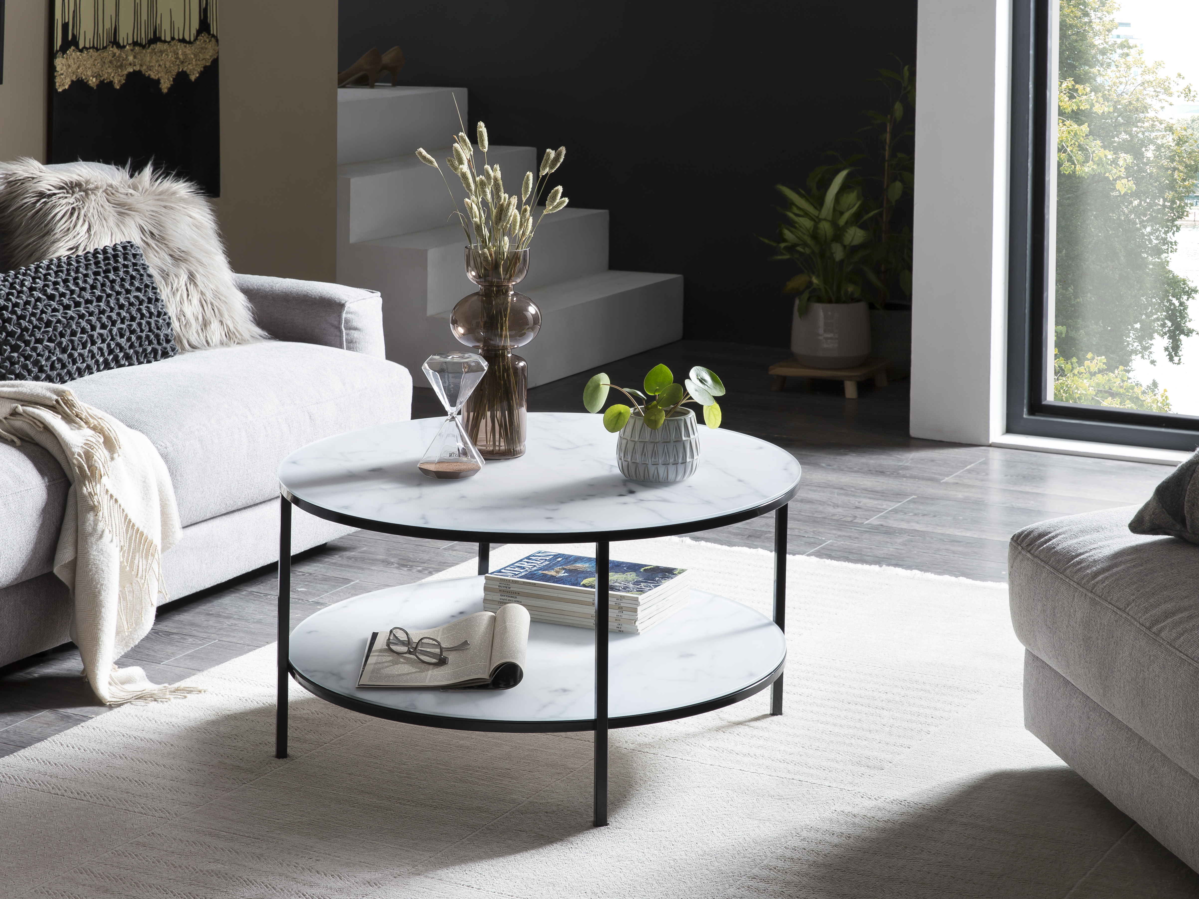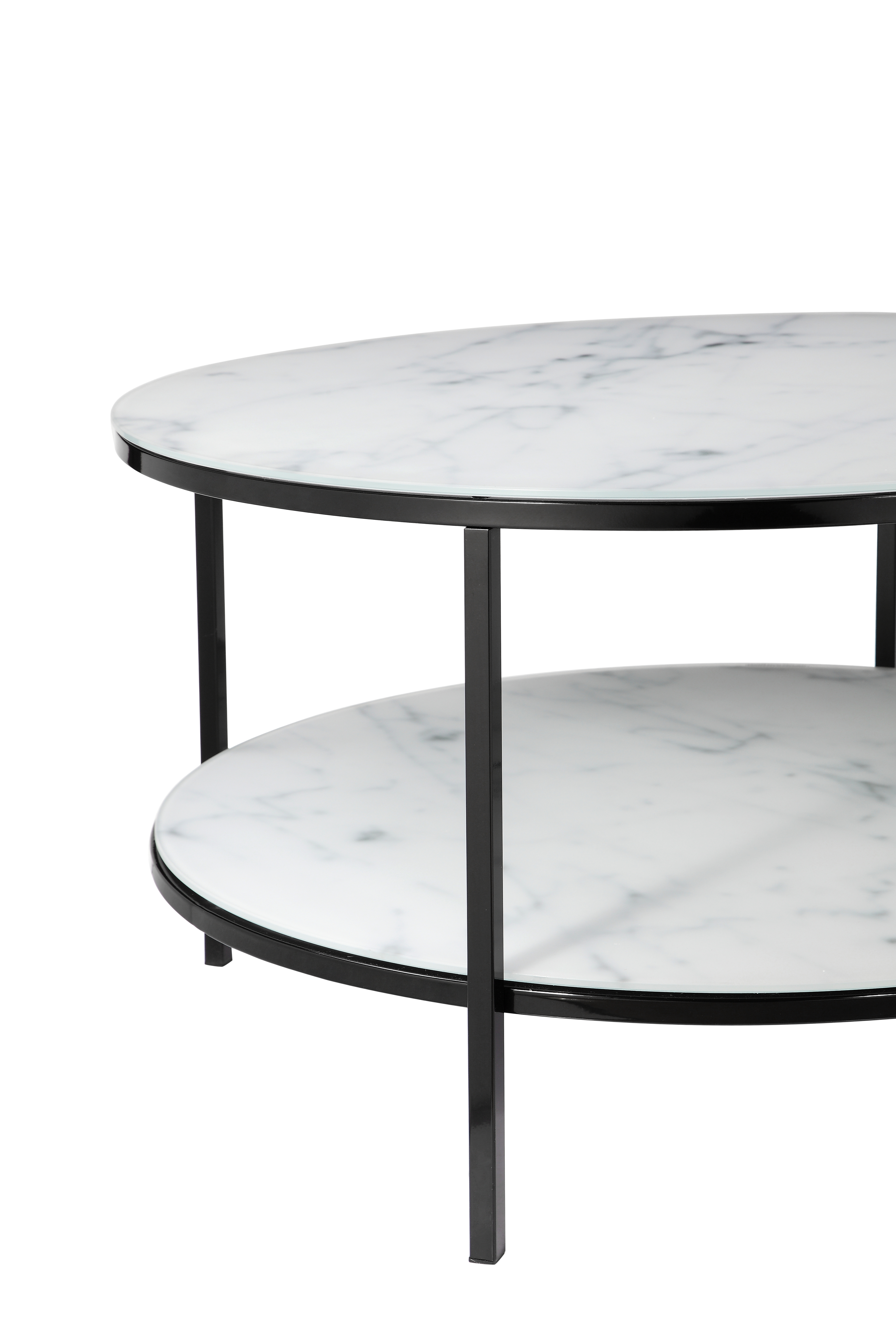 Cette table basse ronde combine un design moderne avec une touche d’extravagance. Le plateau en verre recouvert d'un film aspect marbre par le dessous se marie parfaitement avec le piètement en métal ton noir. La table basse comprend 2 épais plateaux en verre qui offrent suffisamment d’espace de rangement pour des magazines, des fruits, des snacks ou un vase de fleurs par exemple. Grâce à son design attrayant, cette table basse peut être combinée avec de nombreux meubles et trouvera également sa place dans votre intérieur.