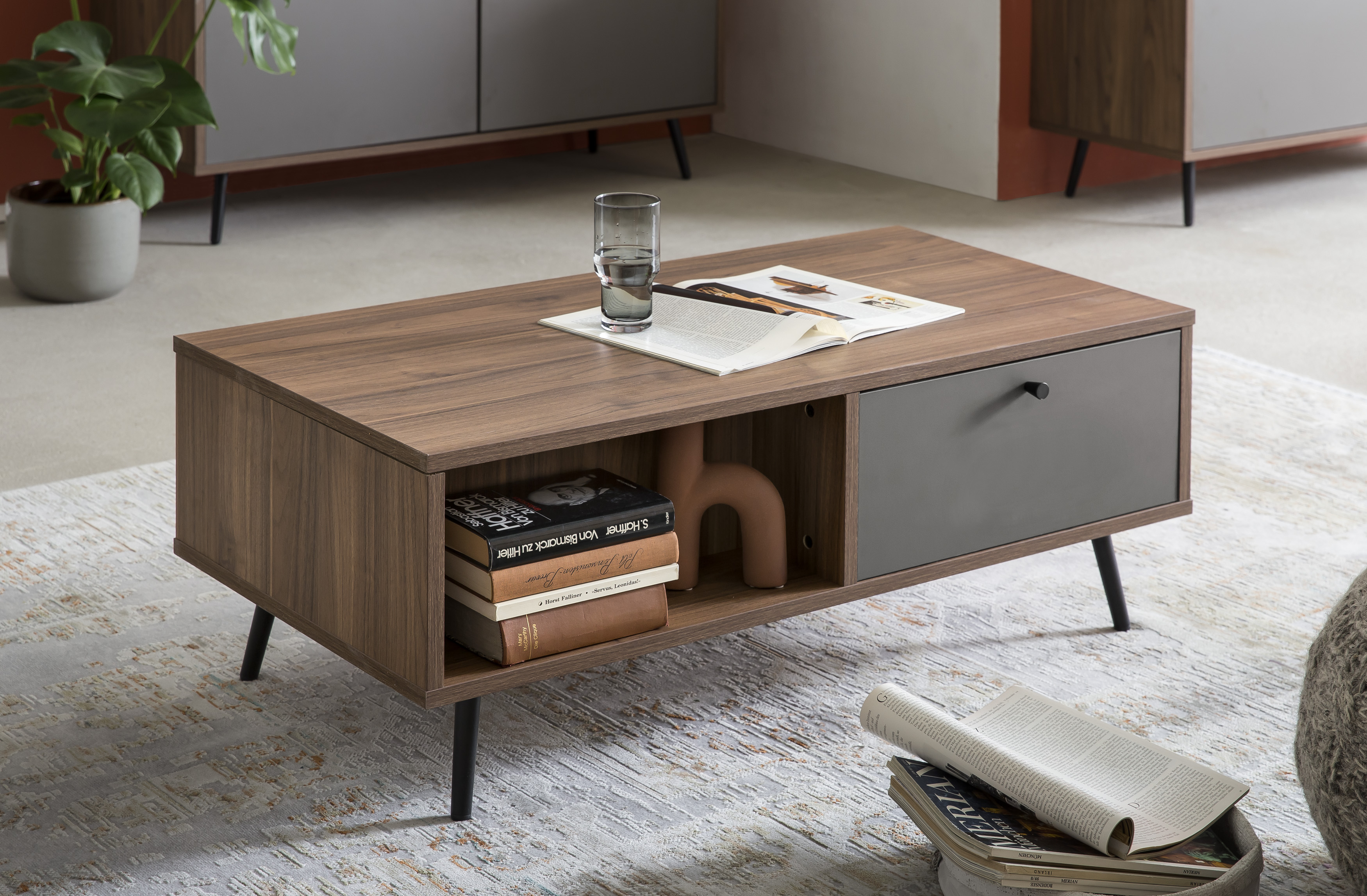 Le design aux lignes droites de cette table basse associe bois MDF ton noyer et ton gris avec des pieds en métal laqué ton noir mat. La table basse offre un grand espace de rangement avec un casier ouvert et un tiroir pour les télécommandes, les magazines et autres. Le plateau supérieur peut accueillir des fleurs, des coupes de fruits ou d’autres objets de décoration. Les pieds en métal ton noir mat assurent une bonne stabilité. Une table parfaite pour une agréable soirée télé. Ce meuble chic peut s’intégrer dans n’importe quel salon grâce à son style épuré, mais il reste toujours le point de mire. Cette table basse est tout simplement le complément idéal pour votre intérieur !