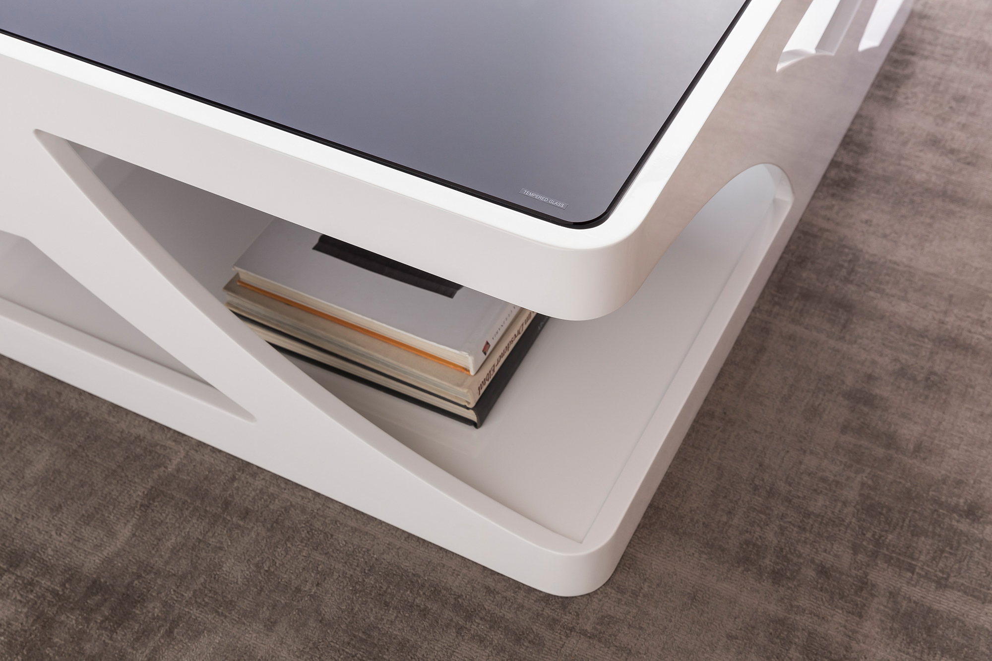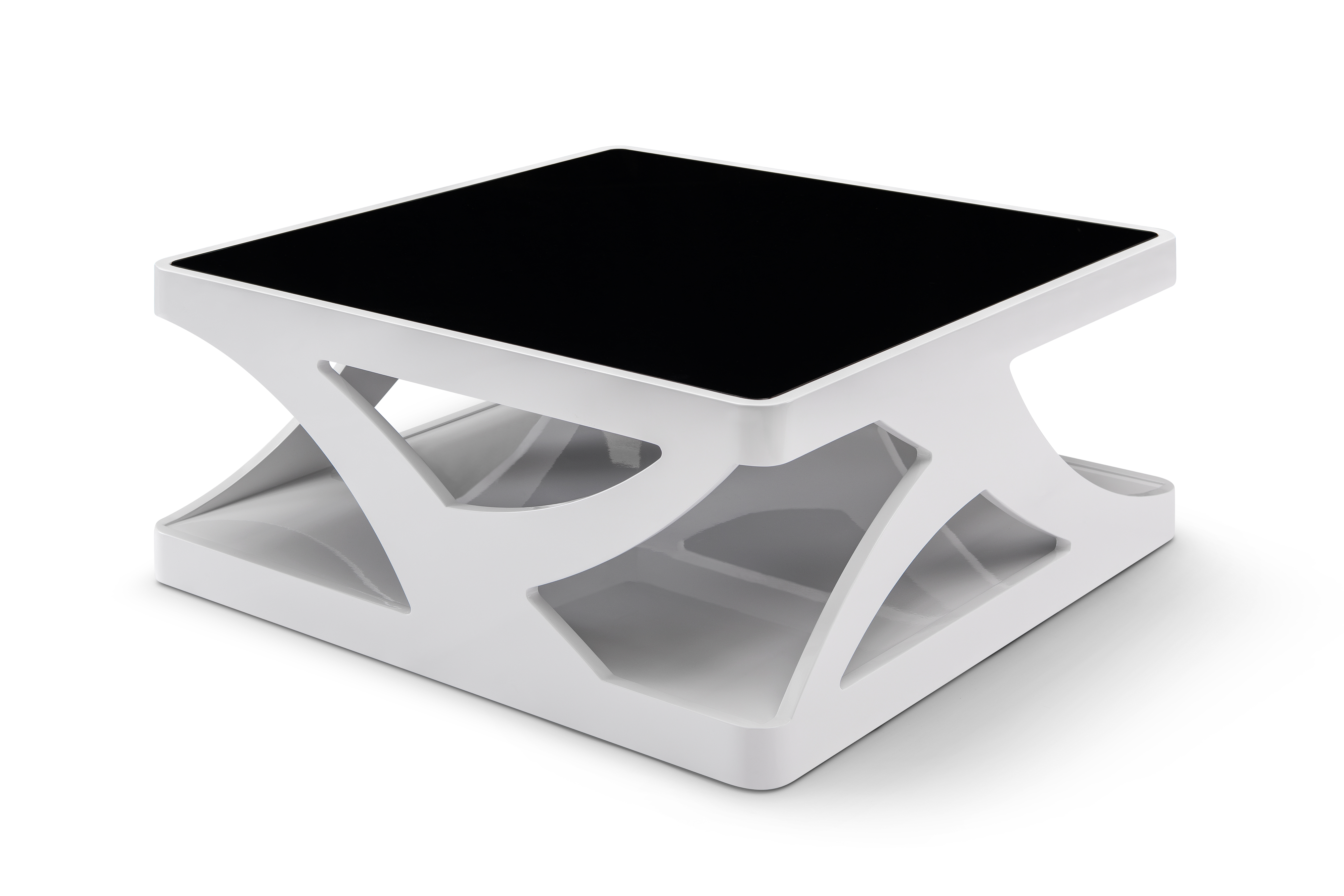 Cette table basse carrée associe un design moderne avec une touche d’extravagance. La table est entièrement fabriquée en MDF laqué ton blanc ultra brillant. Le plateau en verre d’une épaisseur de 10 mm ton noir est fabriqué en verre de sécurité. Ce petit bijou surprend tout d'abord par son design unique, mais le côté pratique n'a pas été oublié dans la fabrication. Ce modèle offre ainsi suffisamment d’espace de rangement pour les magazines, télécommandes, téléphones portables, etc. Des fleurs fraîches trouveront leur place sur le plateau.